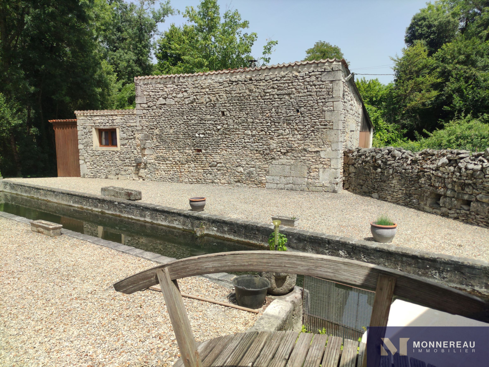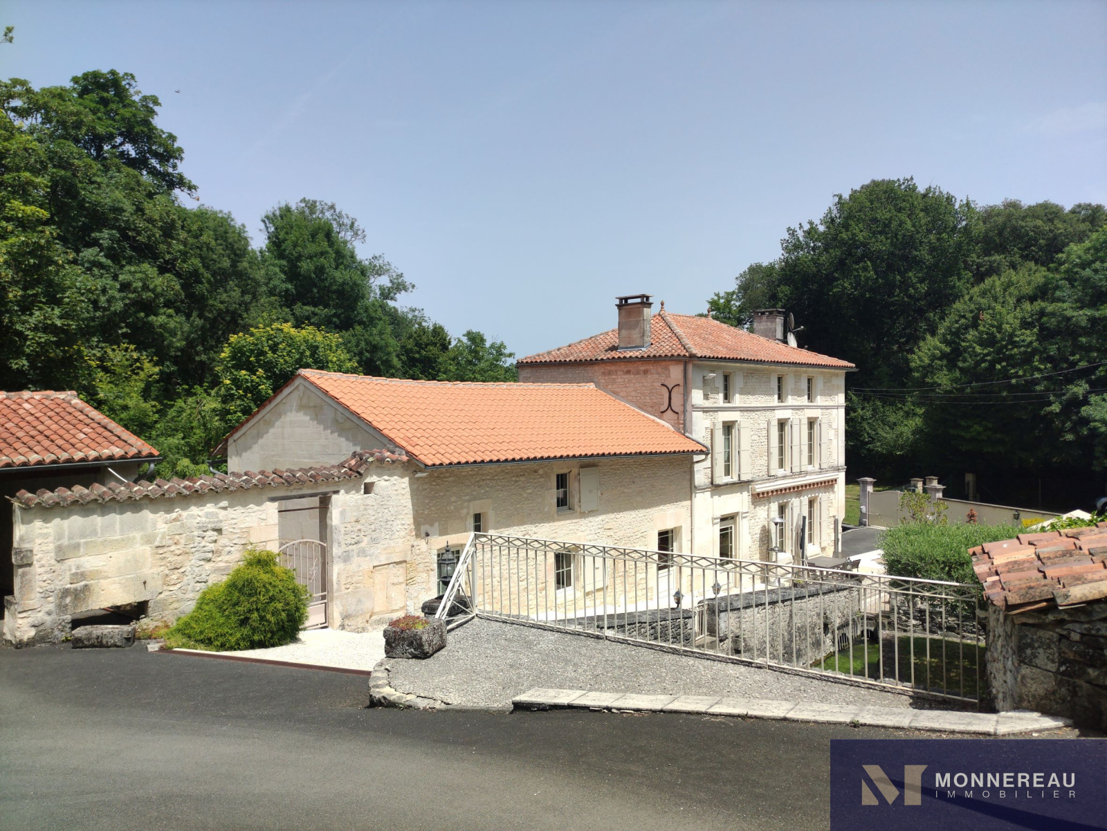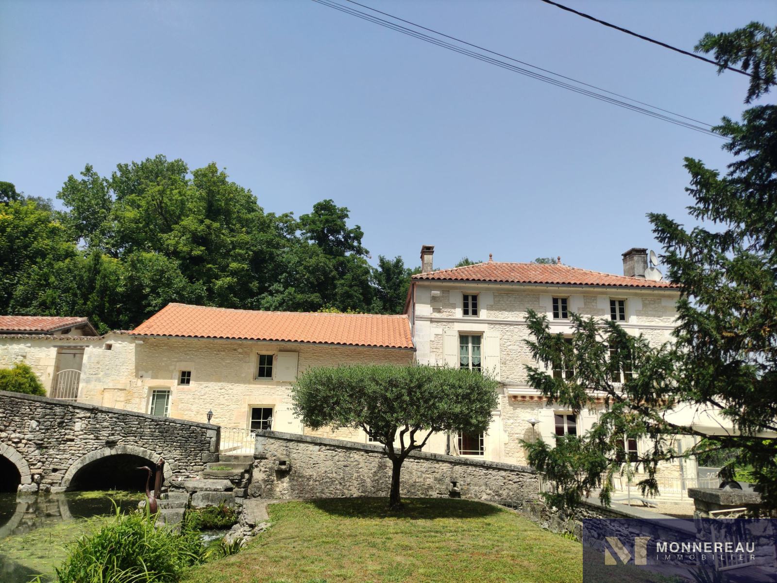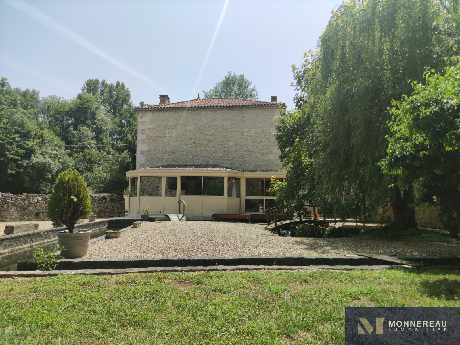 10 min Sud COGNAC (16) - Dans un environnement privilégié, verdoyant et intime. Belle maison en pierre d'environ 240m² habitables édifiée sur un terrain d'environ 2690m². Elle est exposée plein sud sur sa façade principale. La maison profite d'une atmosphère particulière grâce aux éléments anciens du moulin. Agréable hall d'entrée avec cheminée, salle à manger de 33m², salon de 35m² avec parquets anciens. Une cuisine très lumineuse se love dans la véranda sur la façade arrière. Elle offre une vue sur le bief et le bassin. A l'étage, un grand salon est orné d'éléments d'époque. Cet espace peut être transformé en chambre supplémentaire. En empruntant la passerelle de la mezzanine, vous découvrirez une chambre avec salle d'eau, dressing. Autre chambre ou bureau. Au dernier étage, le grenier a été savament exploité en vaste chambre de 30m² avec salle d'eau. L'ensemble a été rénové avec soin avec de beaux matériaux. Les aménagements extérieurs sont très confortables: gravier lavé au sol, double carport, portails motorisés avec visiophone. Un garage en pierre a été réabilité en studio indépendant d'environ 50m². Le bief qui alimentaient le moulin autrefois et son île donnent beaucoup de charme aux lieux. Fraicheur, calme et confort aux portes de COGNAC.
