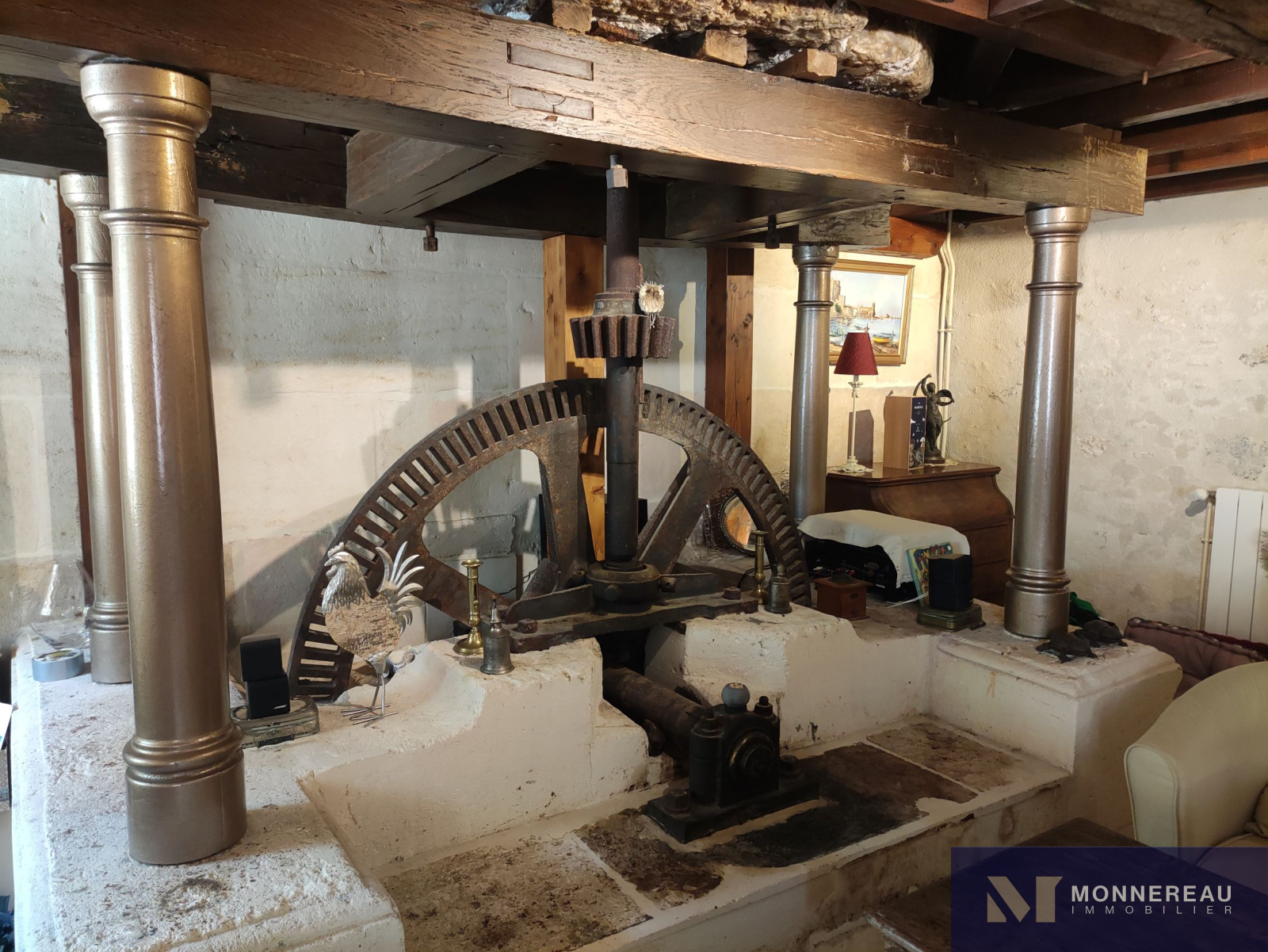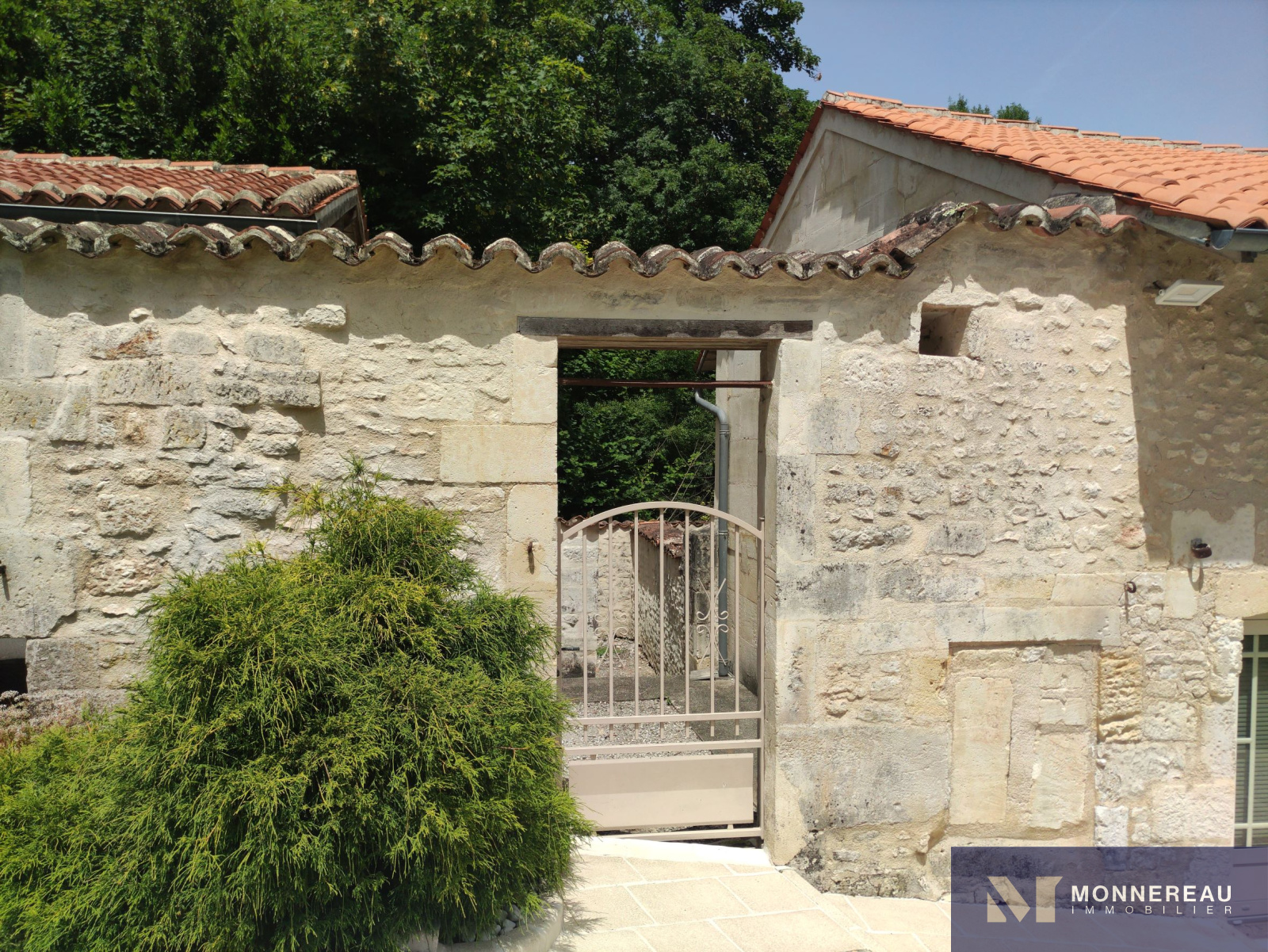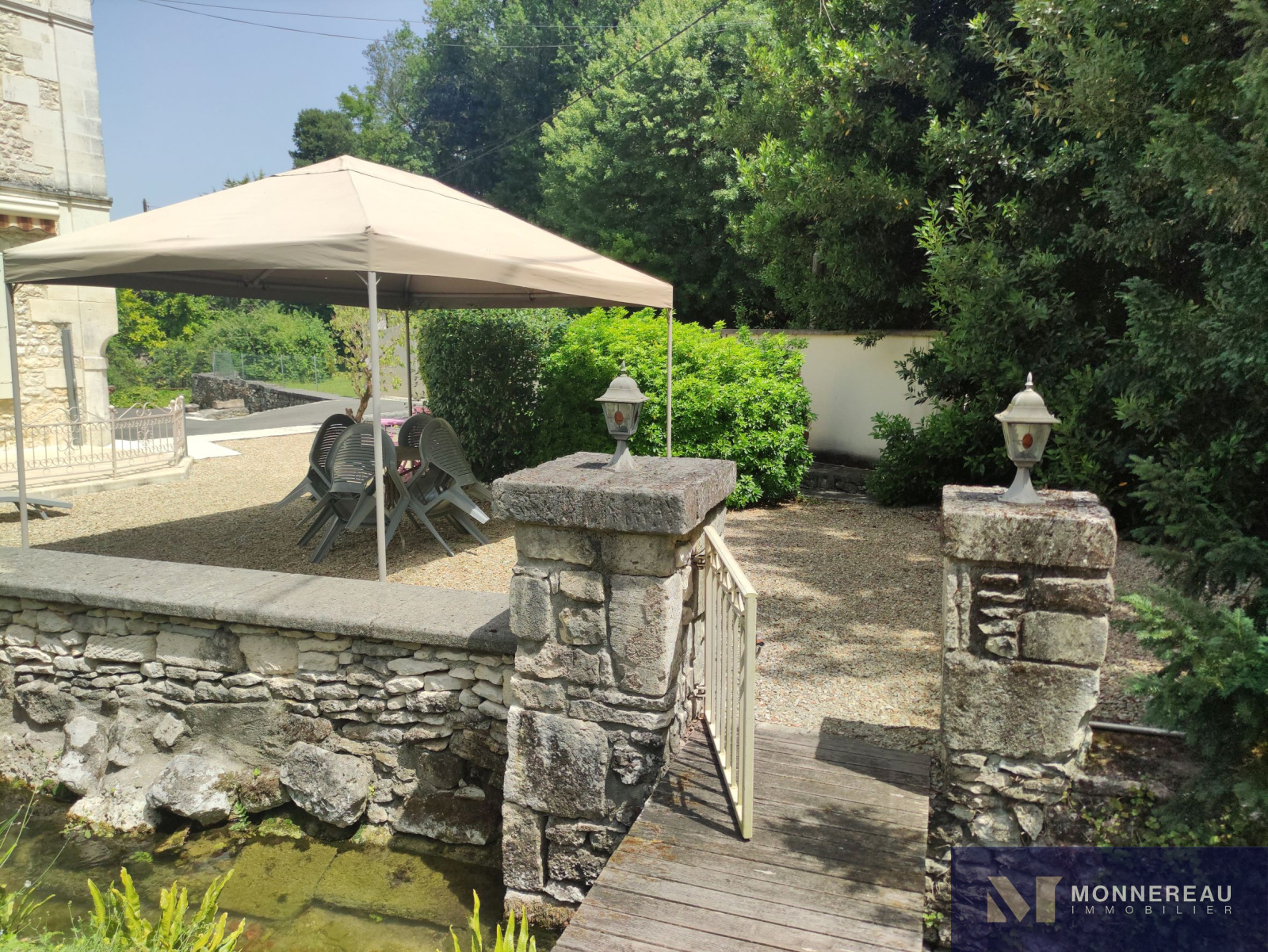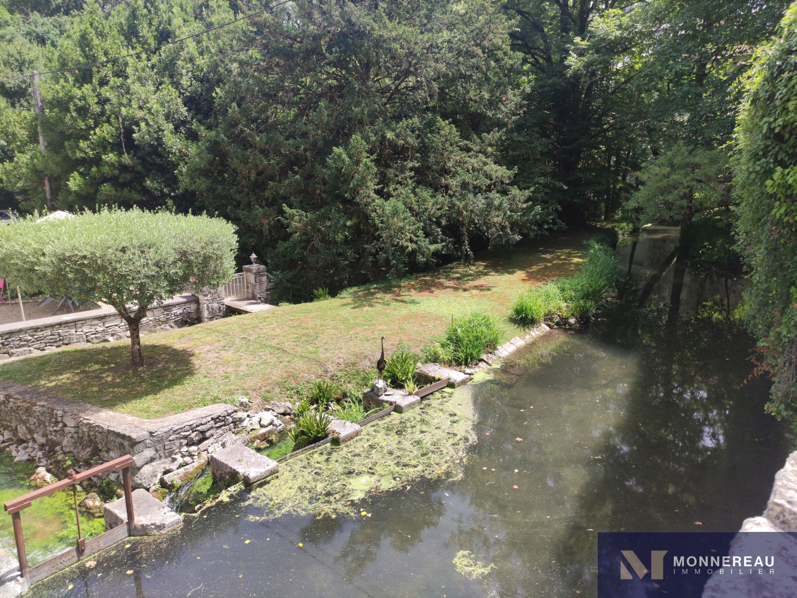 10 min Sud COGNAC (16) - Dans un environnement privilégié, verdoyant et intime. Belle maison en pierre d'environ 240m² habitables édifiée sur un terrain d'environ 2690m². Elle est exposée plein sud sur sa façade principale. La maison profite d'une atmosphère particulière grâce aux éléments anciens du moulin. Agréable hall d'entrée avec cheminée, salle à manger de 33m², salon de 35m² avec parquets anciens. Une cuisine très lumineuse se love dans la véranda sur la façade arrière. Elle offre une vue sur le bief et le bassin. A l'étage, un grand salon est orné d'éléments d'époque. Cet espace peut être transformé en chambre supplémentaire. En empruntant la passerelle de la mezzanine, vous découvrirez une chambre avec salle d'eau, dressing. Autre chambre ou bureau. Au dernier étage, le grenier a été savament exploité en vaste chambre de 30m² avec salle d'eau. L'ensemble a été rénové avec soin avec de beaux matériaux. Les aménagements extérieurs sont très confortables: gravier lavé au sol, double carport, portails motorisés avec visiophone. Un garage en pierre a été réabilité en studio indépendant d'environ 50m². Le bief qui alimentaient le moulin autrefois et son île donnent beaucoup de charme aux lieux. Fraicheur, calme et confort aux portes de COGNAC.