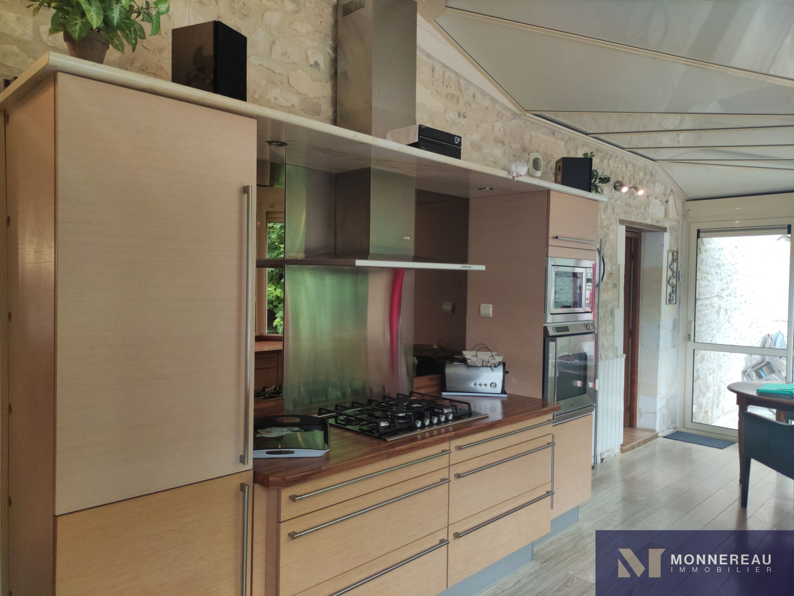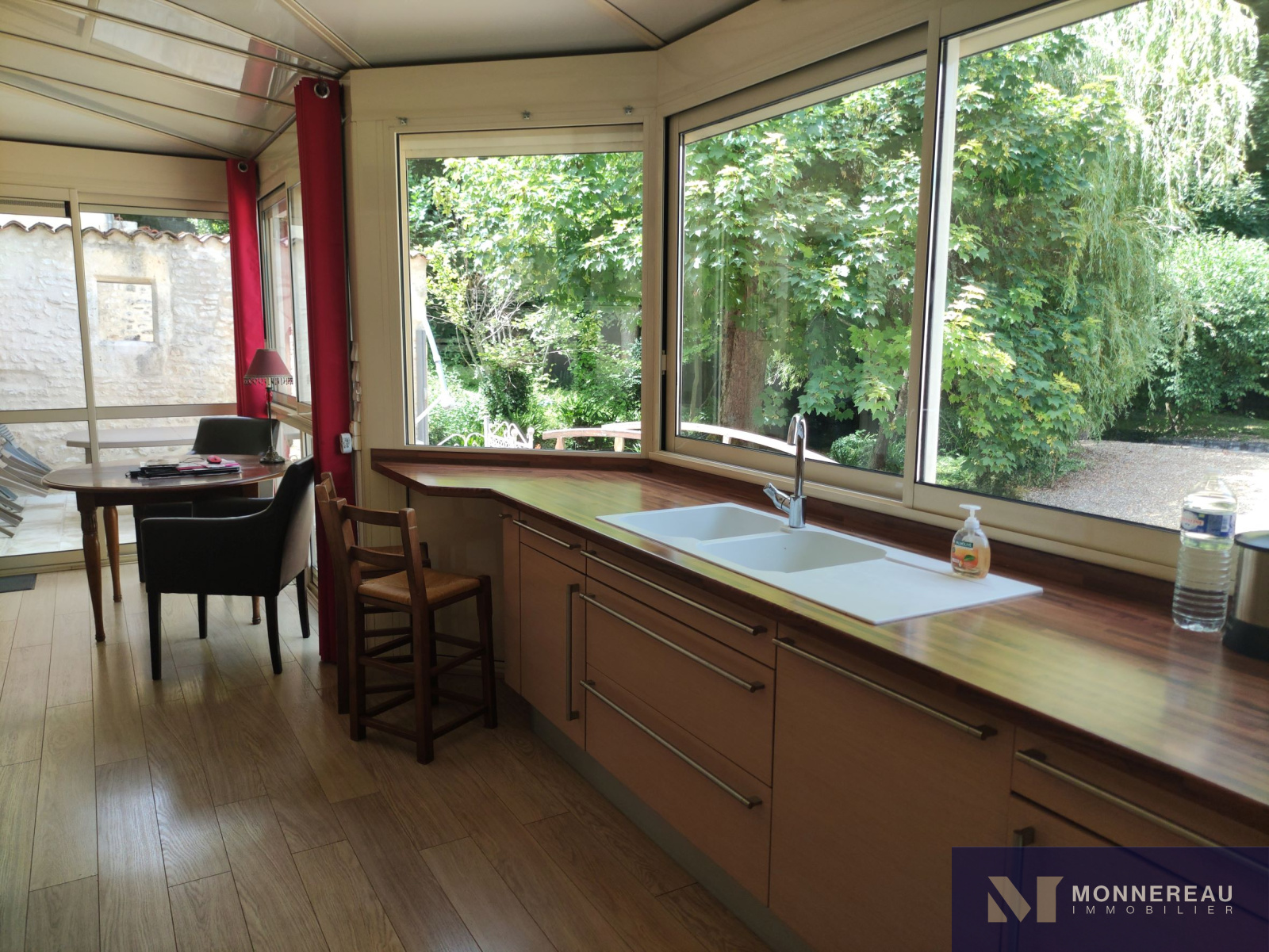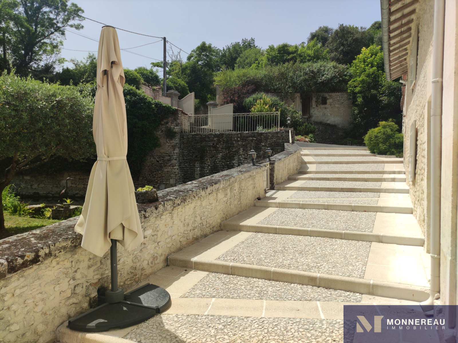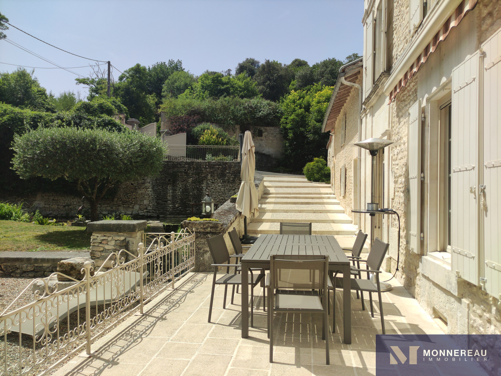 10 min Sud COGNAC (16) - Dans un environnement privilégié, verdoyant et intime. Belle maison en pierre d'environ 240m² habitables édifiée sur un terrain d'environ 2690m². Elle est exposée plein sud sur sa façade principale. La maison profite d'une atmosphère particulière grâce aux éléments anciens du moulin. Agréable hall d'entrée avec cheminée, salle à manger de 33m², salon de 35m² avec parquets anciens. Une cuisine très lumineuse se love dans la véranda sur la façade arrière. Elle offre une vue sur le bief et le bassin. A l'étage, un grand salon est orné d'éléments d'époque. Cet espace peut être transformé en chambre supplémentaire. En empruntant la passerelle de la mezzanine, vous découvrirez une chambre avec salle d'eau, dressing. Autre chambre ou bureau. Au dernier étage, le grenier a été savament exploité en vaste chambre de 30m² avec salle d'eau. L'ensemble a été rénové avec soin avec de beaux matériaux. Les aménagements extérieurs sont très confortables: gravier lavé au sol, double carport, portails motorisés avec visiophone. Un garage en pierre a été réabilité en studio indépendant d'environ 50m². Le bief qui alimentaient le moulin autrefois et son île donnent beaucoup de charme aux lieux. Fraicheur, calme et confort aux portes de COGNAC.