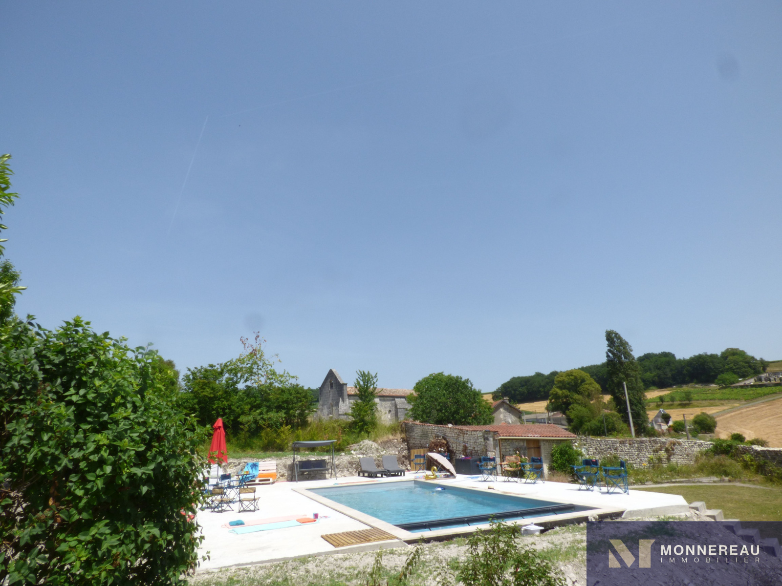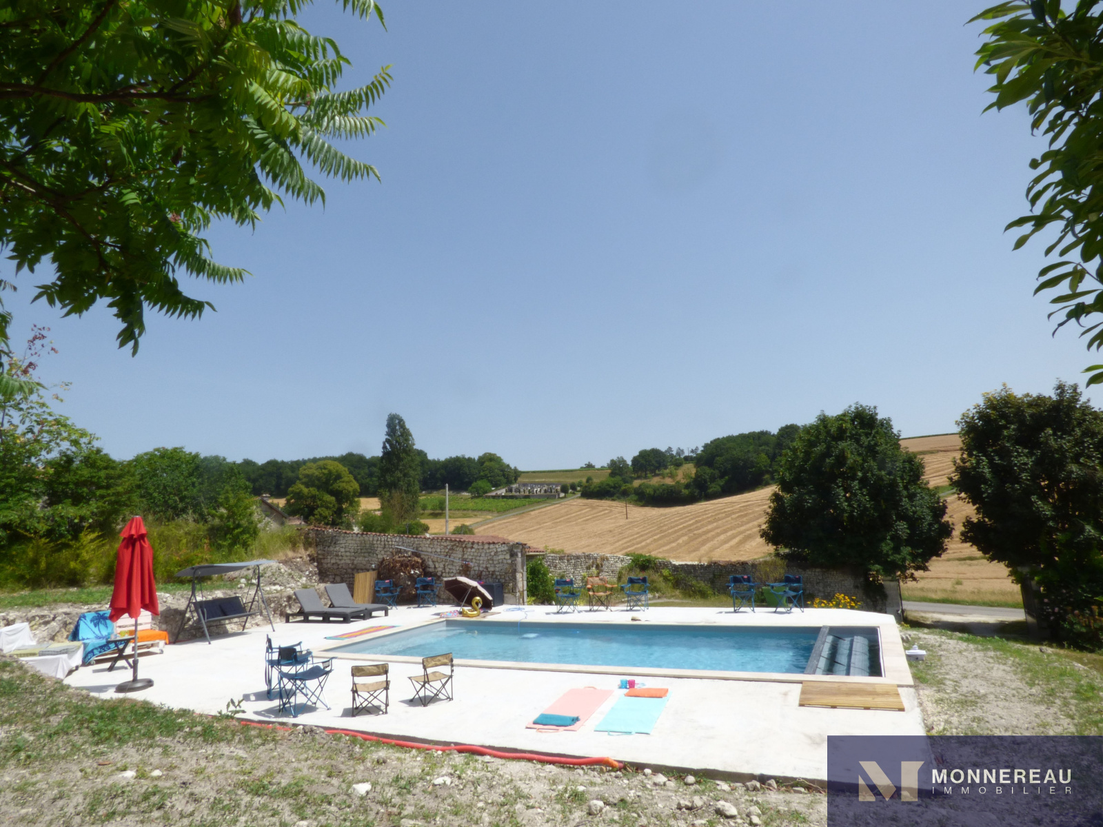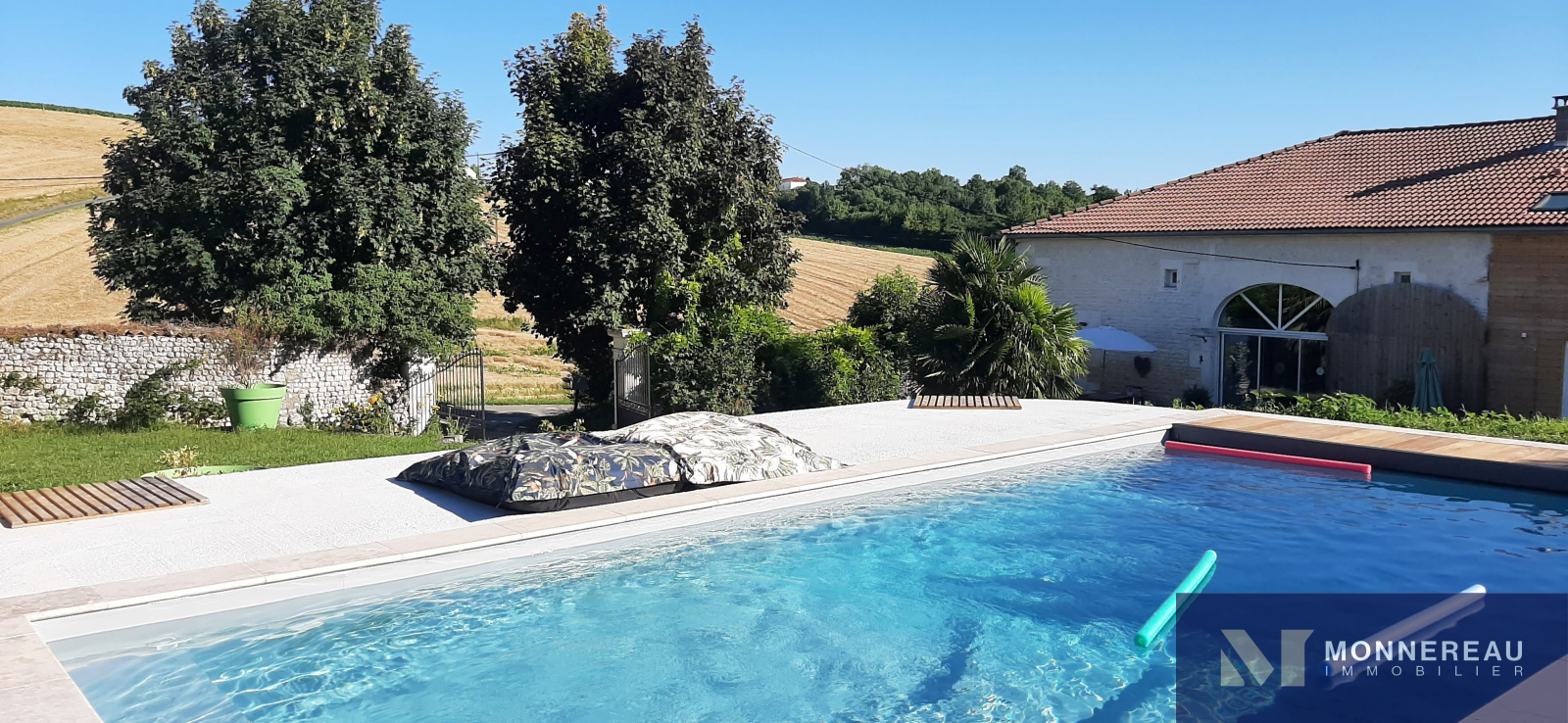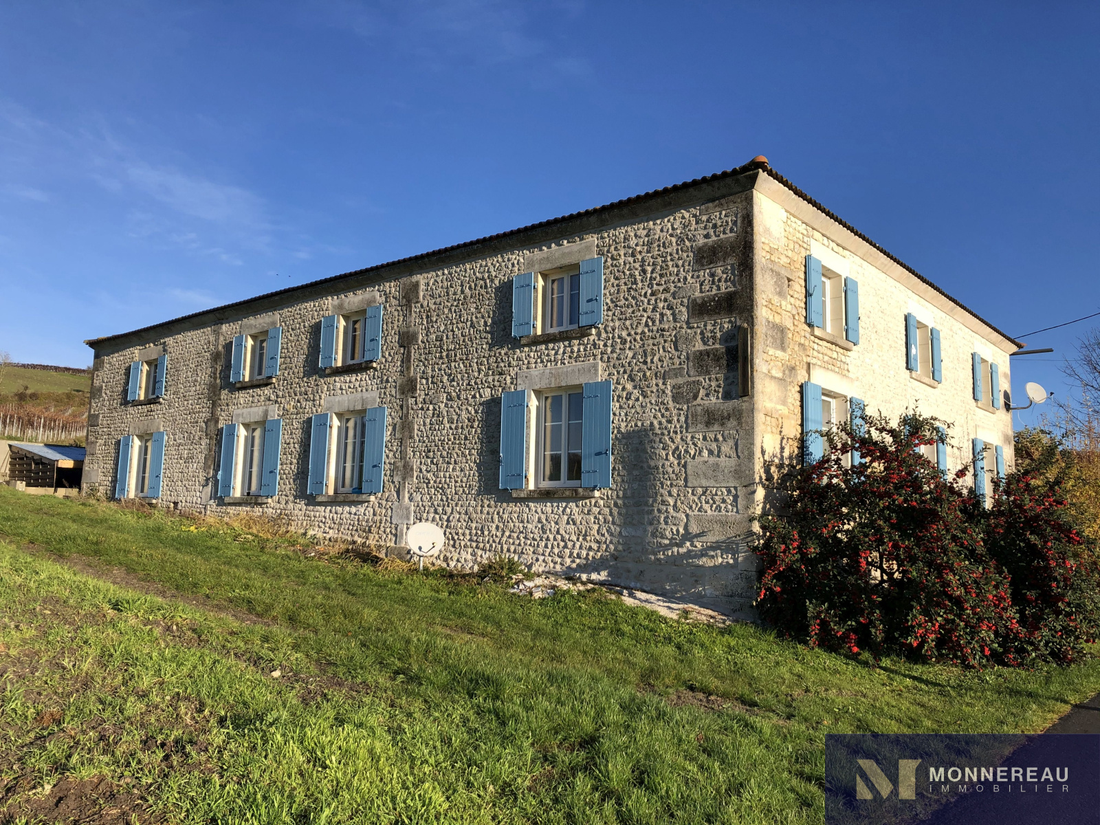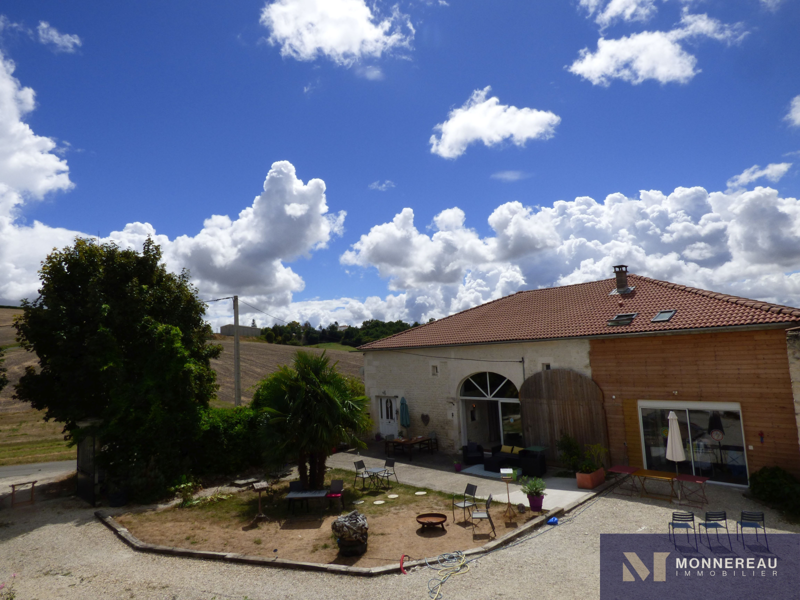 Entre Barbezieux et Chateuneuf (16) - Grande maison ancienne, rénovée récemment, idéale pour une famille nombreuse. Elle se trouve dans un environnement très agréable, sans nuisance et sans voisin proche. Edifiée sur 1685 m² de terrain, la bâtisse laisse de la place au jardin en grande partie clos. Il est à taille humaine et facile d'entretien. La demeure offre de très beaux volumes sur environ 232 m² habitables. Beau séjour/cuisine équipée de 64 m² baigné de lumière par une vaste baie cintrée. Une grande entrée avec placards distribue l'étage principale. On y trouve 4 chambres et salle de bains. Une salle à manger et une chambre avec salle d'eau complètent le rez-de-chaussée. Un gîte de 119 m² habitables dont 3 chambres a été récemment aménagé. Cette partie est indépendante mais peut communiquer. Chauffage au sol par pompe à chaleur dans la maison principale. Abri de jardin et abri pour voitures. Piscine chauffée. Le charme de la pierre. Exclusivité !