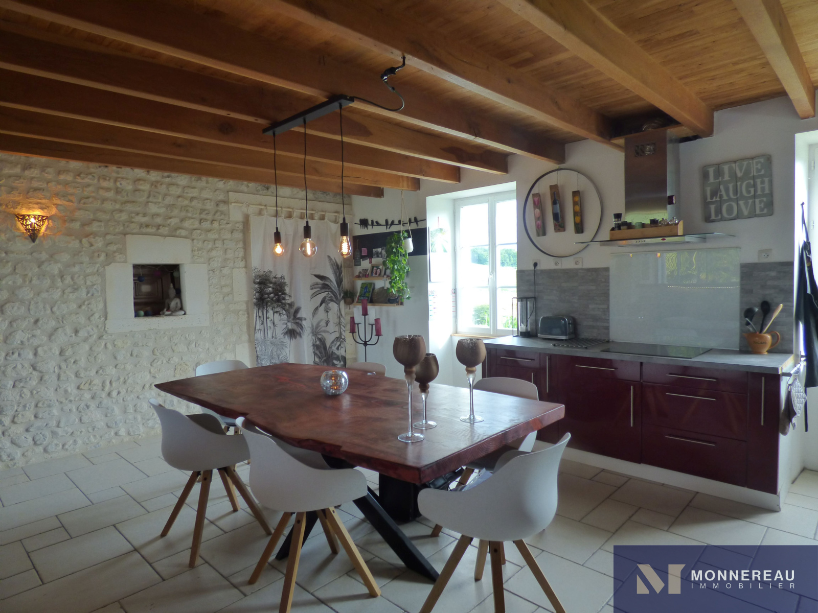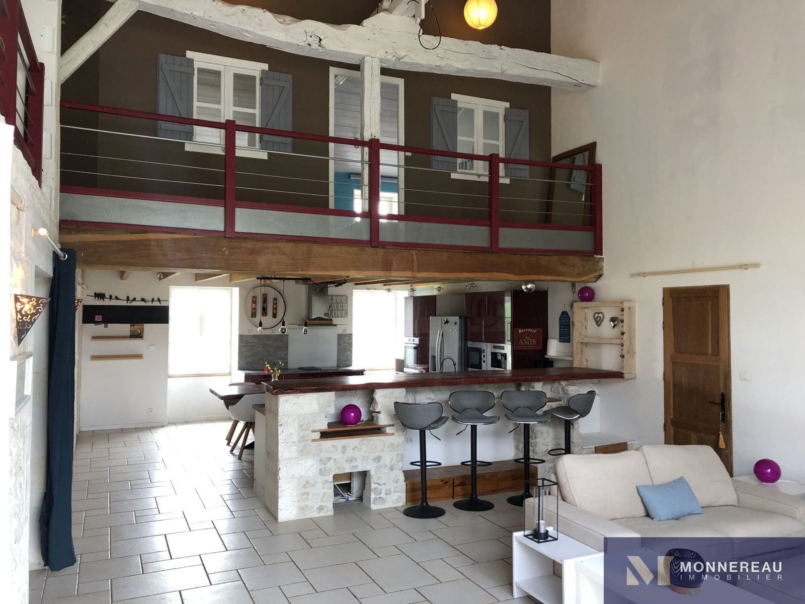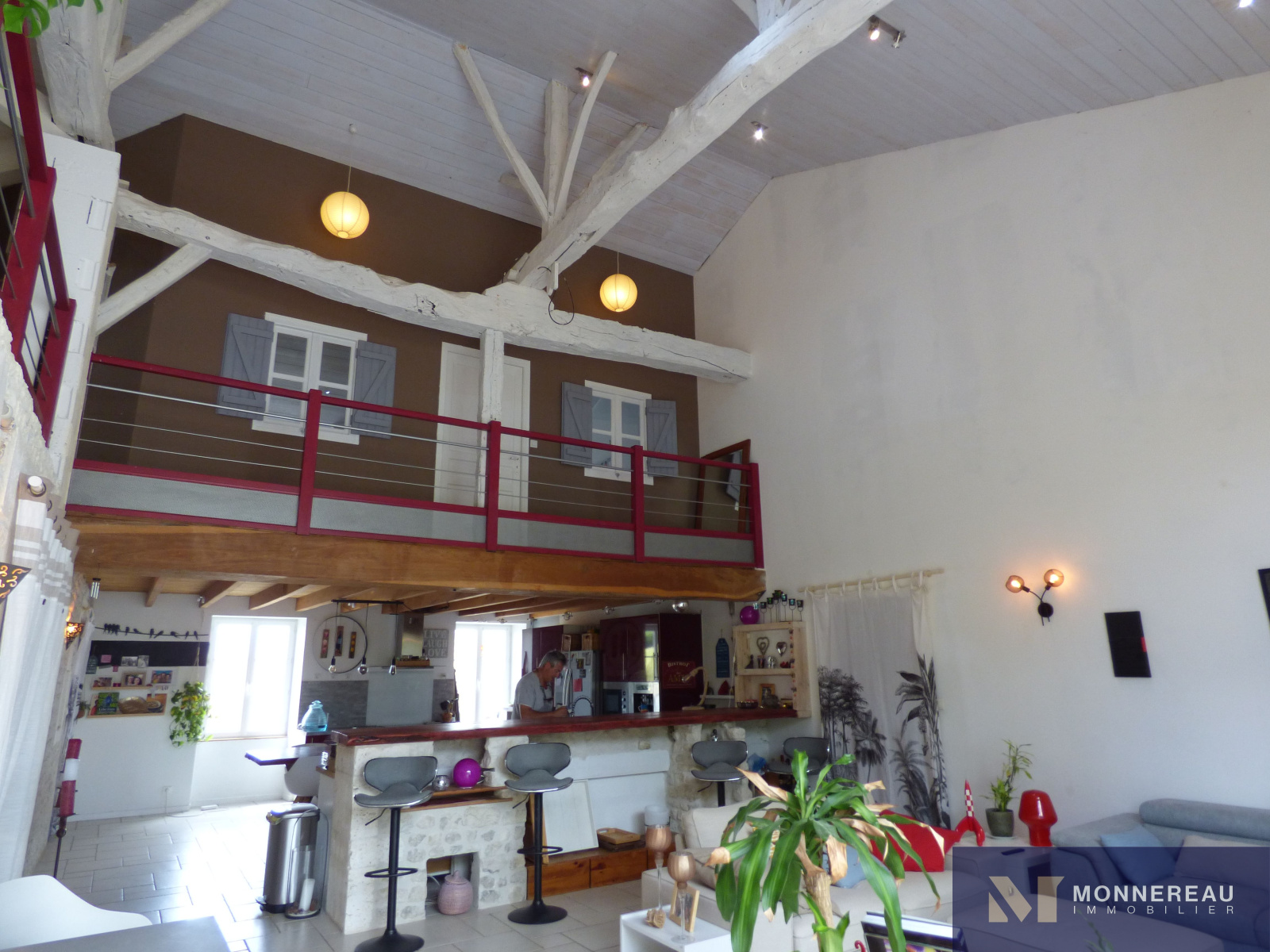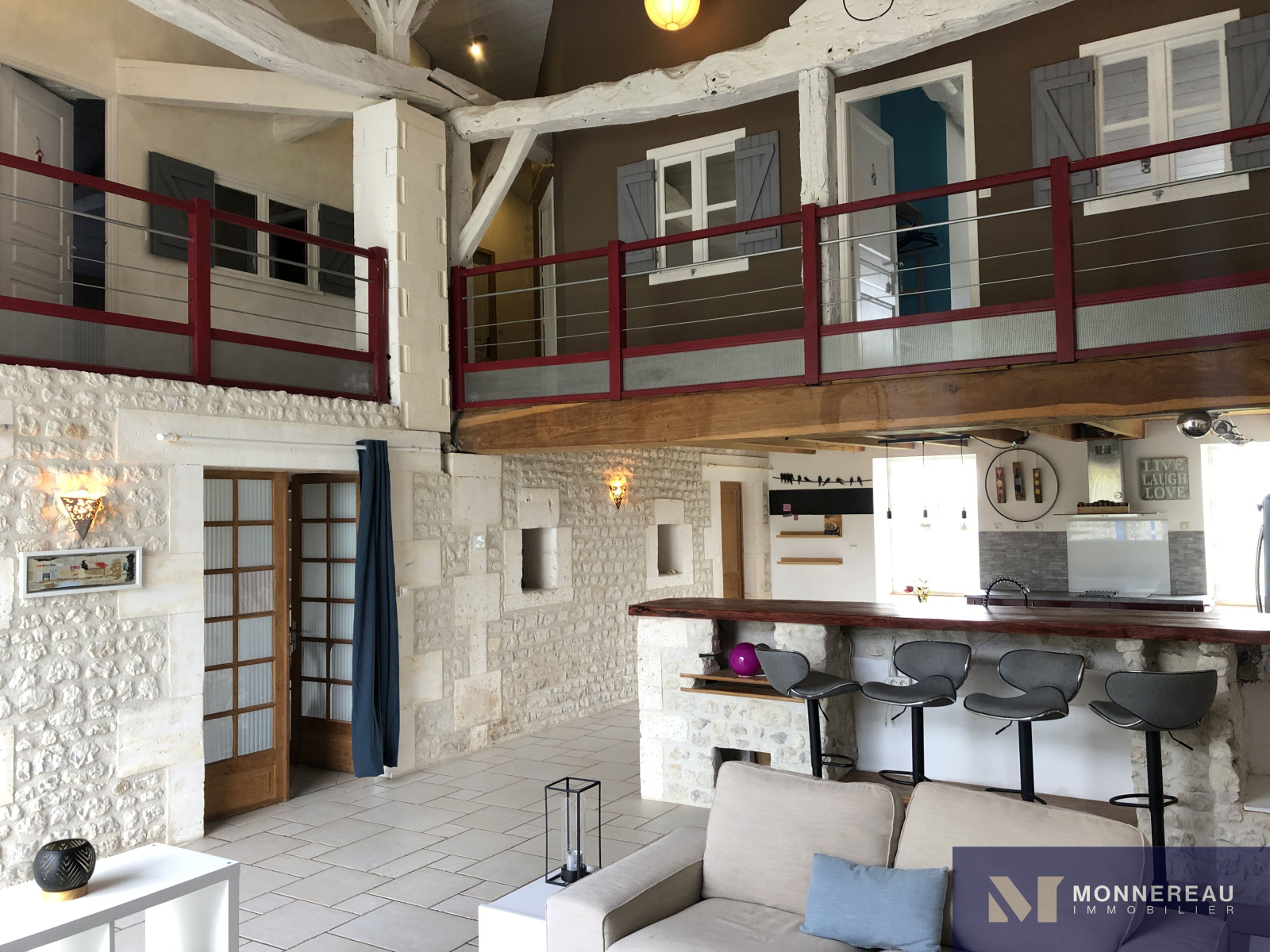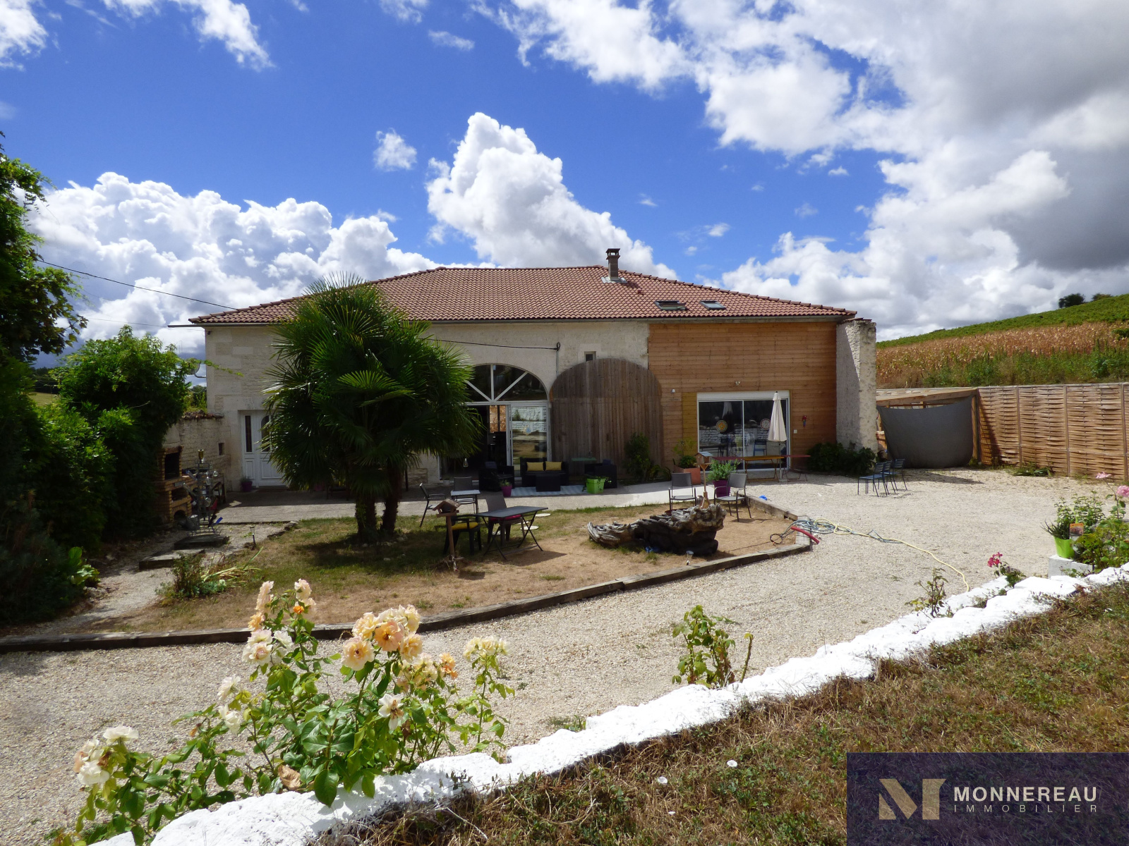 Entre Barbezieux et Chateuneuf (16) - Grande maison ancienne, rénovée récemment, idéale pour une famille nombreuse. Elle se trouve dans un environnement très agréable, sans nuisance et sans voisin proche. Edifiée sur 1685 m² de terrain, la bâtisse laisse de la place au jardin en grande partie clos. Il est à taille humaine et facile d'entretien. La demeure offre de très beaux volumes sur environ 232 m² habitables. Beau séjour/cuisine équipée de 64 m² baigné de lumière par une vaste baie cintrée. Une grande entrée avec placards distribue l'étage principale. On y trouve 4 chambres et salle de bains. Une salle à manger et une chambre avec salle d'eau complètent le rez-de-chaussée. Un gîte de 119 m² habitables dont 3 chambres a été récemment aménagé. Cette partie est indépendante mais peut communiquer. Chauffage au sol par pompe à chaleur dans la maison principale. Abri de jardin et abri pour voitures. Piscine chauffée. Le charme de la pierre. Exclusivité !