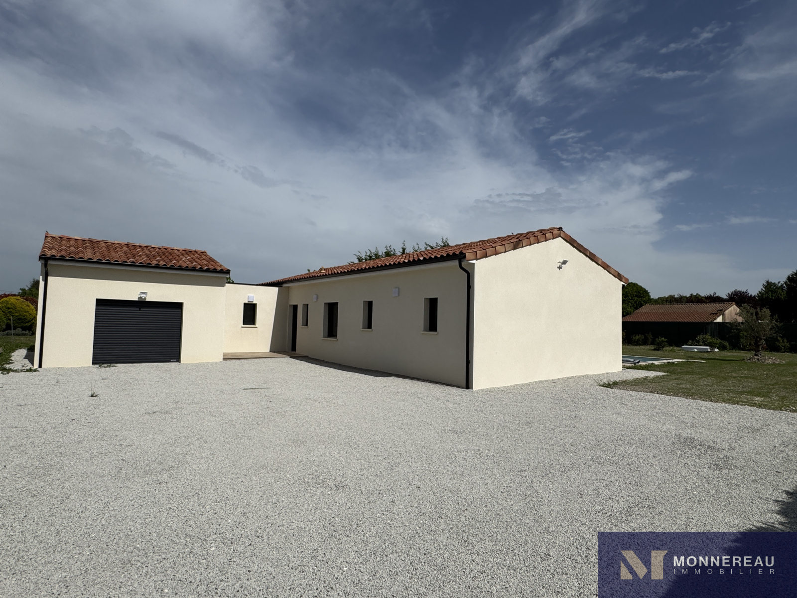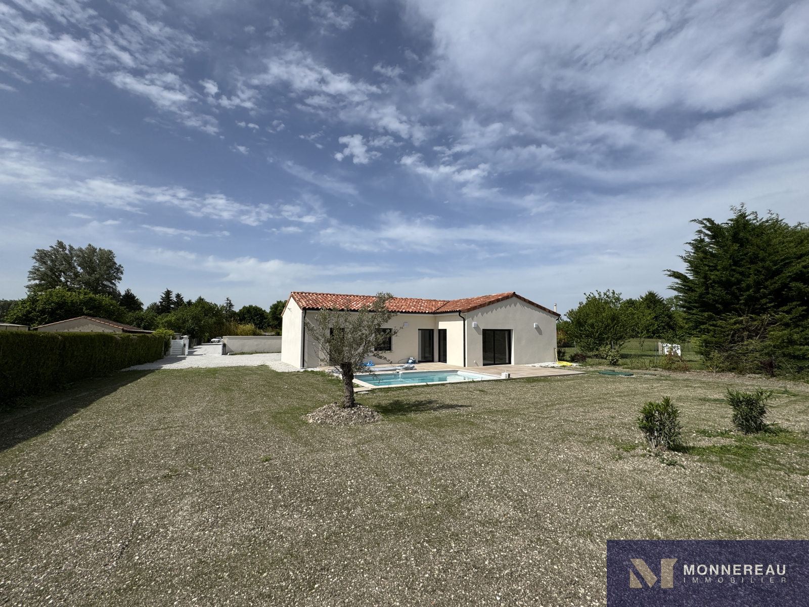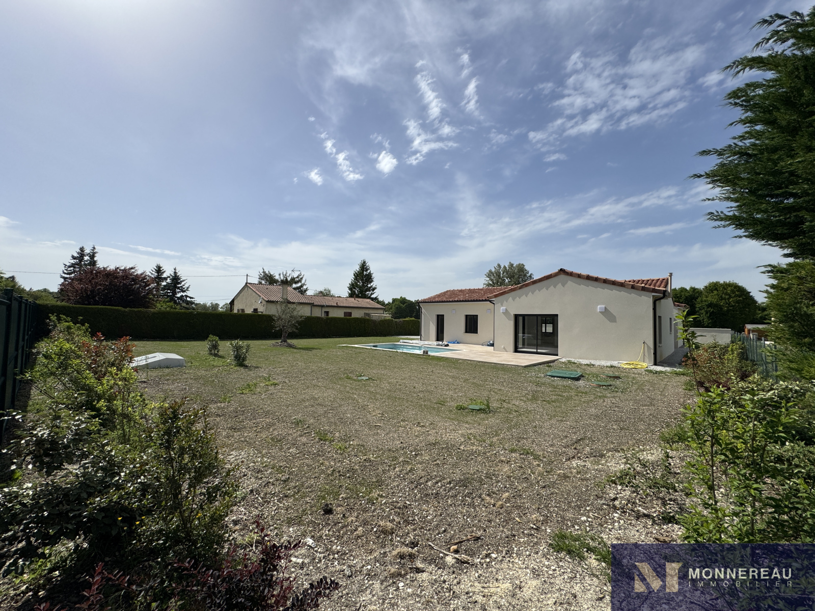 Proche de BARBEZIEUX (16) - Cette maison construite avec soin par des professionnels expérimentés est littéralement neuve. Elle vient tout juste d'être terminée. Des travaux de finition sur le chemin et sur le chauffage sont en cours. Ce plain-pied de 124 m² habitables profitent de très belles prestations. Vaste séjour avec cuisine équipée très lumineux grâce à ses baies qui s'ouvrent sur la terrasse sur plot qui entoure la piscine. Trois chambres dont une avec salle d'eau et dressing. Grand cellier qui donne accès au garage de 30 m². Le tout édifié sur un terrain clos de 1400 m² (hors chemin). Environnement calme et agréable. C'est une opportunité de pouvoir acheter une maison neuve de cette qualité sans avoir à la construire. A voir absolument !