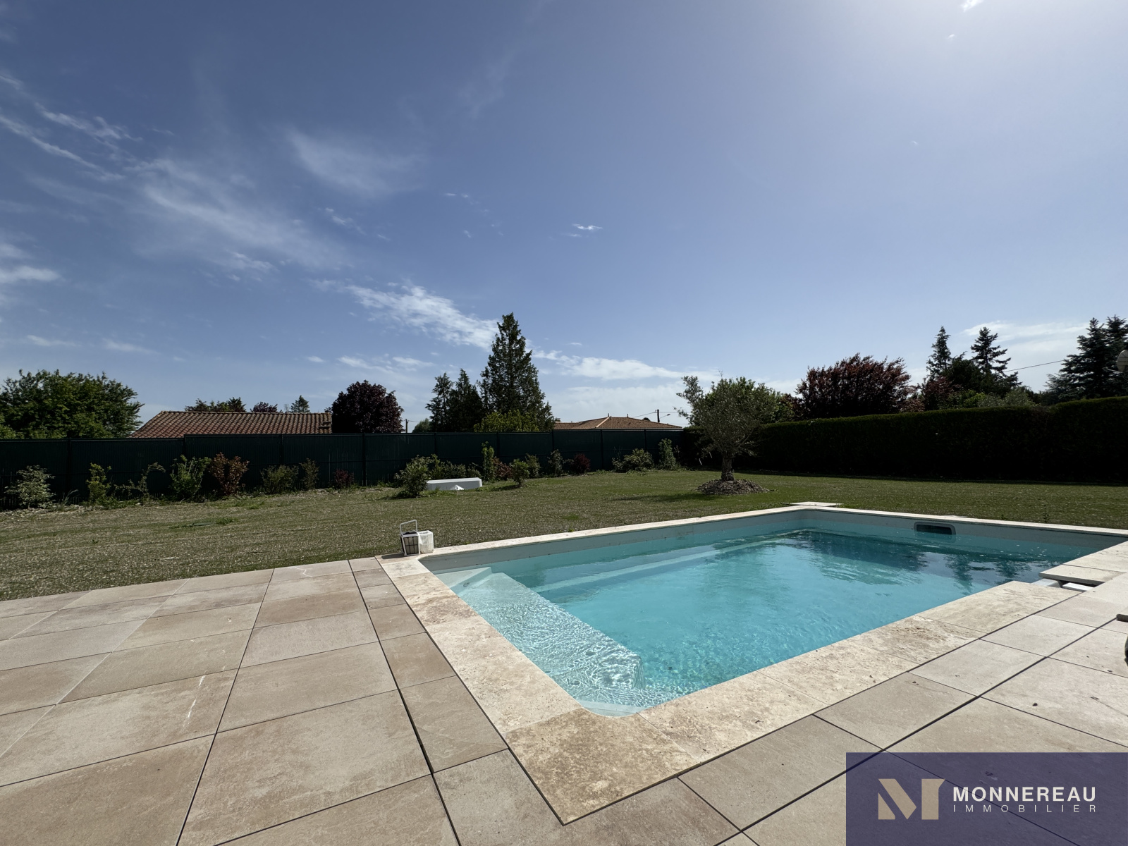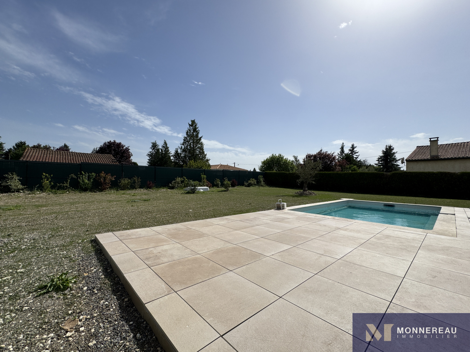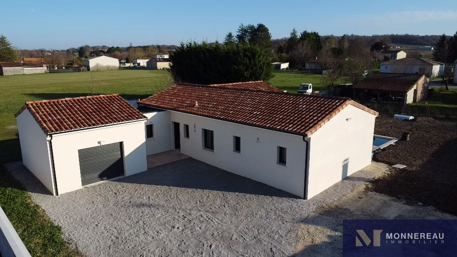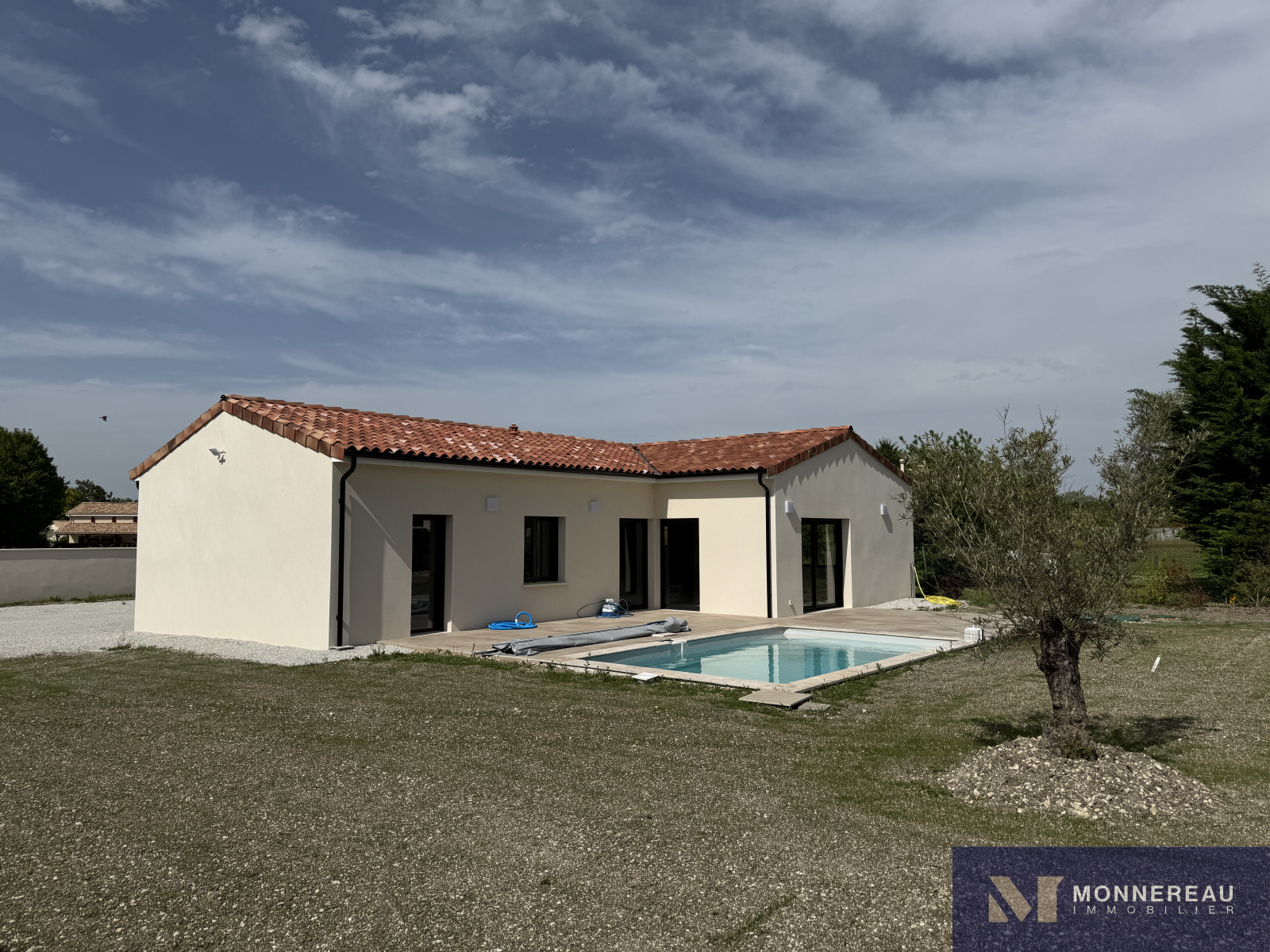 Proche de BARBEZIEUX (16) - Cette maison construite avec soin par des professionnels expérimentés est littéralement neuve. Elle vient tout juste d'être terminée. Des travaux de finition sur le chemin et sur le chauffage sont en cours. Ce plain-pied de 124 m² habitables profitent de très belles prestations. Vaste séjour avec cuisine équipée très lumineux grâce à ses baies qui s'ouvrent sur la terrasse sur plot qui entoure la piscine. Trois chambres dont une avec salle d'eau et dressing. Grand cellier qui donne accès au garage de 30 m². Le tout édifié sur un terrain clos de 1400 m² (hors chemin). Environnement calme et agréable. C'est une opportunité de pouvoir acheter une maison neuve de cette qualité sans avoir à la construire. A voir absolument !