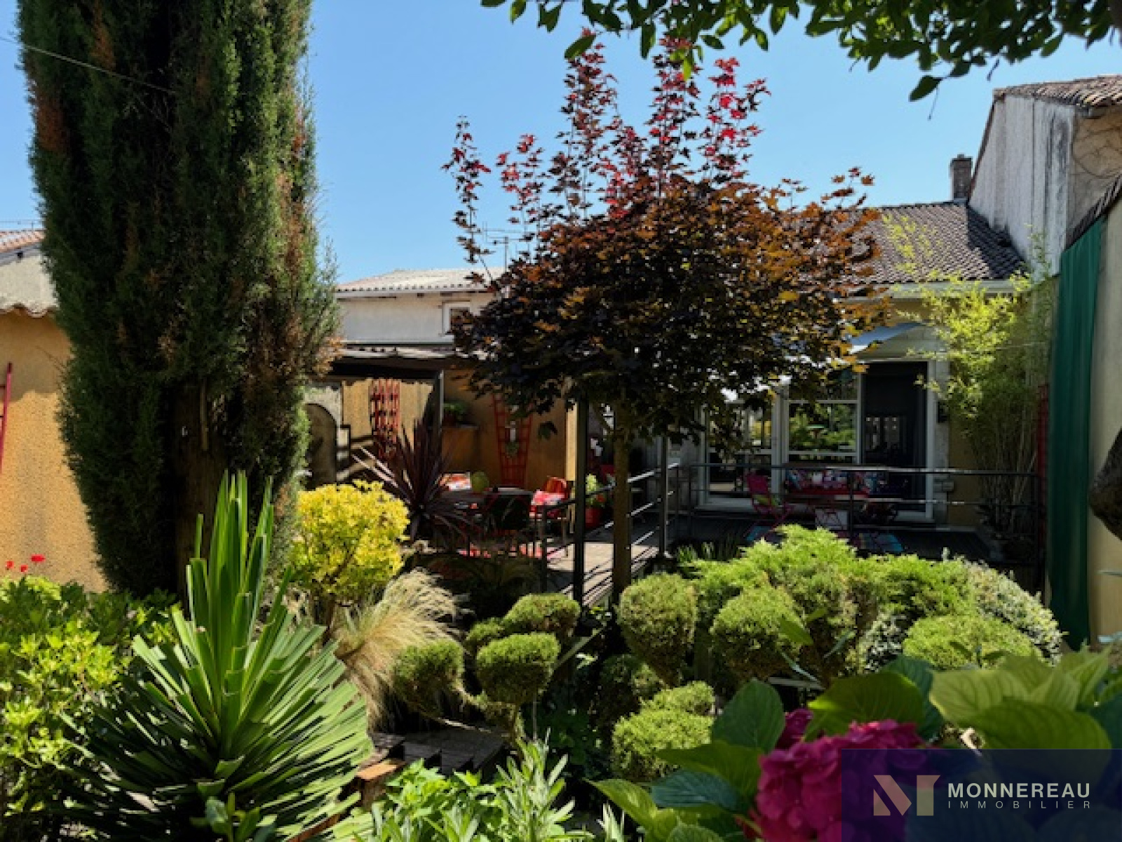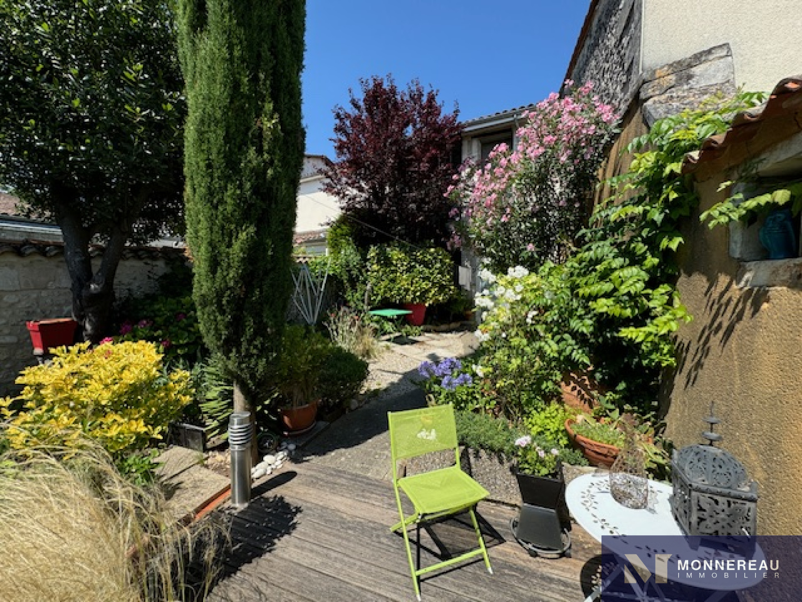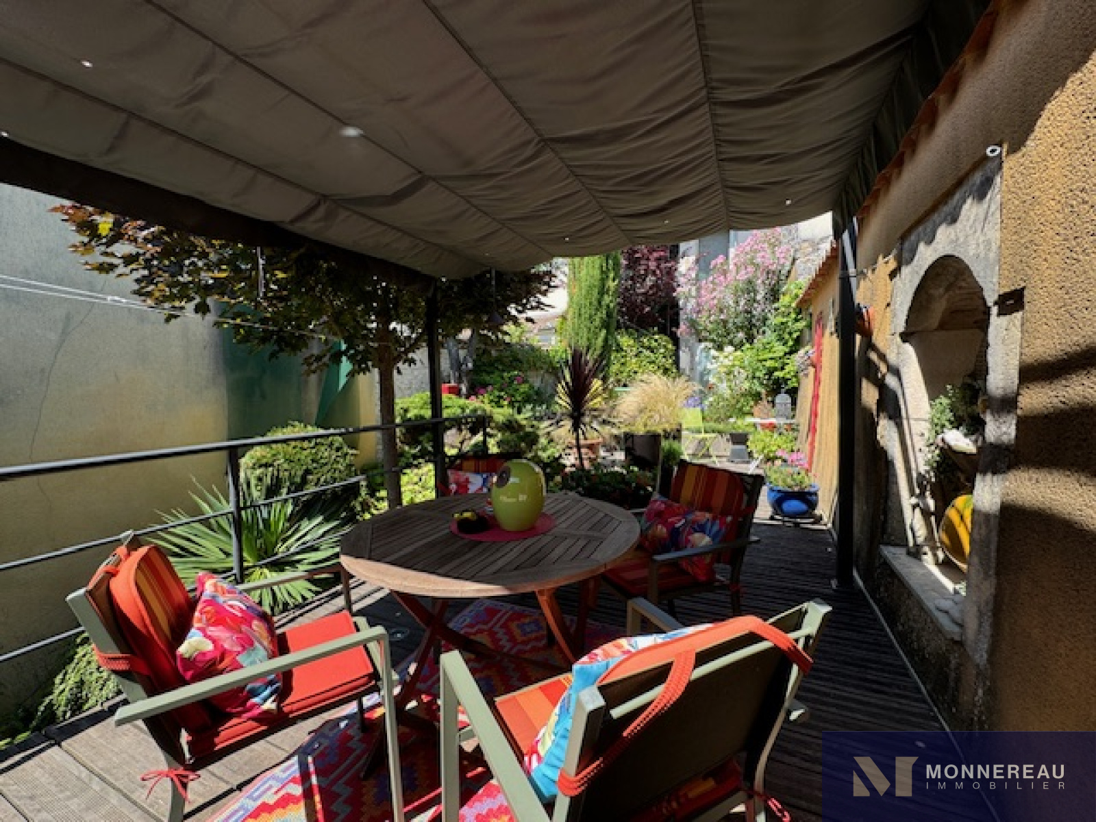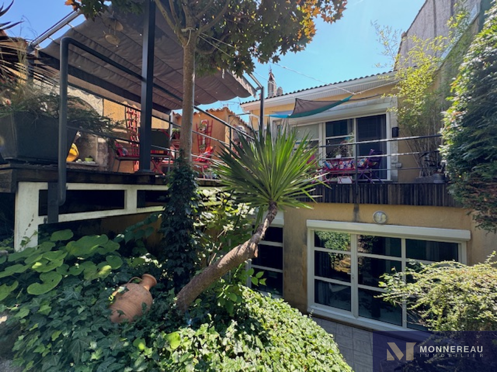 BARBEZIEUX centre (16) - Tous services et écoles à pied - Cette maison de ville a été soigneusement pensée et aménagée par un architecte. Les beaux volumes se mèlent les uns aux autres avec fluidité. Ils sont baignés de lumière. Les prestations sont à la hauteur du visuel. Les matières de belle facture et la décoration apportent une atmosphère très singulière. Cette rénovation est réussie ! Au rez-de-chaussée, hall d'entrée avec placards, buanderie (ancien bureau) et immense chambre sur cour avec salle d'eau et dressing. A l'étage et en rez-de-jardin, séjour avec bibliothèque et partie repas, cuisine équipée type labo semi-ouverte. Une terrasse suspendue prolonge cet espace. Elle fait le lien avec le charmant jardin paysager. Au dernier niveau, une mezzanine donne accès à une chambre cosy avec salle d'eau et placards. Cave. Chauffage central au gaz de ville. Garage indépendant pouvant accueillir deux voitures. Accès sur rue arrière. Au dessus un plateau en partie isolé offre un beau potentiel d'aménagement pour aménager un studio, un bureau ou pour un atelier d'artiste. Situation très agréable. Les lieux sont parfaitement entretenus. Quel caractère !