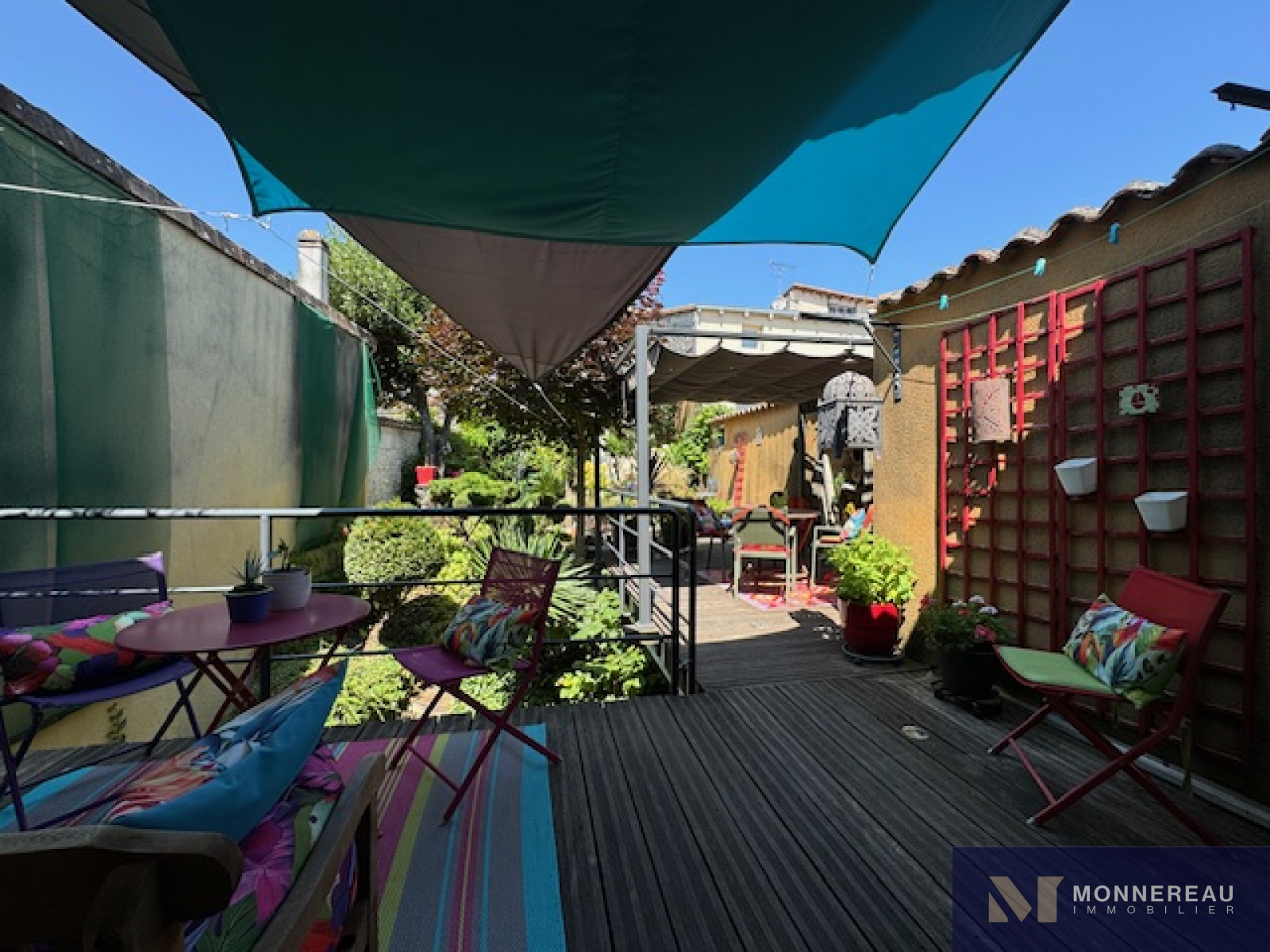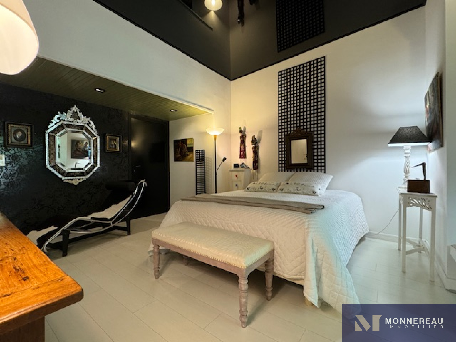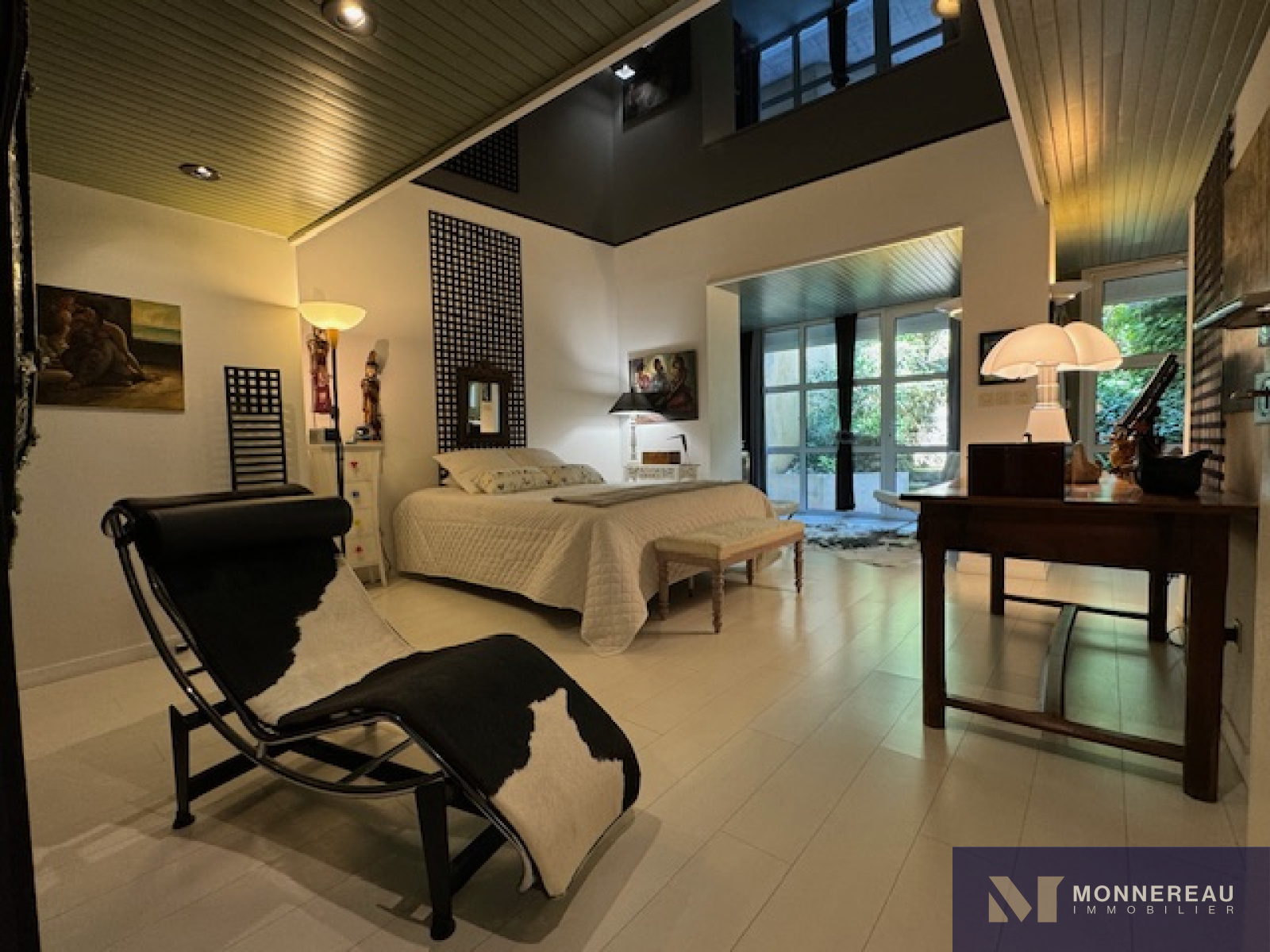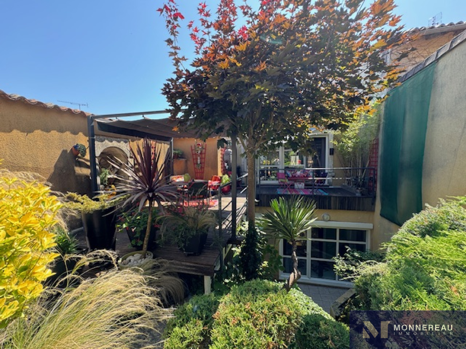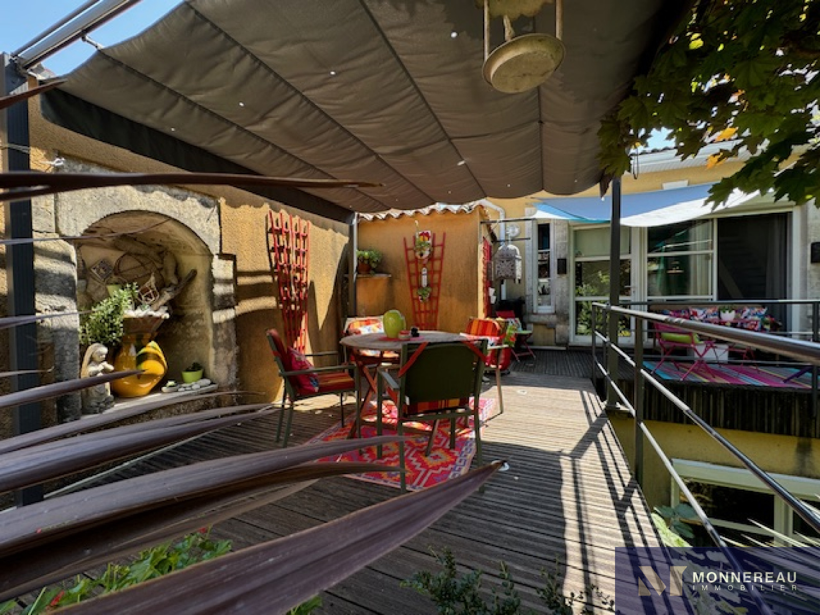 BARBEZIEUX centre (16) - Tous services et écoles à pied - Cette maison de ville a été soigneusement pensée et aménagée par un architecte. Les beaux volumes se mèlent les uns aux autres avec fluidité. Ils sont baignés de lumière. Les prestations sont à la hauteur du visuel. Les matières de belle facture et la décoration apportent une atmosphère très singulière. Cette rénovation est réussie ! Au rez-de-chaussée, hall d'entrée avec placards, buanderie (ancien bureau) et immense chambre sur cour avec salle d'eau et dressing. A l'étage et en rez-de-jardin, séjour avec bibliothèque et partie repas, cuisine équipée type labo semi-ouverte. Une terrasse suspendue prolonge cet espace. Elle fait le lien avec le charmant jardin paysager. Au dernier niveau, une mezzanine donne accès à une chambre cosy avec salle d'eau et placards. Cave. Chauffage central au gaz de ville. Garage indépendant pouvant accueillir deux voitures. Accès sur rue arrière. Au dessus un plateau en partie isolé offre un beau potentiel d'aménagement pour aménager un studio, un bureau ou pour un atelier d'artiste. Situation très agréable. Les lieux sont parfaitement entretenus. Quel caractère !
