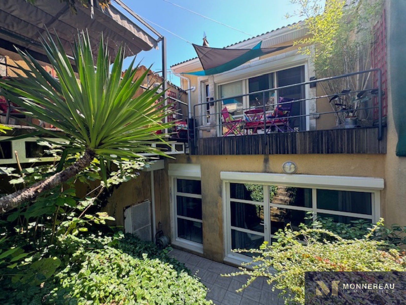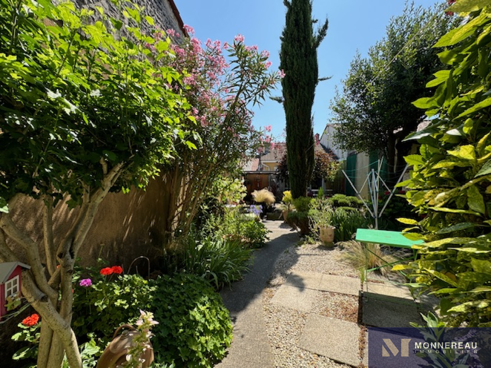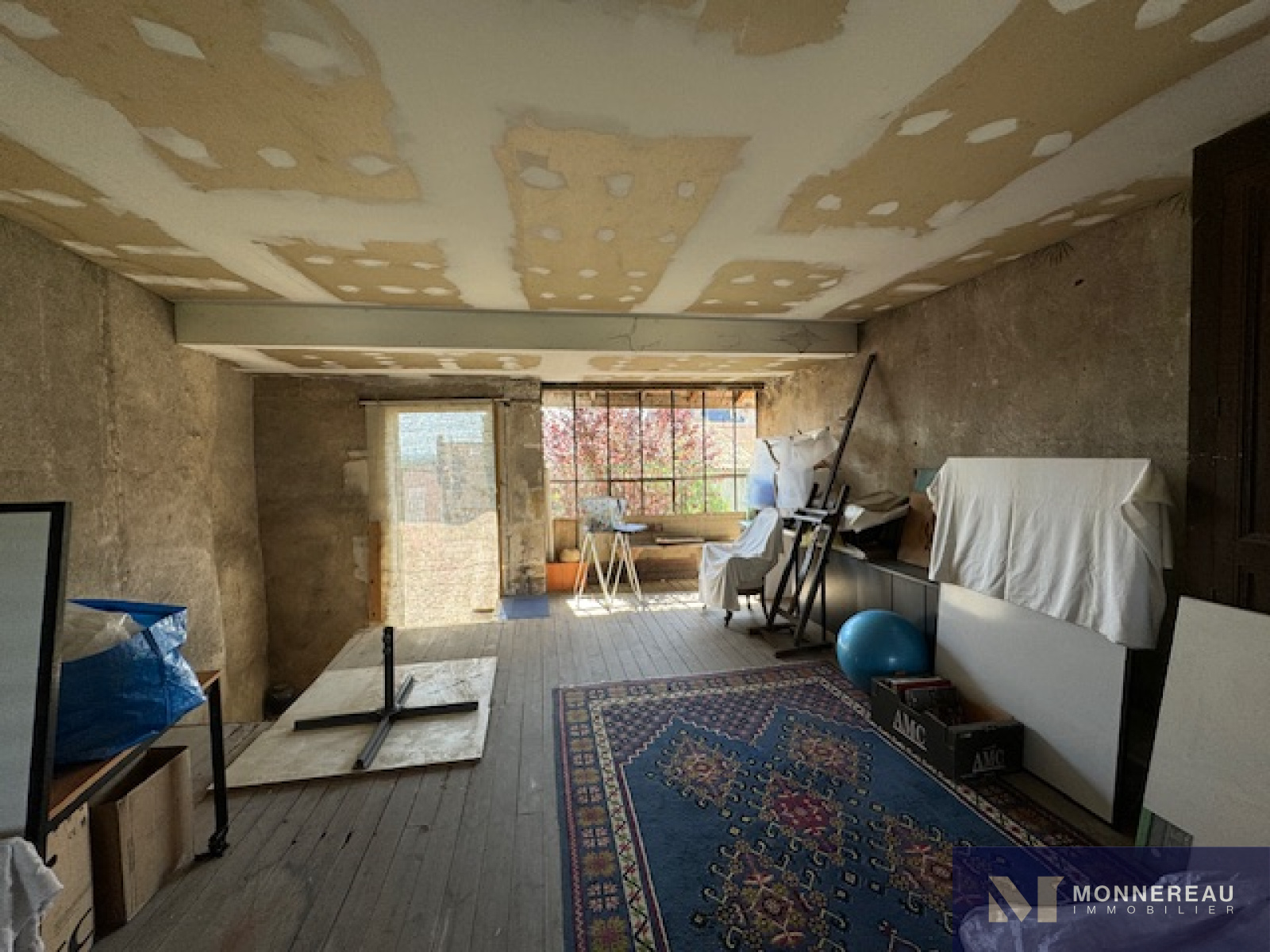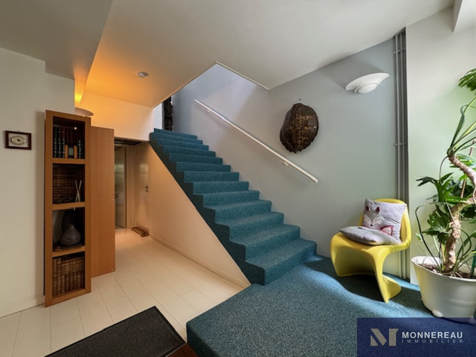 BARBEZIEUX centre (16) - Tous services et écoles à pied - Cette maison de ville a été soigneusement pensée et aménagée par un architecte. Les beaux volumes se mèlent les uns aux autres avec fluidité. Ils sont baignés de lumière. Les prestations sont à la hauteur du visuel. Les matières de belle facture et la décoration apportent une atmosphère très singulière. Cette rénovation est réussie ! Au rez-de-chaussée, hall d'entrée avec placards, buanderie (ancien bureau) et immense chambre sur cour avec salle d'eau et dressing. A l'étage et en rez-de-jardin, séjour avec bibliothèque et partie repas, cuisine équipée type labo semi-ouverte. Une terrasse suspendue prolonge cet espace. Elle fait le lien avec le charmant jardin paysager. Au dernier niveau, une mezzanine donne accès à une chambre cosy avec salle d'eau et placards. Cave. Chauffage central au gaz de ville. Garage indépendant pouvant accueillir deux voitures. Accès sur rue arrière. Au dessus un plateau en partie isolé offre un beau potentiel d'aménagement pour aménager un studio, un bureau ou pour un atelier d'artiste. Situation très agréable. Les lieux sont parfaitement entretenus. Quel caractère !