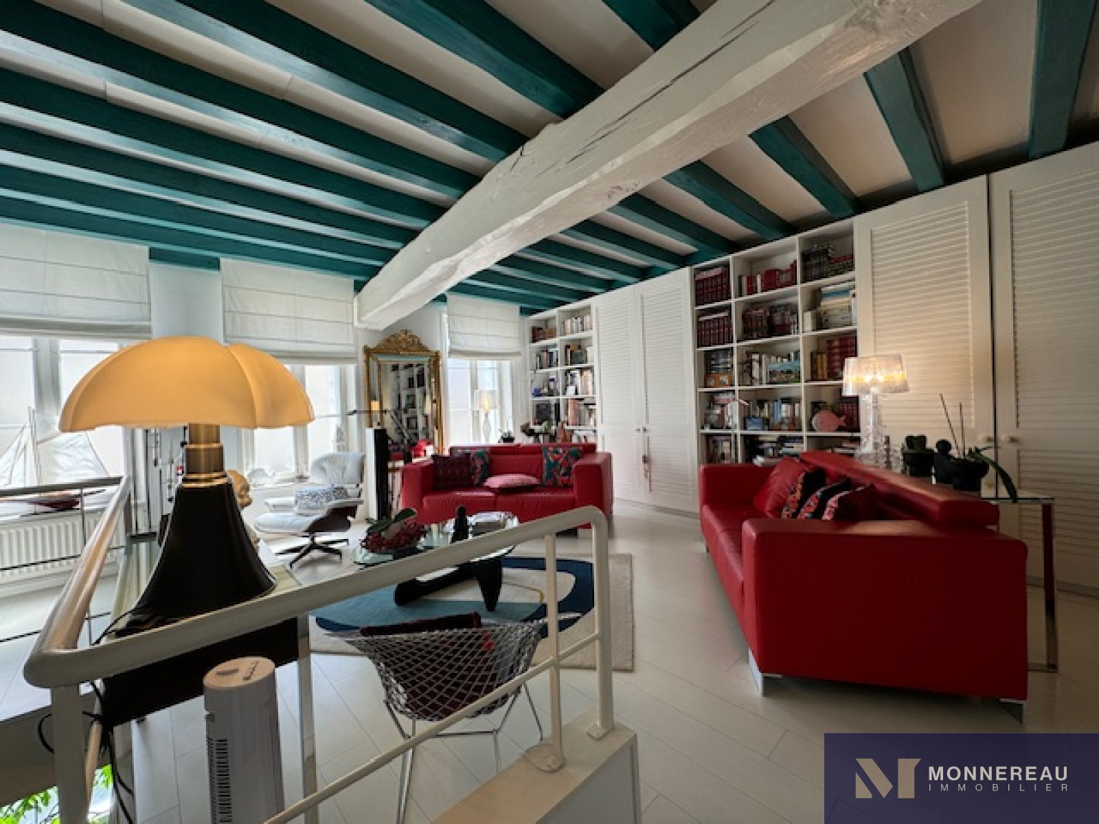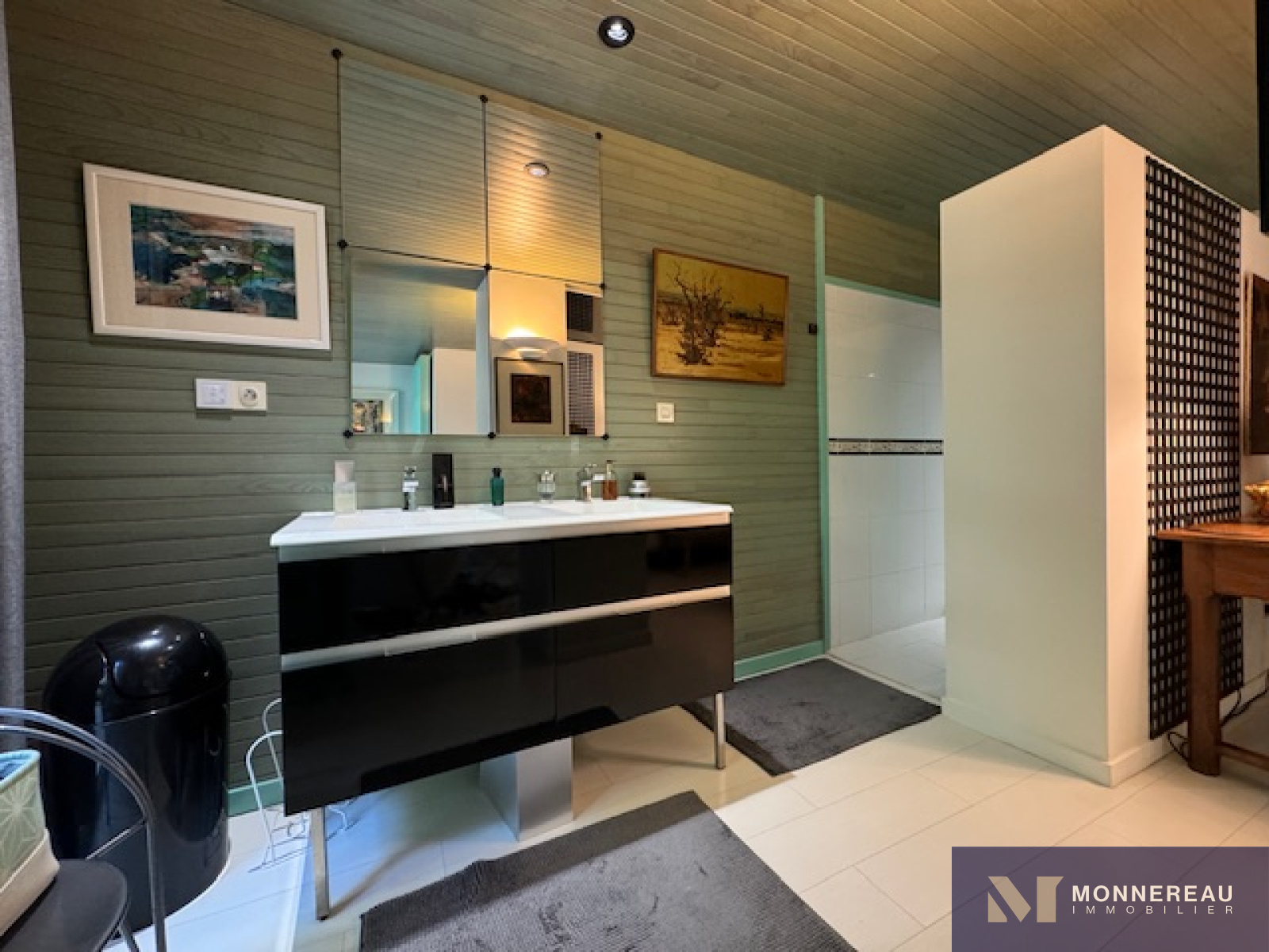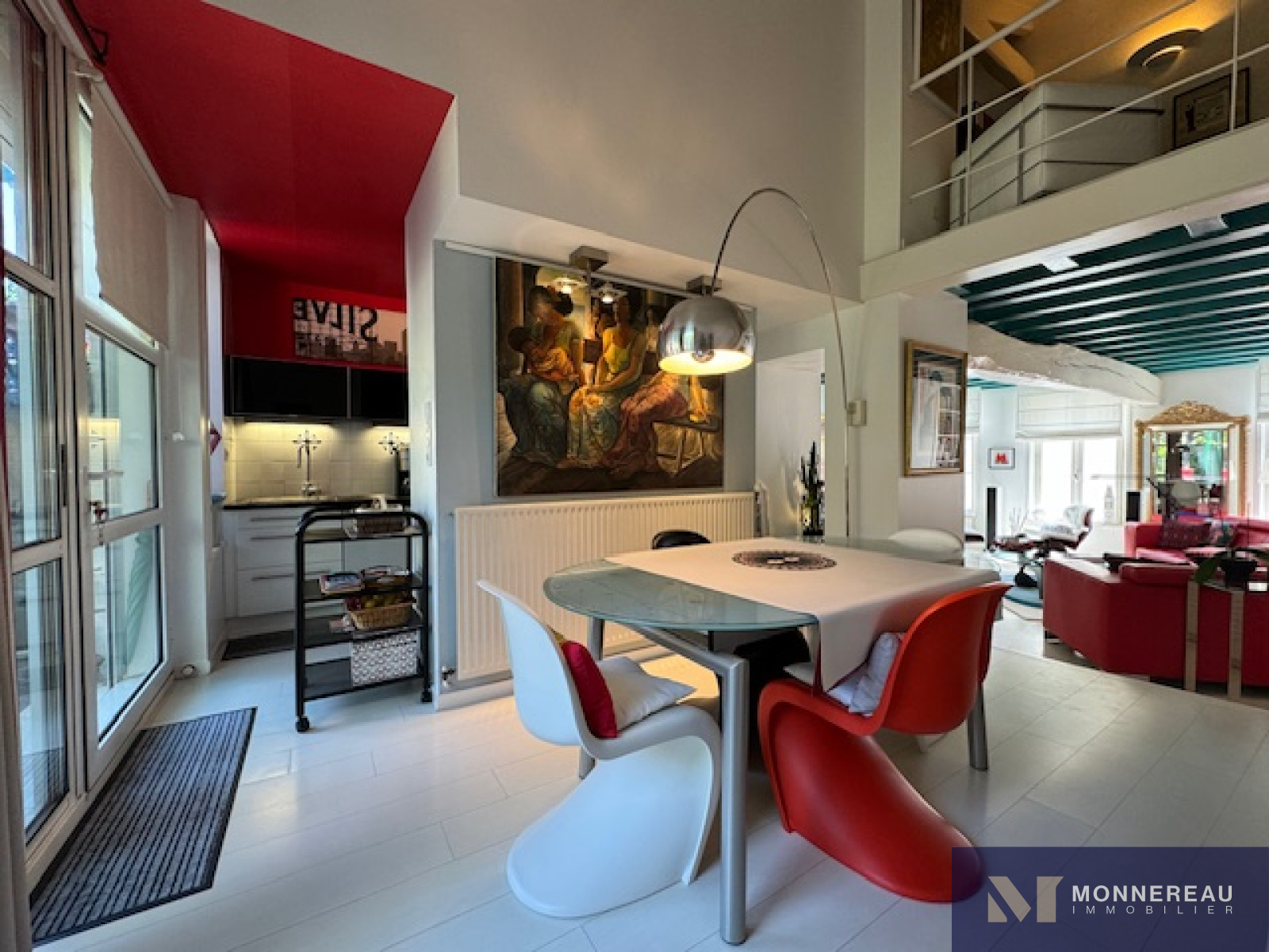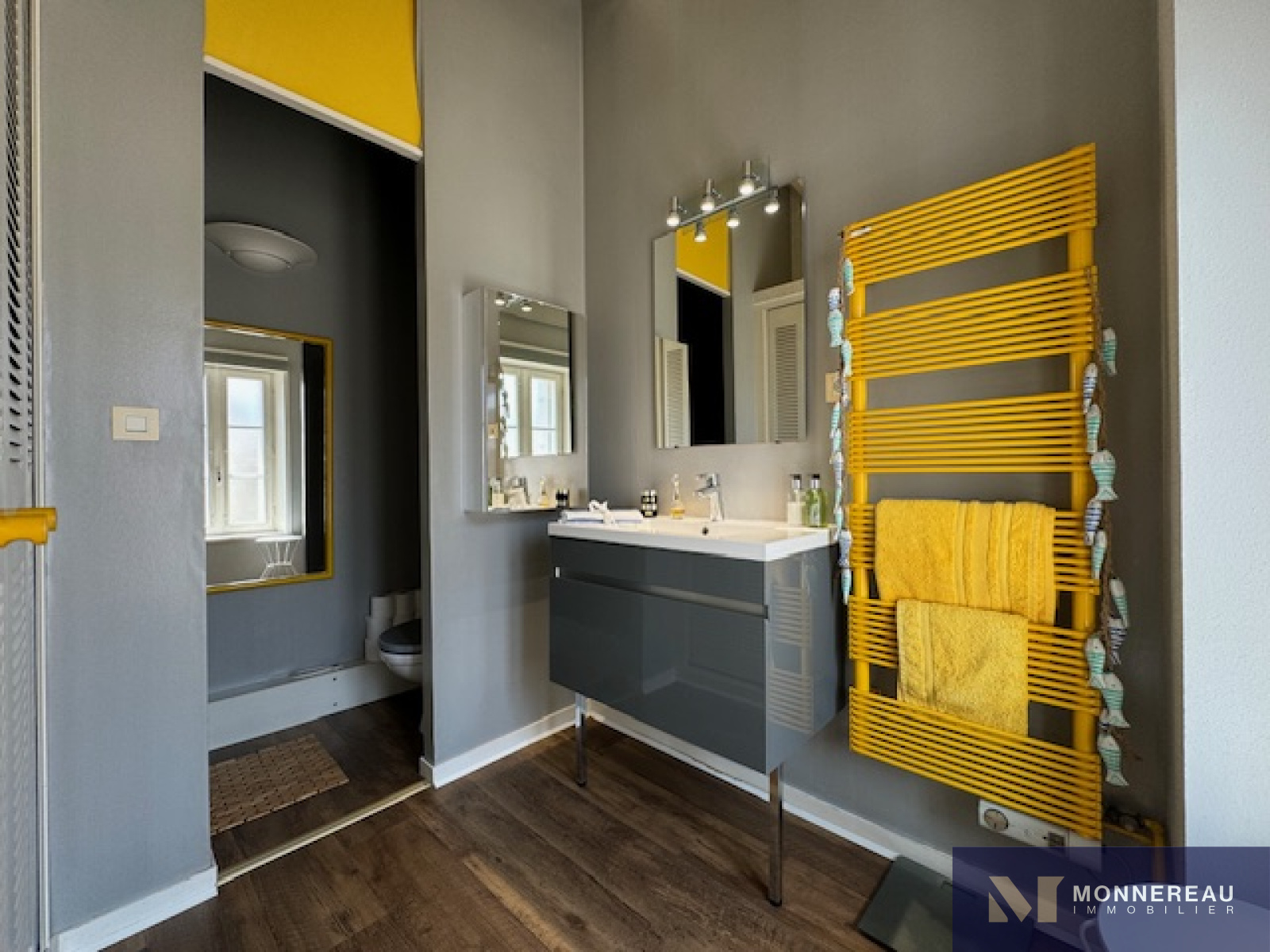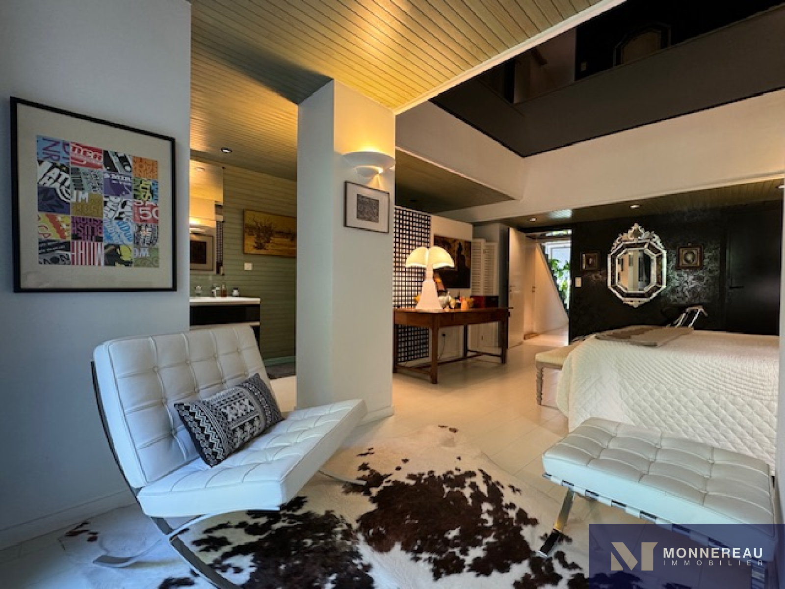 BARBEZIEUX centre (16) - Tous services et écoles à pied - Cette maison de ville a été soigneusement pensée et aménagée par un architecte. Les beaux volumes se mèlent les uns aux autres avec fluidité. Ils sont baignés de lumière. Les prestations sont à la hauteur du visuel. Les matières de belle facture et la décoration apportent une atmosphère très singulière. Cette rénovation est réussie ! Au rez-de-chaussée, hall d'entrée avec placards, buanderie (ancien bureau) et immense chambre sur cour avec salle d'eau et dressing. A l'étage et en rez-de-jardin, séjour avec bibliothèque et partie repas, cuisine équipée type labo semi-ouverte. Une terrasse suspendue prolonge cet espace. Elle fait le lien avec le charmant jardin paysager. Au dernier niveau, une mezzanine donne accès à une chambre cosy avec salle d'eau et placards. Cave. Chauffage central au gaz de ville. Garage indépendant pouvant accueillir deux voitures. Accès sur rue arrière. Au dessus un plateau en partie isolé offre un beau potentiel d'aménagement pour aménager un studio, un bureau ou pour un atelier d'artiste. Situation très agréable. Les lieux sont parfaitement entretenus. Quel caractère !