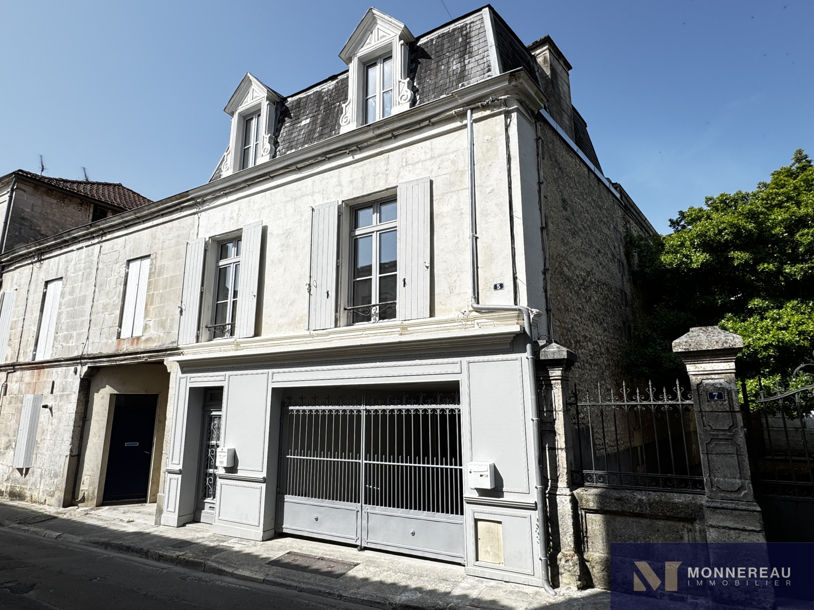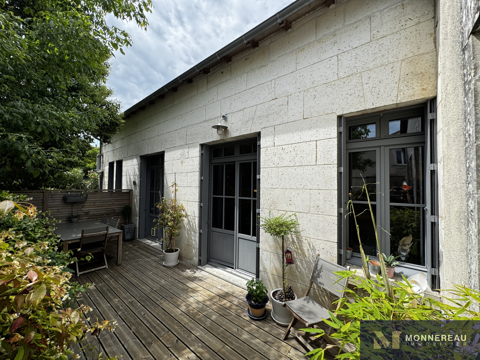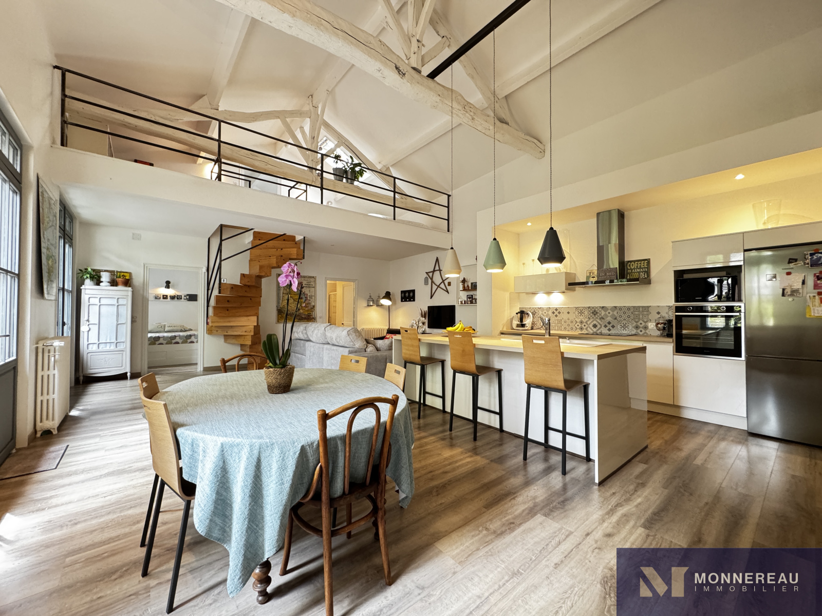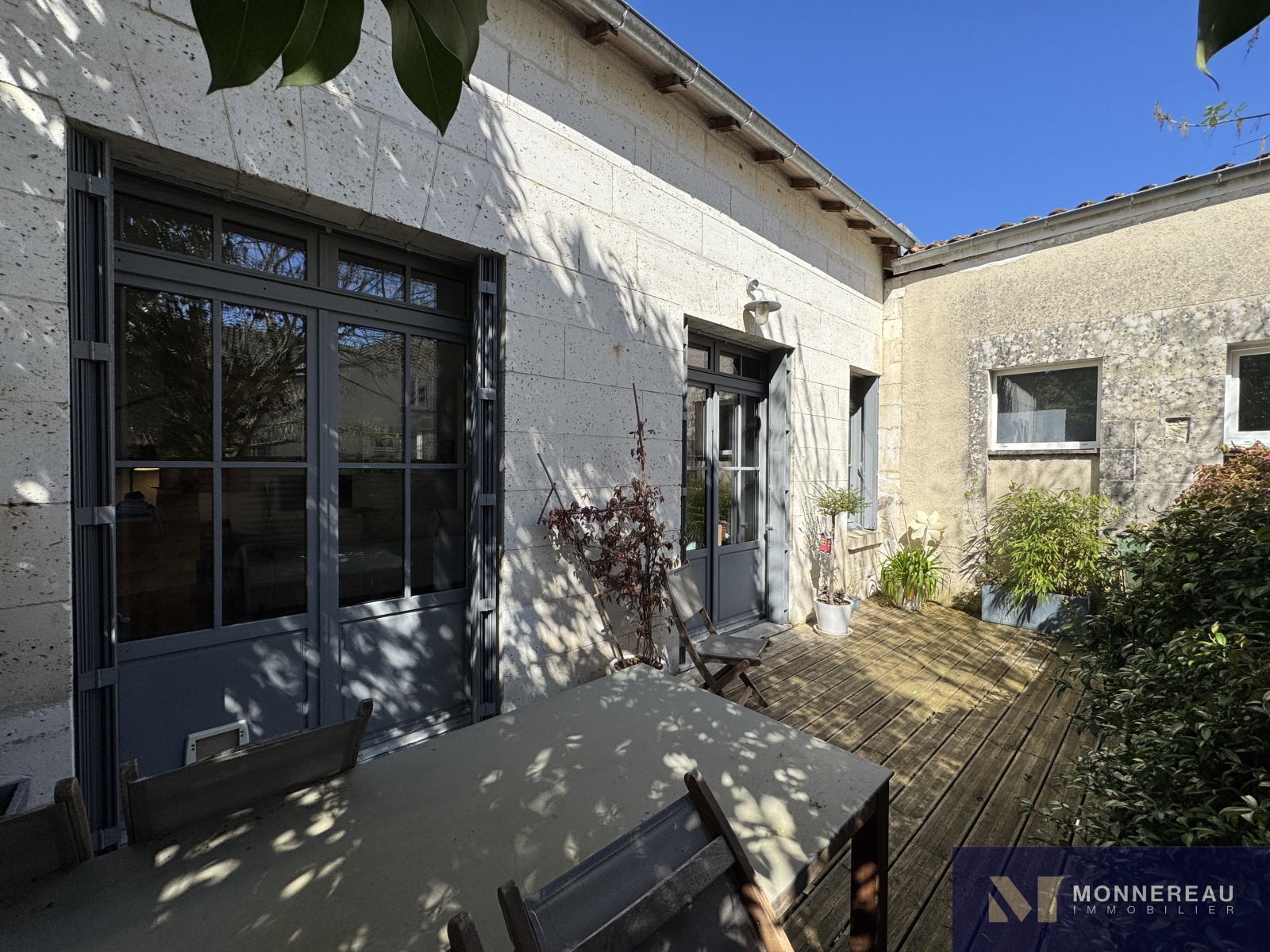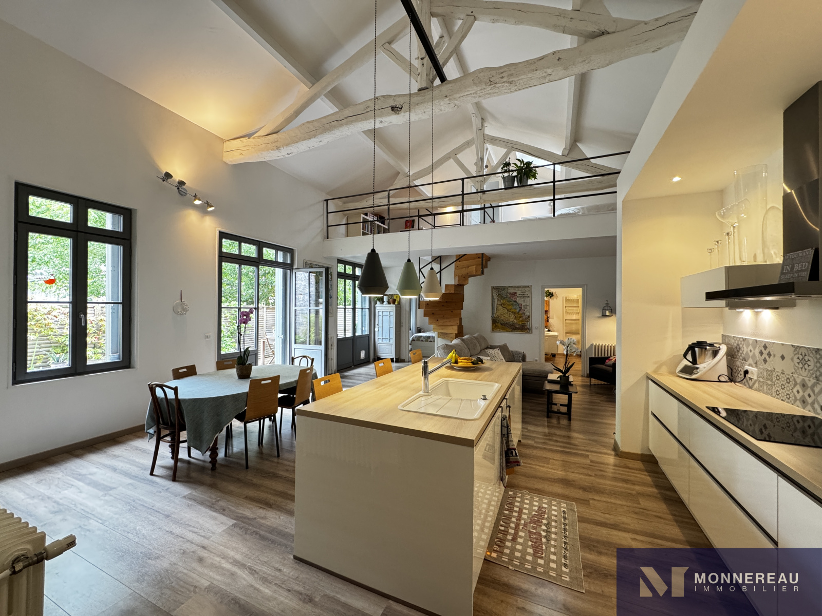 BARBEZIEUX (16) - Au coeur de ville, quartier calme et tous services à pied - Cette ancienne usine à chausson a été un lieu idéal pour imaginer un logement atypique. Au premier étage, les volumes généreux de ce noble bâtiment en pierre de taille ont permis de créer un logement insolite. On y est comme dans un cocon. Et c'est très lumineux grâçe à sa façade Sud sur l'arrière. Le séjour avec cuisine équipée et îlot central s'ouvre sur une terrasse suspendue intime et à l'abri des regards. Les photos révèlent une atmosphère particulière bien réelle. Les tons, l'association des matières, les choix des aménagements sont vraiment réussis. Chambre parentale avec dressing et salle de bains. La mezzanine dessert une chambre mansardée. Le bureau dans l'enfilade du séjour est au besoin une troisième chambre. Le rez-de-chaussée qui était une ancienne boutique de vêtement abrite un vaste garage. Un ancien bureau et divers annexes exploitables sur environ 70 m² au sol s'ouvrent sur un jardinet. Cette partie constitue un réel potentiel pour agrandir ou pour créer une entité supplémentaire. Côté rue, sous la partie en ardoise de trois niveaux, un logement locatif de 65 m² habitables a été créé en même temps. Il est occupé par un locataire pour un loyer mensuel de 615€. Au besoin, ce logement locatif peut facilement communiquer avec la partie principale. Superbe opportunité !