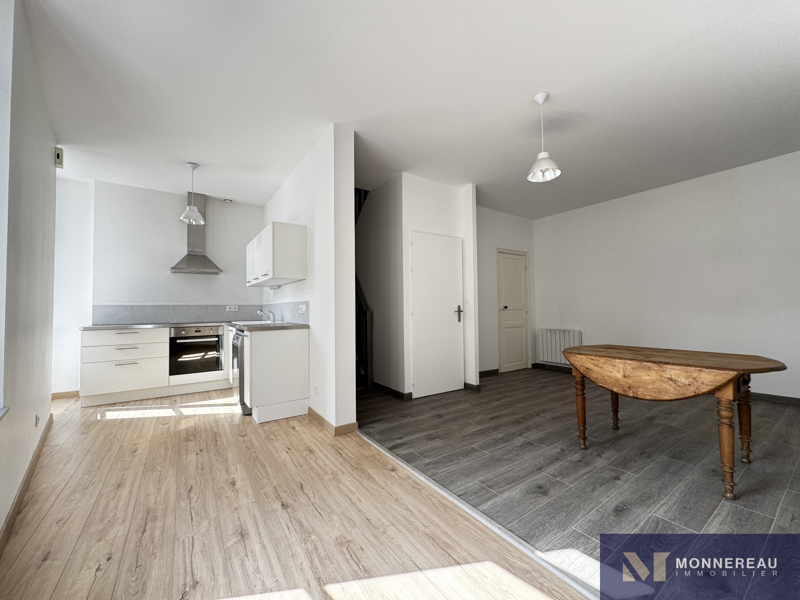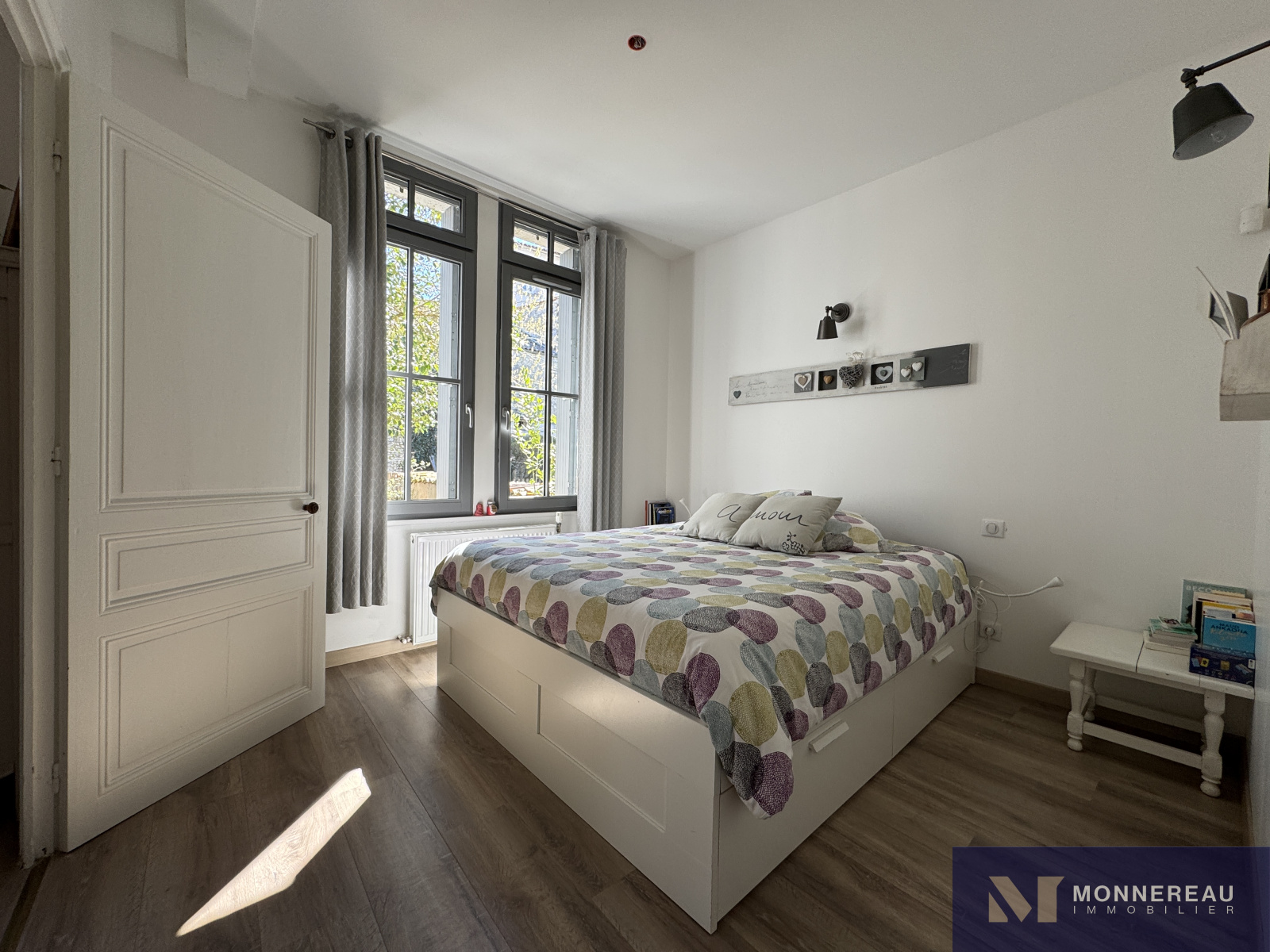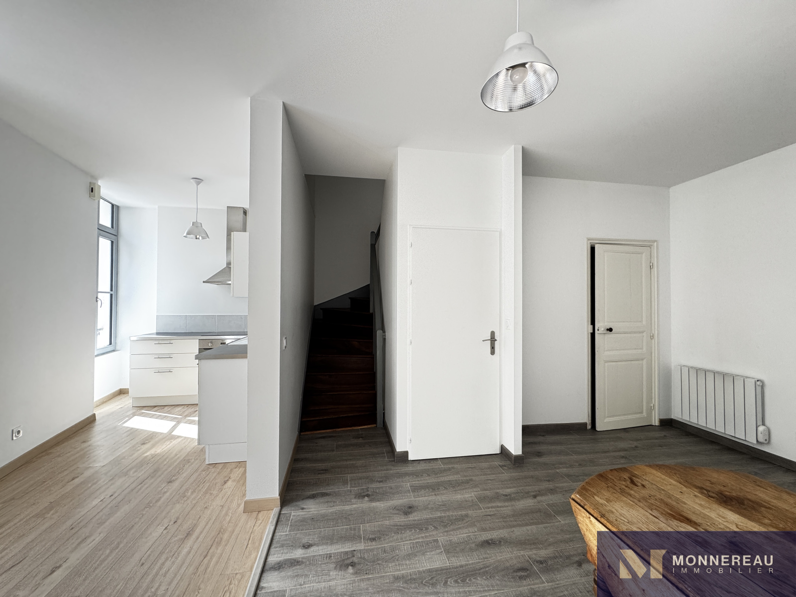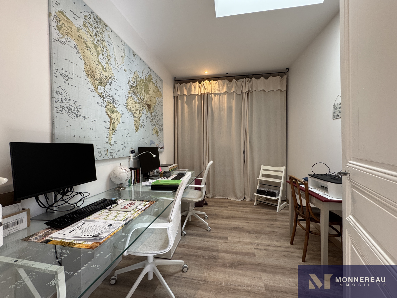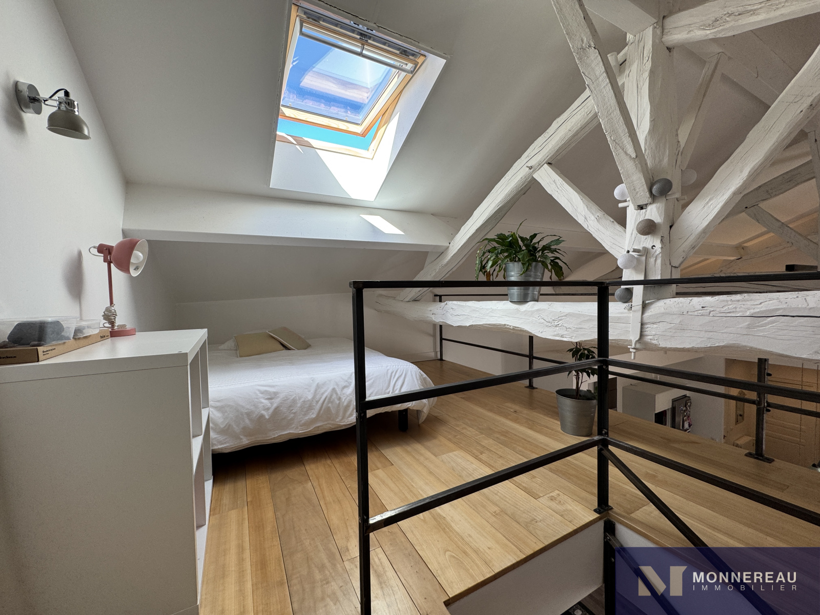 BARBEZIEUX (16) - Au coeur de ville, quartier calme et tous services à pied - Cette ancienne usine à chausson a été un lieu idéal pour imaginer un logement atypique. Au premier étage, les volumes généreux de ce noble bâtiment en pierre de taille ont permis de créer un logement insolite. On y est comme dans un cocon. Et c'est très lumineux grâçe à sa façade Sud sur l'arrière. Le séjour avec cuisine équipée et îlot central s'ouvre sur une terrasse suspendue intime et à l'abri des regards. Les photos révèlent une atmosphère particulière bien réelle. Les tons, l'association des matières, les choix des aménagements sont vraiment réussis. Chambre parentale avec dressing et salle de bains. La mezzanine dessert une chambre mansardée. Le bureau dans l'enfilade du séjour est au besoin une troisième chambre. Le rez-de-chaussée qui était une ancienne boutique de vêtement abrite un vaste garage. Un ancien bureau et divers annexes exploitables sur environ 70 m² au sol s'ouvrent sur un jardinet. Cette partie constitue un réel potentiel pour agrandir ou pour créer une entité supplémentaire. Côté rue, sous la partie en ardoise de trois niveaux, un logement locatif de 65 m² habitables a été créé en même temps. Il est occupé par un locataire pour un loyer mensuel de 615€. Au besoin, ce logement locatif peut facilement communiquer avec la partie principale. Superbe opportunité !