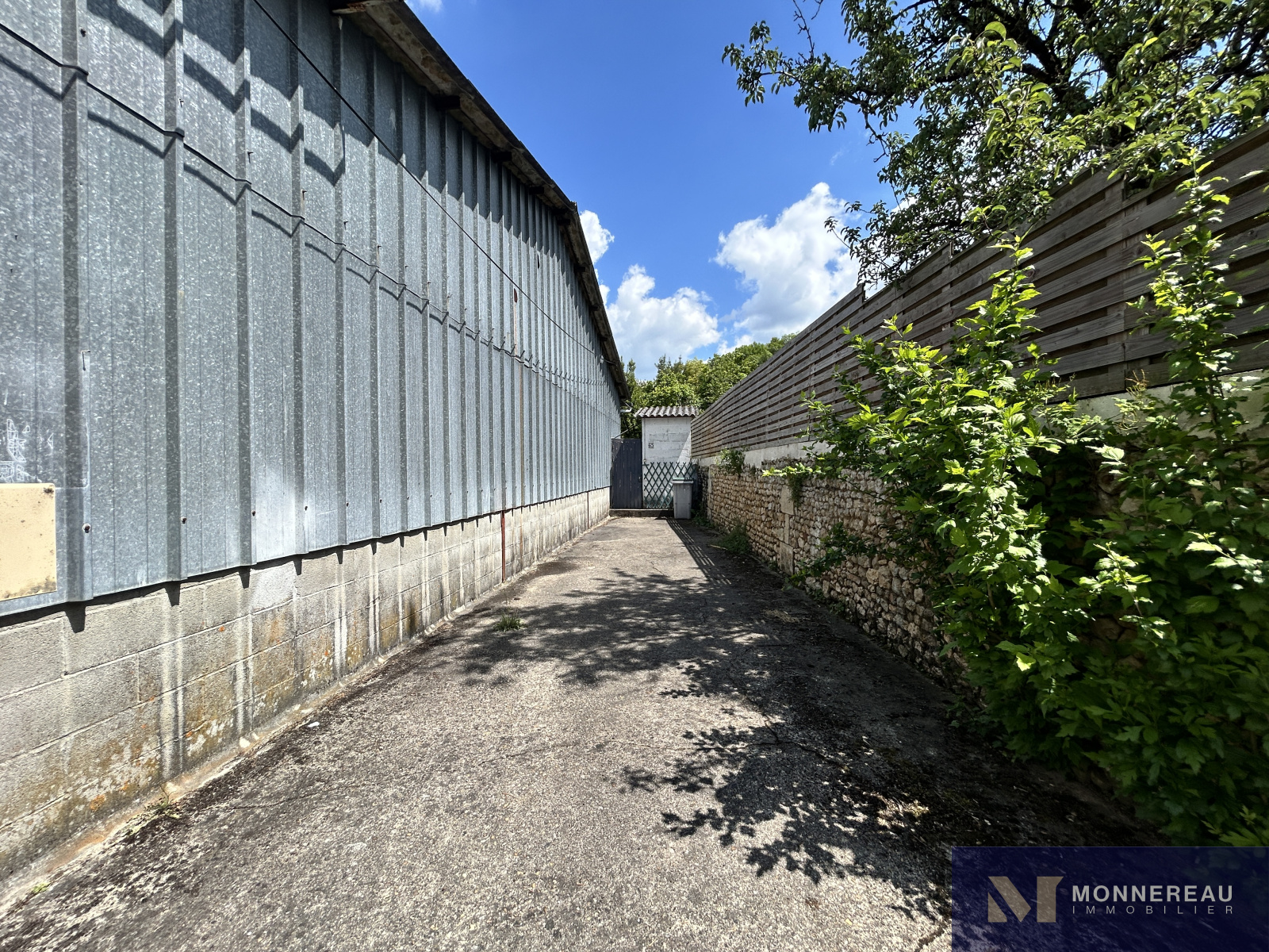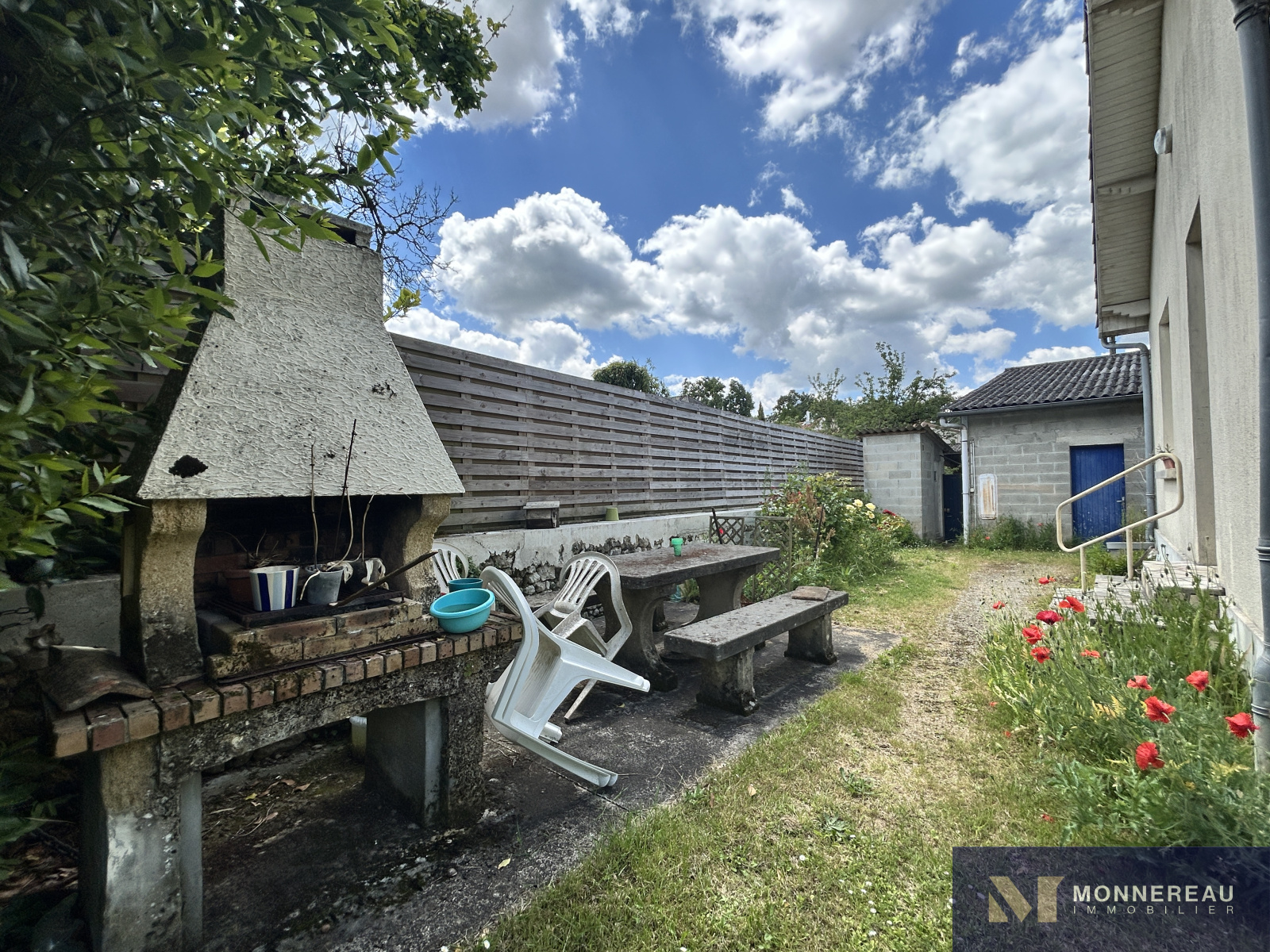 BAIGNES (16) - Proche échangeur N10 pour BORDEAUX et ANGOULEME - Au coeur du bourg, services et écoles à pied - Maison individuelle d'environ 76 m² habitables de plain pied construite en 1970 sur un terrain clos et arboré de 687 m². Entrée, cuisine équipée, séjour avec cheminée/insert, salle de bains et deux chambres. Chauffage électrique. Menuiseries PVC double vitrage. Assainissement par tout à l'égout. Des travaux de remise aux goût du jour sont à prévoir mais c'est habitable en l'état. Cave, barbecue et puits. Ancien garage automobile professionnel d'environ 210 m² au sol sur le côté rue. L'habitation est située sur l'arriére entourée d'un jardin charmant. Exclusivité !