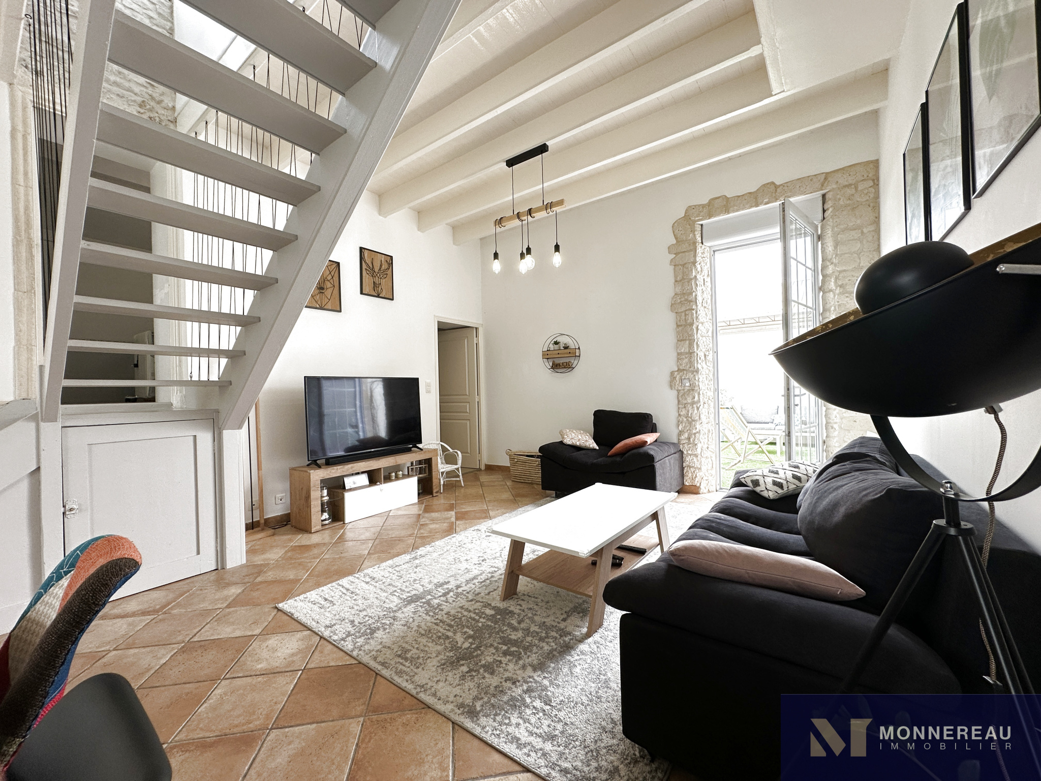 SEMUSSAC (17) - A quelques minutes des plages de Royan et Meschers, cette jolie maison en pierre apparente allie charme de l’ancien et confort moderne. Entièrement rénovée en 2019 avec des matériaux de qualité, elle offre un cadre de vie chaleureux et élégant. Dès l’entrée, vous serez séduits par le grand salon ouvert sur la cuisine, baigné de lumière et décoré avec goût. L’espace de vie de 40 m² est convivial et fonctionnel, parfait pour partager de beaux moments en famille ou entre amis. La maison dispose de trois chambres spacieuses dont une suite parentale de 35 m² au rez-de-chaussée. La rénovation met en valeur le caractère de la pierre, tout en intégrant des éléments contemporains pour un parfait équilibre. Adoucisseur, double vitrage, baignoire balnéo, annexe de rangement, atelier, buanderie, cellier. De chaque côté de la maison vous trouverez deux jolies terrasses. Elles permettent de profiter des deux espaces extèrieurs intimes et bien aménagés. Cette maison bénéficie d’un emplacement privilégié, au calme de la campagne et à quelques minutes des services. Très proche du littoral, plages de Meschers et Saint-Georges-de-Didonne à moins de 10 min.