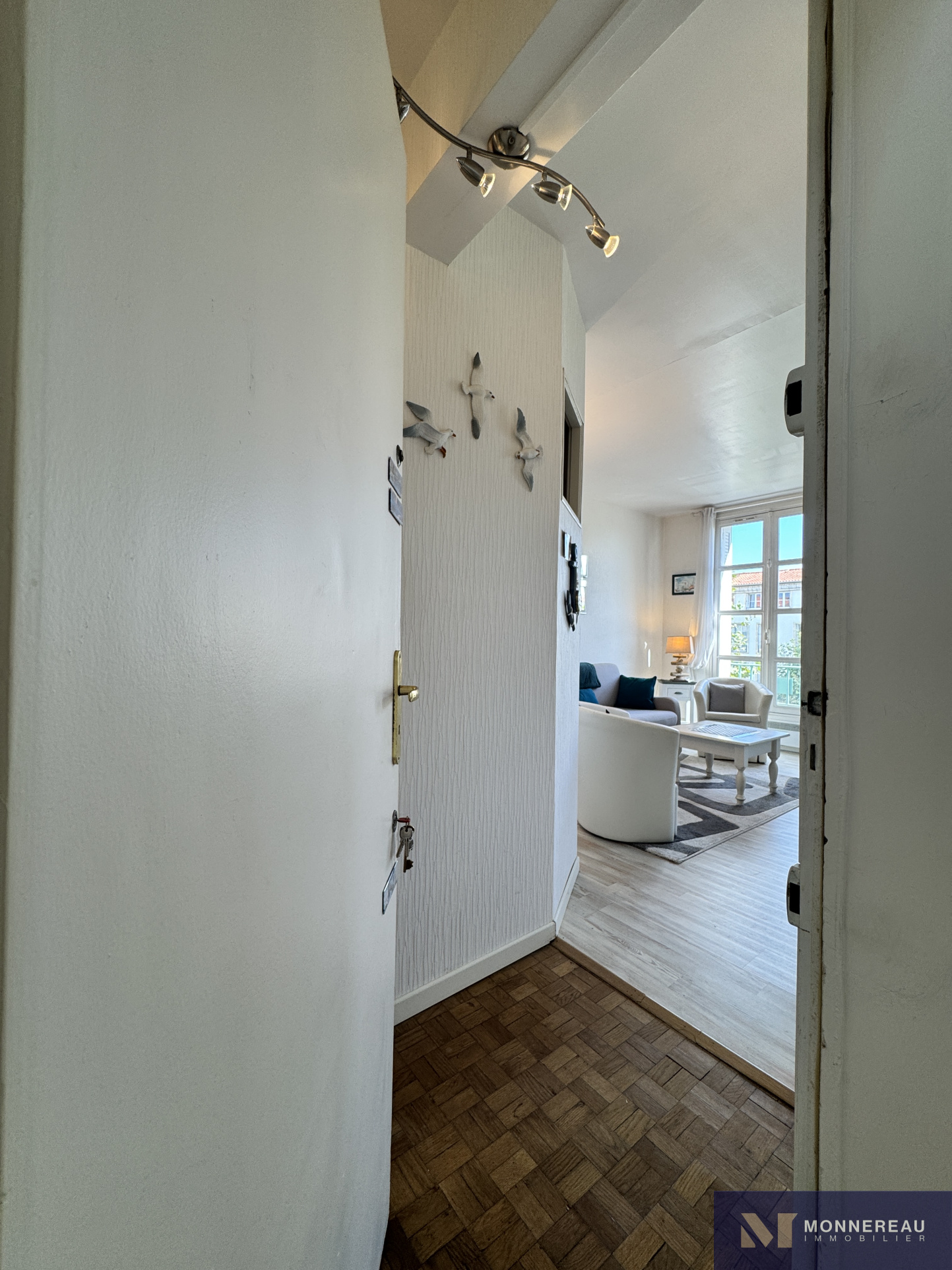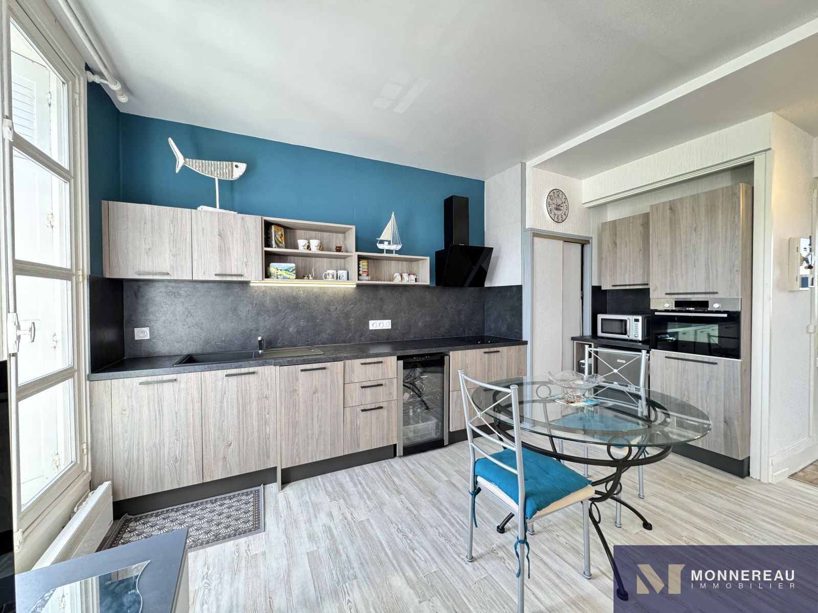 ROYAN (17) - EXCLUSIVITE MONNEREAU IMMOBILIER ROYAN. Idéalement situé en plein centre ville de Royan, à seulement 150 mètres de la plage et autant du marché, cet appartement au deuxième étage offre un cadre de vie privilégié entre dynamisme urbain et douceur balnéaire. Entièrement renové avec soin, il se distingue par son état impeccable et ses belles prestations. Avec une surface de 41,41 m² loi Carrez, il dispose d'une pièce de vie lumineuse avec sa cuisine équipée quasi neuve et d'une chambre indépendante avec grand placards/dressing. Petite salle d'eau, wc séparé. Niché dans un immeuble typique de la reconstruction, il est très bien entretenu. Espace dans les communs pour les vélos. Petite copropriété constituée de 4 lots. Association syndicale sans frais. Et les deux cent sept millièmes de la propriété du sol et des parties communes générales.