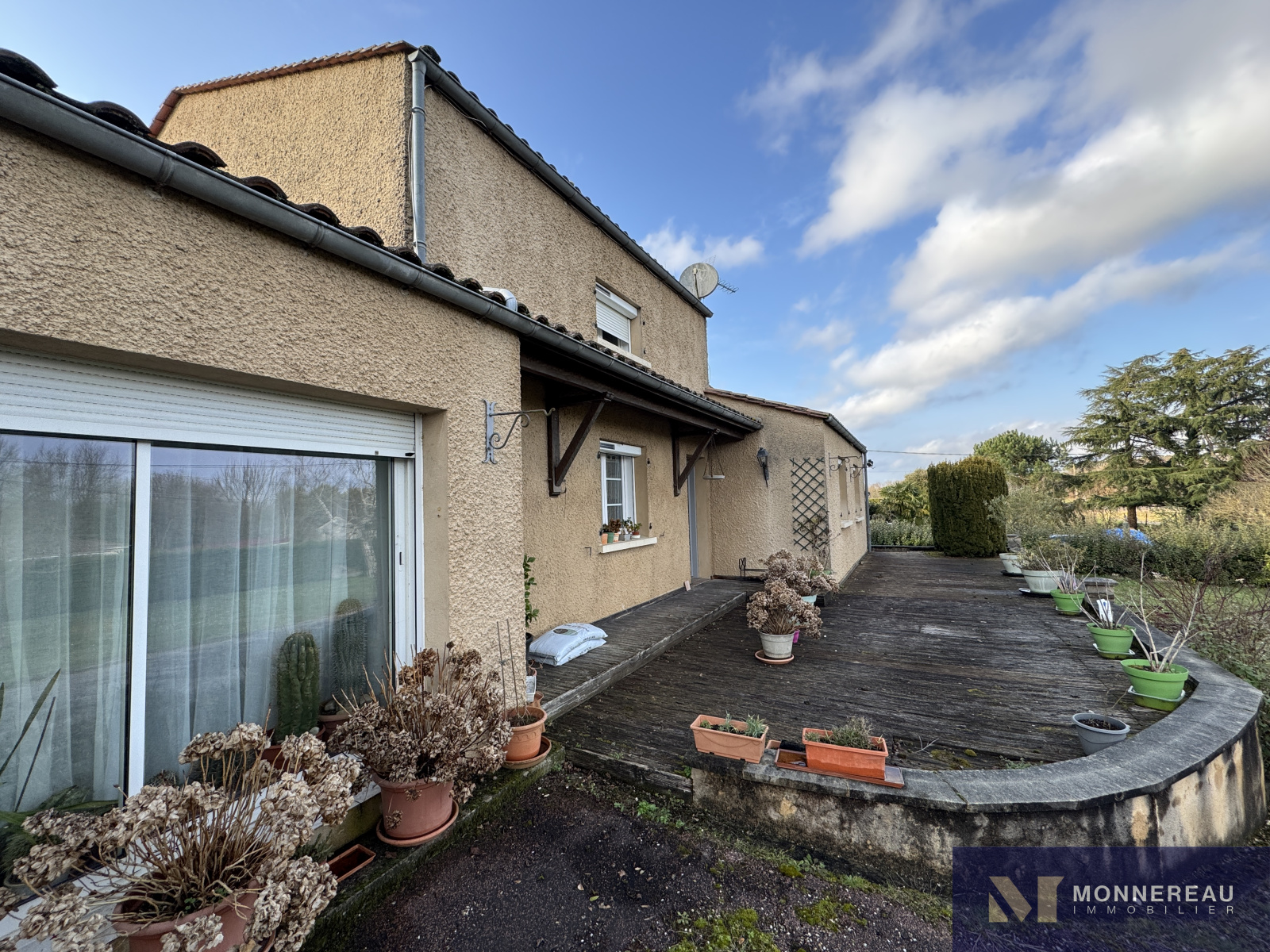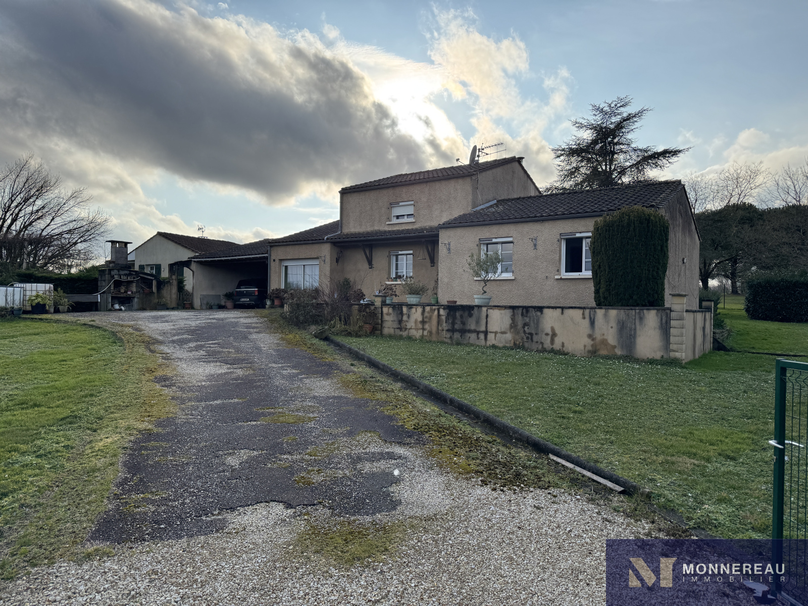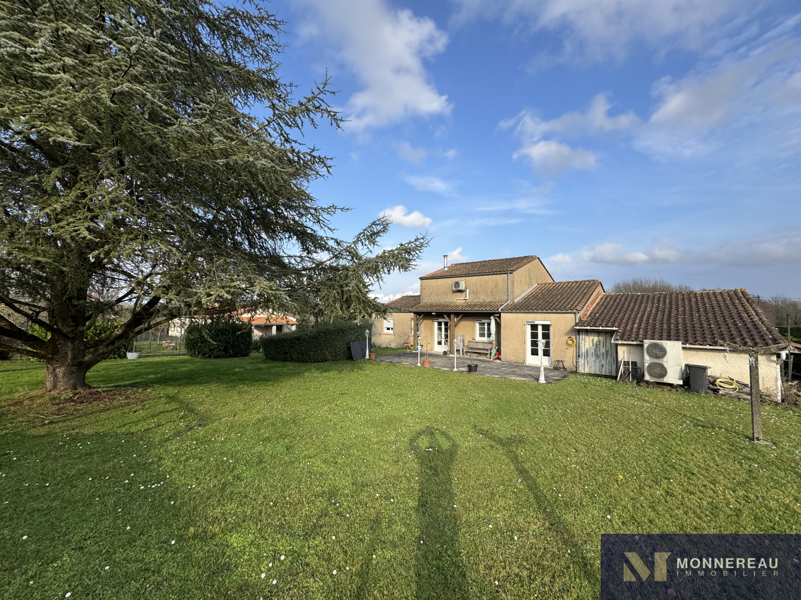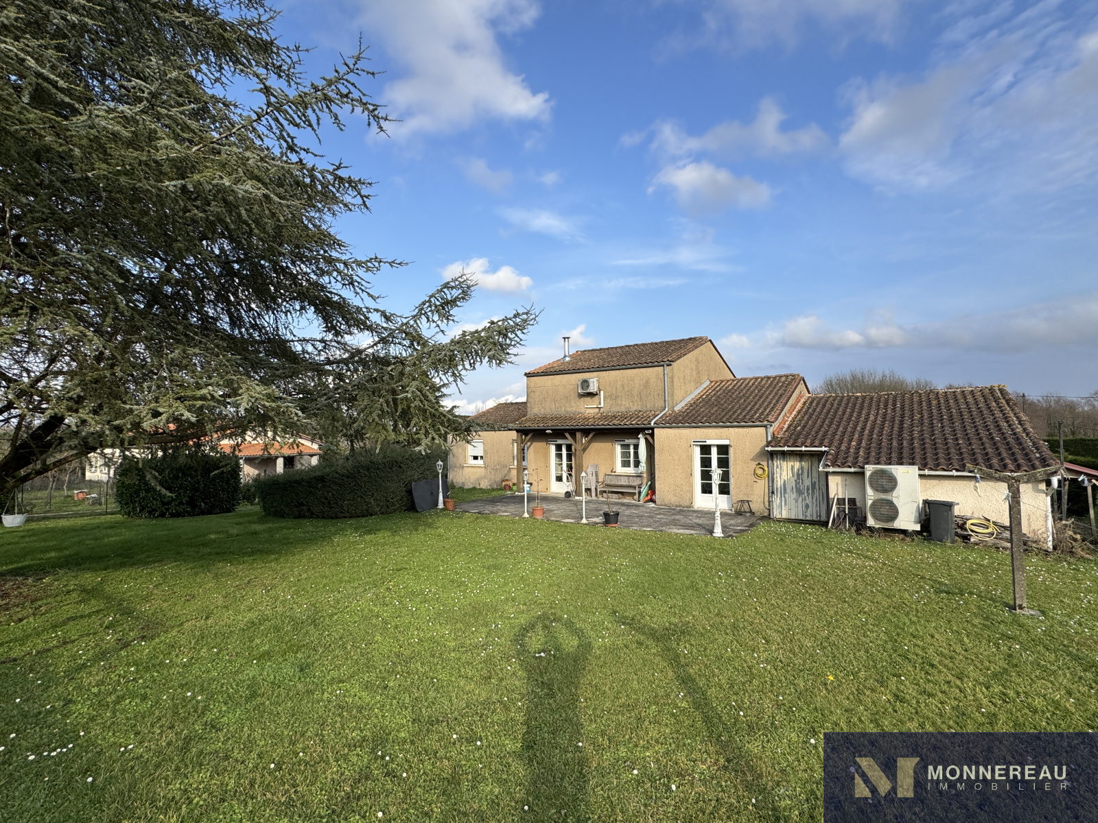 Entre BARBEZIEUX et BAIGNES - Maison individuelle de 130 m² habitables construite en 1982 sur un terrain arboré d'environ 3180 m². Vous serez séduit par les volumes de la pièce de vie avec une partie cuisine équipée et une mezzanine. Salon dans la continitué qui d'ouvre sur une terrasse bien exposée. Chauffage au sol par pompe à chaleur. Appentis de 50 m² à usage de garage , cave, abris. Des travaux de modernisation et de rafraichissement sont à prévoir dans la partie nuit mais c'est parfaitement habitable. Le terrain en deux parties cloturées est idéal pour ceux qui ont besoin d'espace. Accès indépendant au terrain sur l'arrière avec hangar et atelier. Situation très agréable.