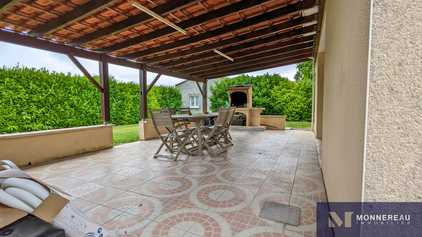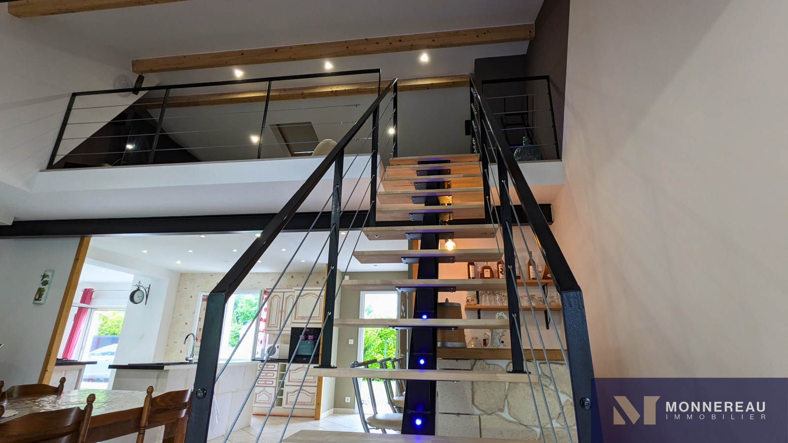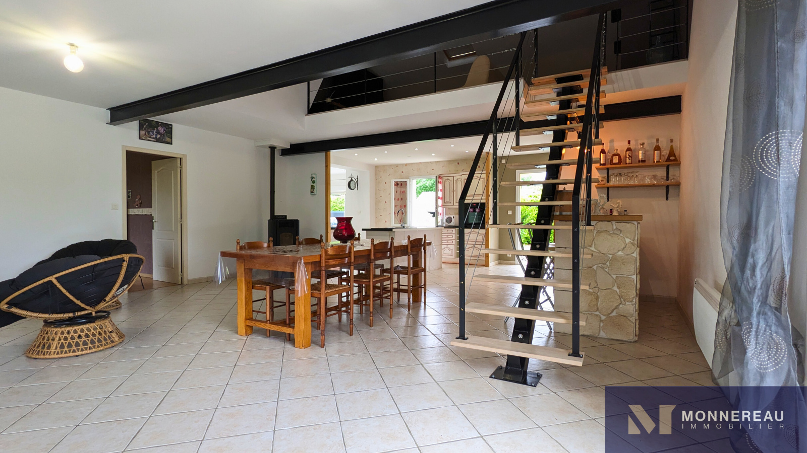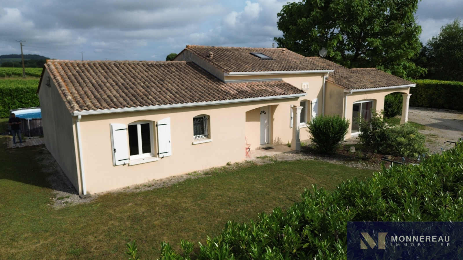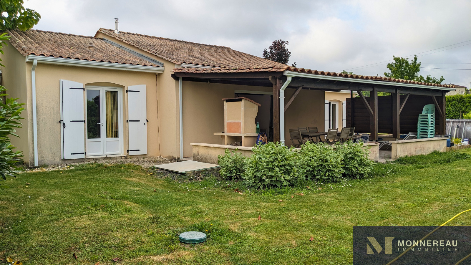 Entre Angoulême et Cognac - Proche CHATEAUNEUF (16) - Située dans un environnement calme, à la campagne, cette charmante maison est édifiée sur un terrain de 2100 m² arboré à proximité des commodités. La pièce de vie spacieuse et lumineuse est parfaite pour recevoir. Cuisine ouverte équipée d’un coin bar sous l’escalier très conviviale. L’espace salle à manger profite d’une belle hauteur sous plafond, renforçant la sensation d’espace et de confort. Trois chambres de plain-pied et salle de bains. Mezzanine au potentiel d’aménagement supplémentaire : chambres, bureau ou salle de jeux… La décoration est sobre, moderne, idéale pour une vie de famille active et facile d'entretien. Terrasse couverte. Un bâtiment indépendant à usage de garage avec abri à camping car fera le bonheur de ceux qui ont besoin d'espace pour stocker ou pour un atelier. Annexe. C'est un bel ensemble !