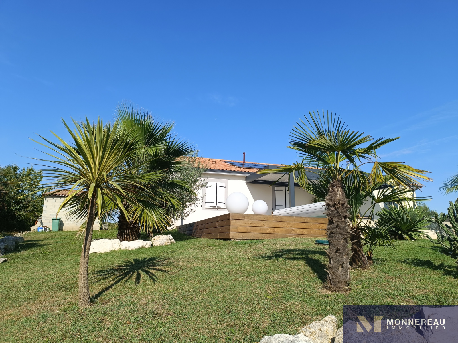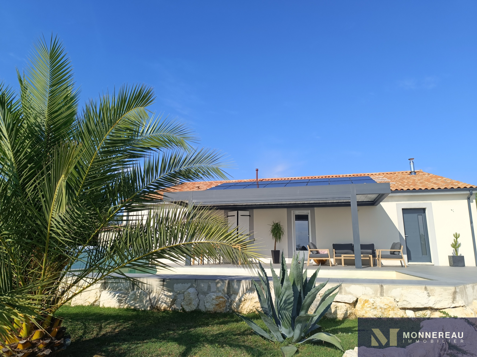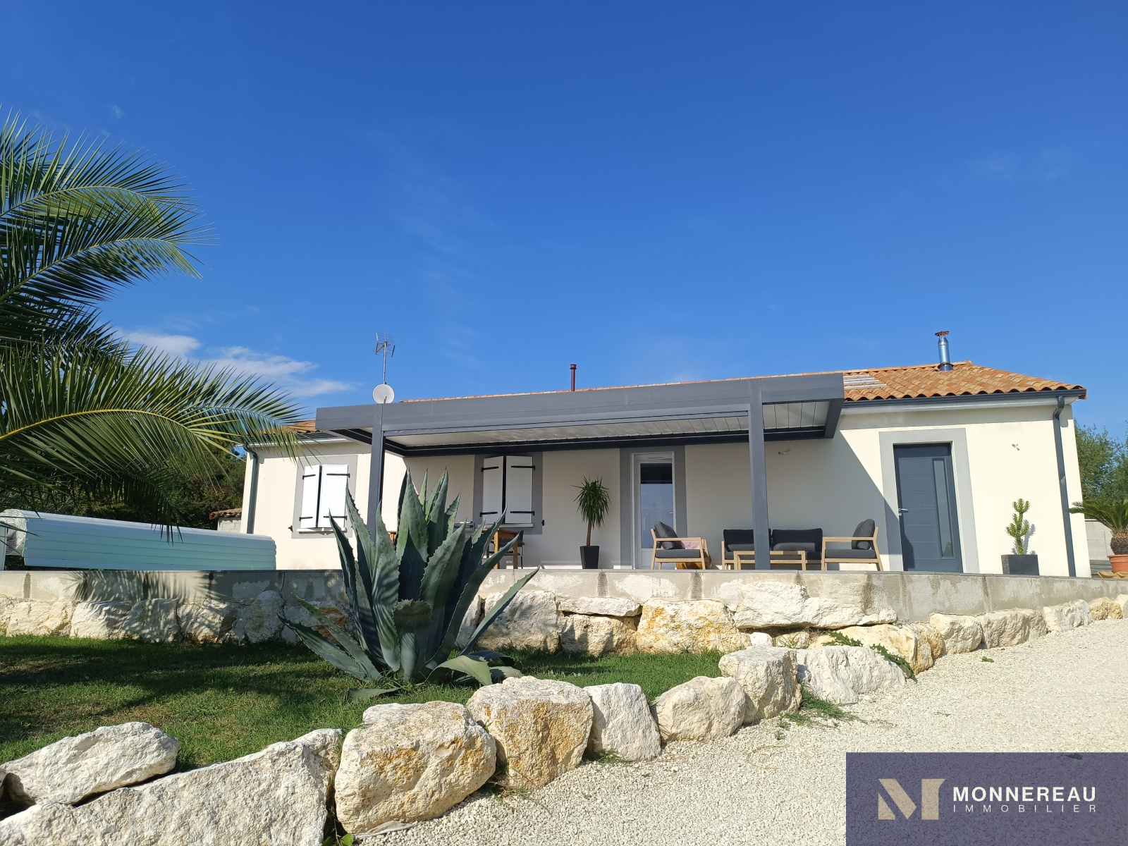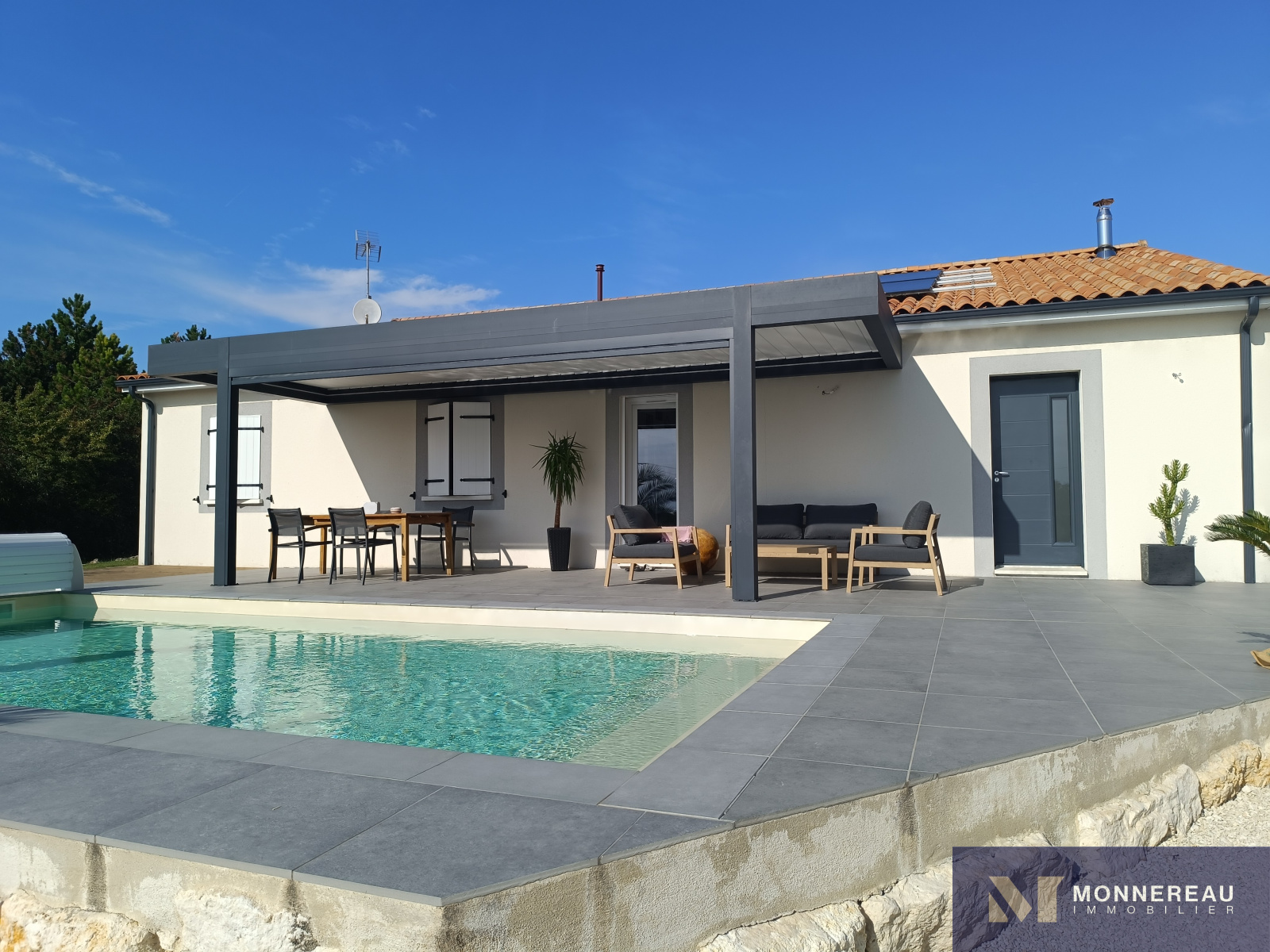 Entre BARBEZIEUX et CHATEAUNEUF (16) - Proche échangeur N10 pour BORDEAUX et ANGOULEME - Agréable maison dont la construction s'est terminée en 2018. Elle offre 132 m² habitables de plain-pied sur une parcelle d'environ 965 m². Belle pièce de vie de 73 m² très lumineuse avec cuisine équipée. Poêle à bois. Ce séjour profite d'un accès direct sur une vaste terrasse bois avec jacuzzi. La partie nuit se compose de trois chambres, dont une avec dressing. Salle d'eau et buanderie/chaufferie. Chauffage au sol par pompe à chaleur. Production électrique par panneaux solaires. Un soin tout particulier a été porté sur l'aménagement des extérieurs. Joliment paysagé, le jardin souligne parfaitement le style de la maison. L'espace piscine est mis en beauté par une autre terrasse bois et une pergola bio climatique. C'est très convivial. Mitoyenneté sur un côté, sans vis à vis. On pose ses valises ! Aucun travaux à prévoir.