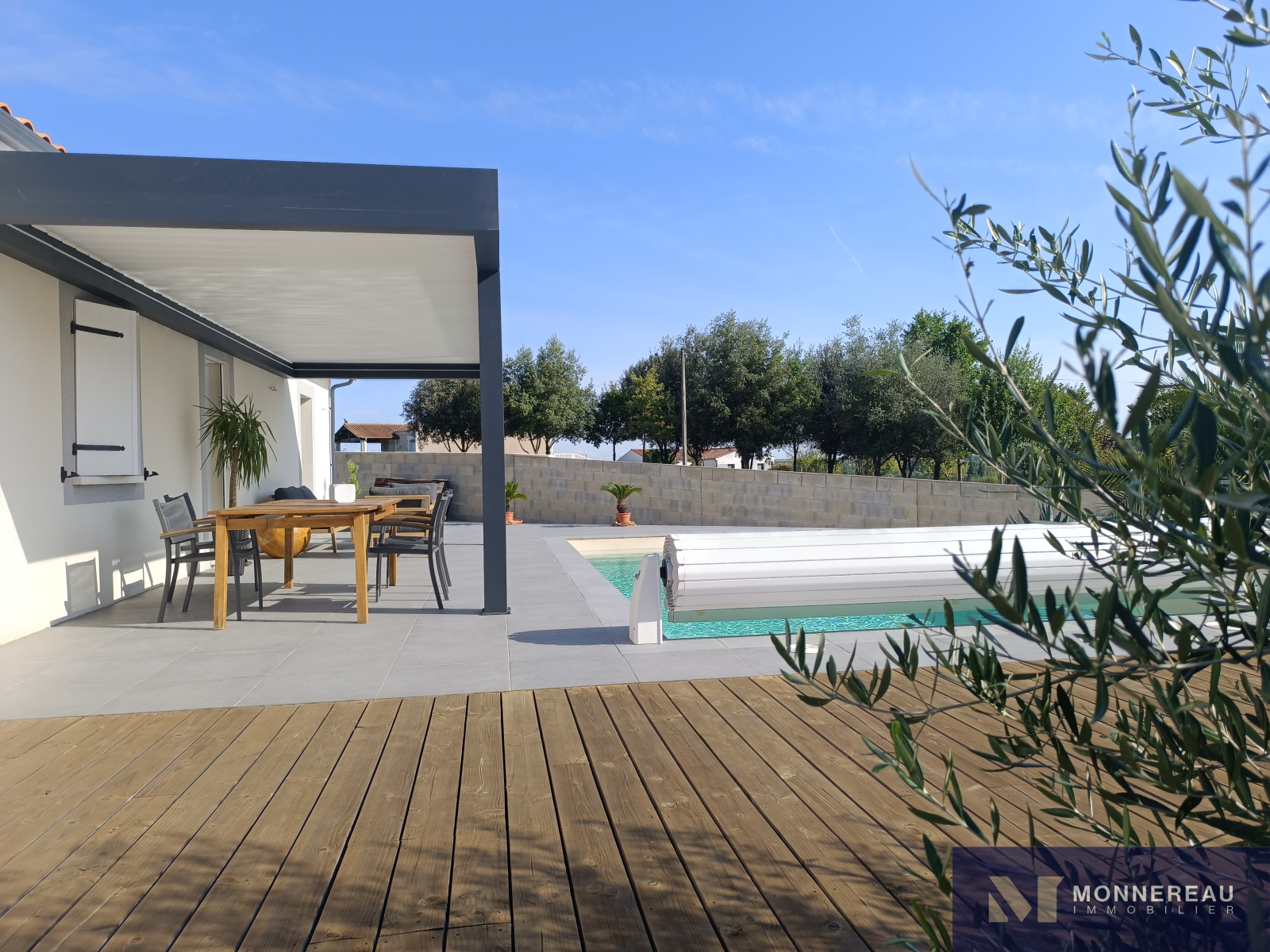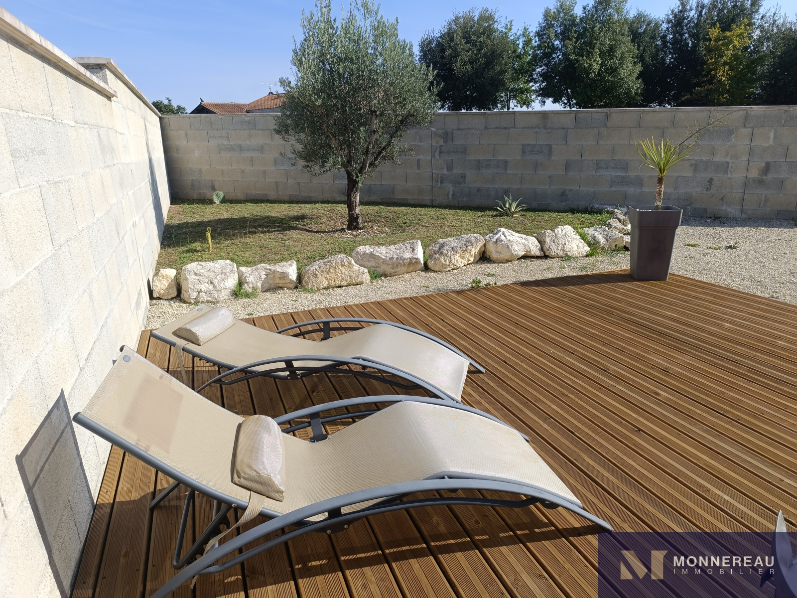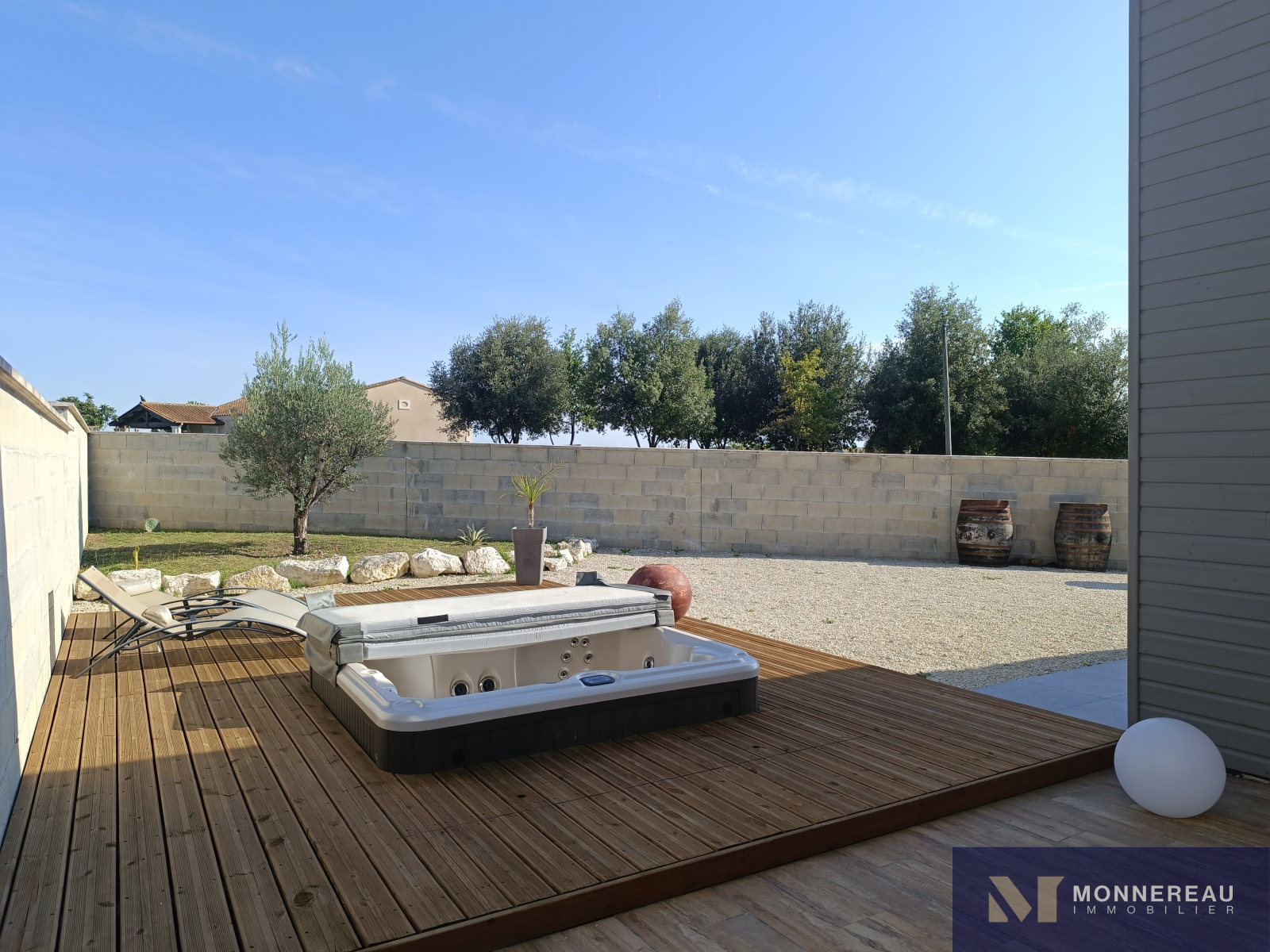 Entre BARBEZIEUX et CHATEAUNEUF (16) - Proche échangeur N10 pour BORDEAUX et ANGOULEME - Agréable maison dont la construction s'est terminée en 2018. Elle offre 132 m² habitables de plain-pied sur une parcelle d'environ 965 m². Belle pièce de vie de 73 m² très lumineuse avec cuisine équipée. Poêle à bois. Ce séjour profite d'un accès direct sur une vaste terrasse bois avec jacuzzi. La partie nuit se compose de trois chambres, dont une avec dressing. Salle d'eau et buanderie/chaufferie. Chauffage au sol par pompe à chaleur. Production électrique par panneaux solaires. Un soin tout particulier a été porté sur l'aménagement des extérieurs. Joliment paysagé, le jardin souligne parfaitement le style de la maison. L'espace piscine est mis en beauté par une autre terrasse bois et une pergola bio climatique. C'est très convivial. Mitoyenneté sur un côté, sans vis à vis. On pose ses valises ! Aucun travaux à prévoir.