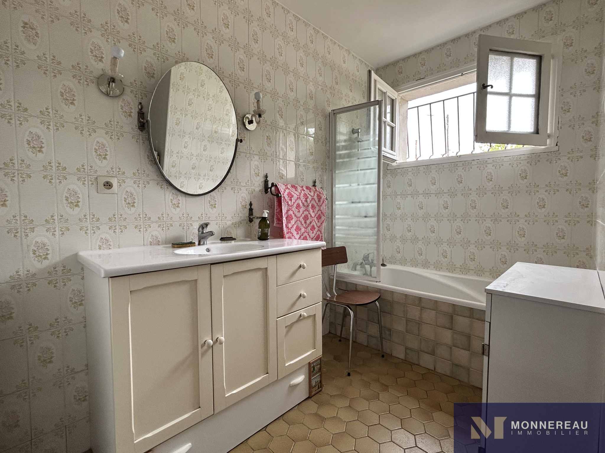 sol carrelage, baignoire, lavabo et séche serviette