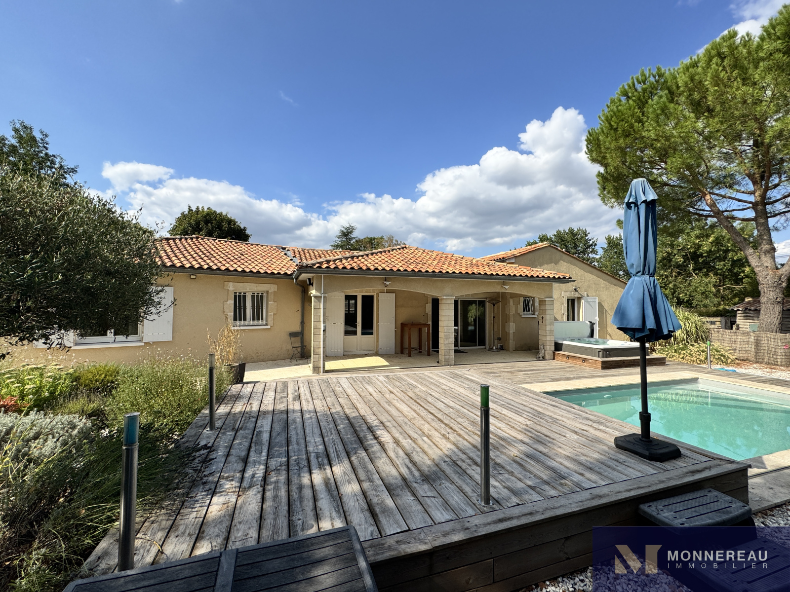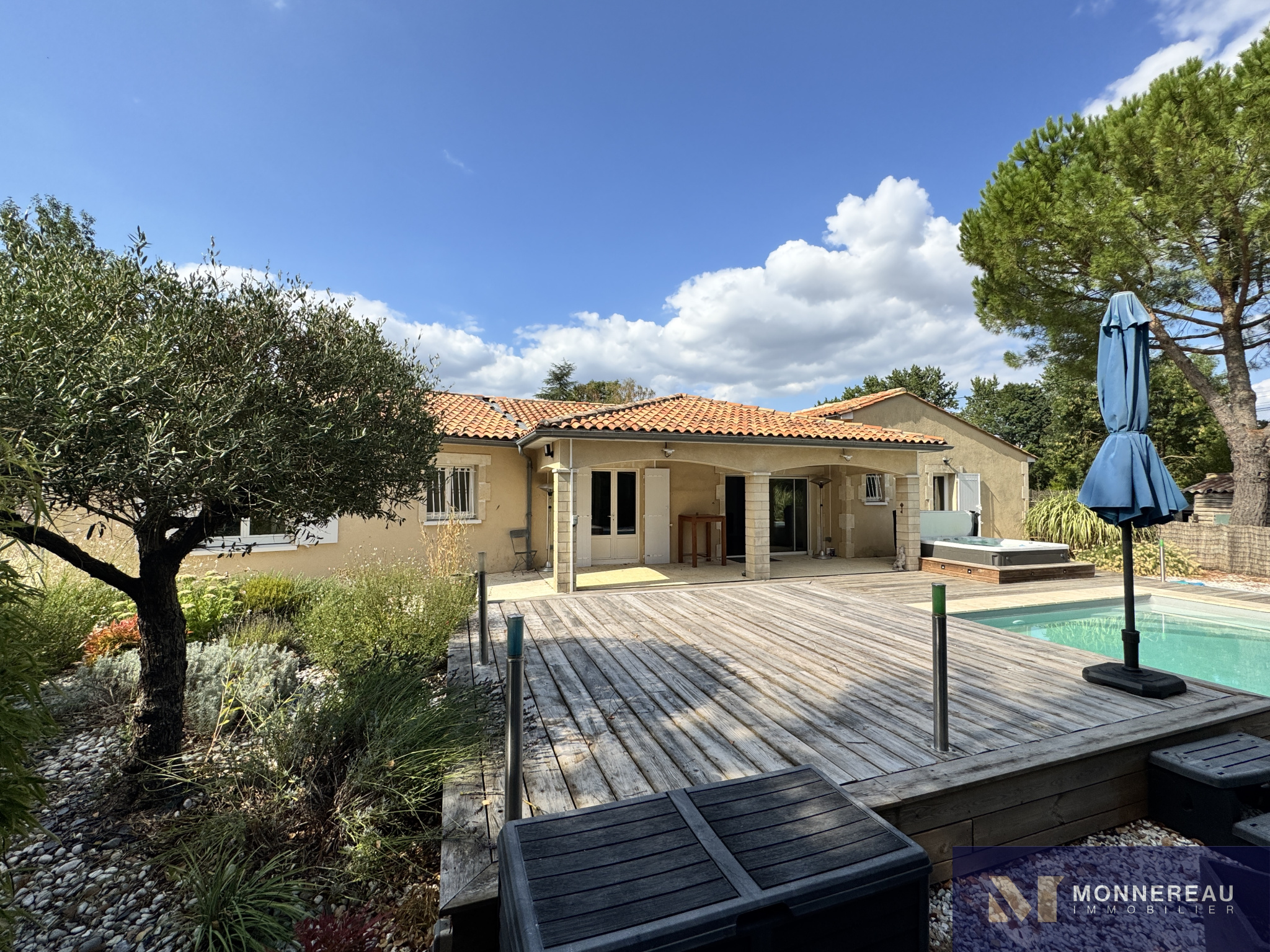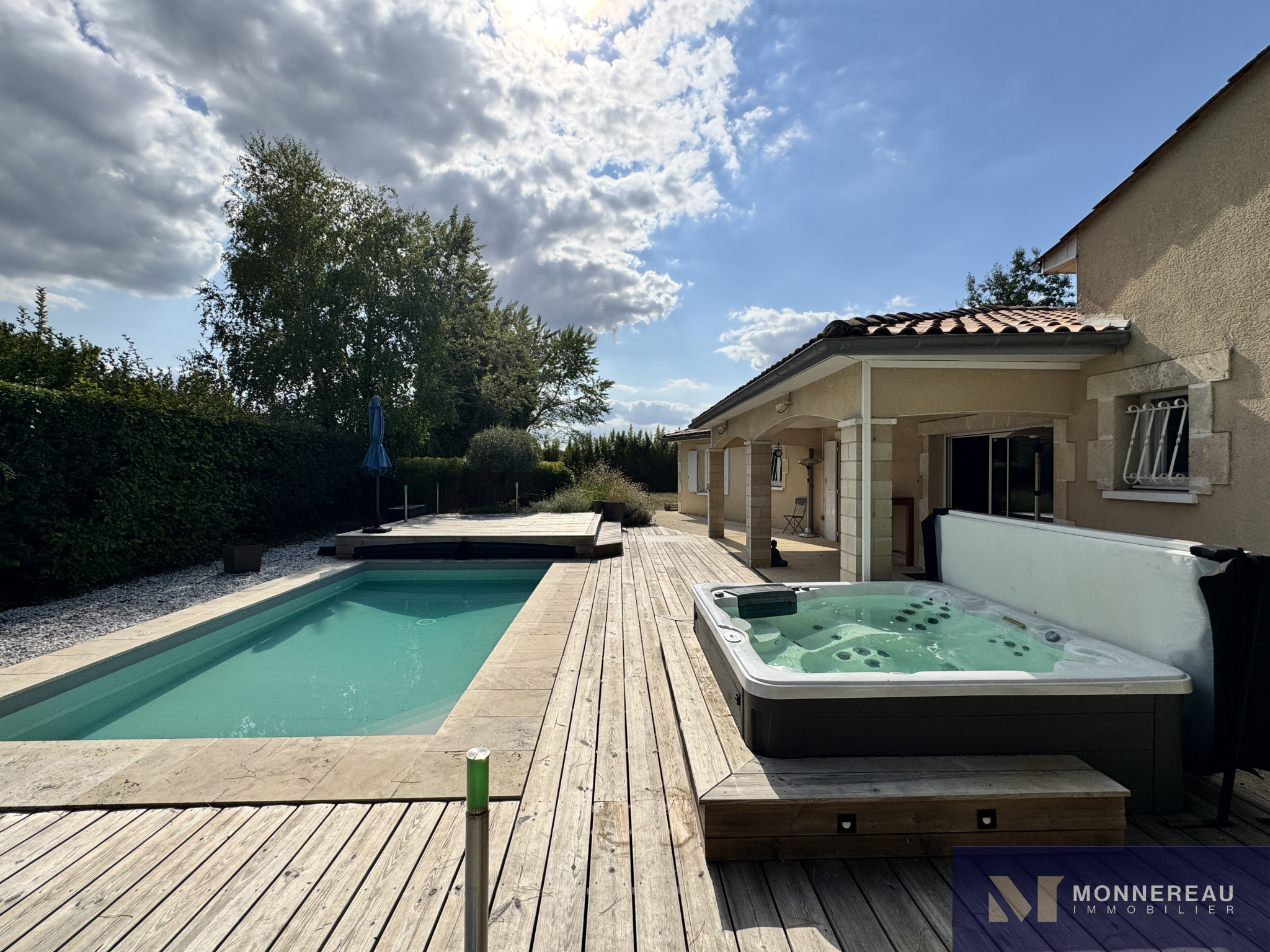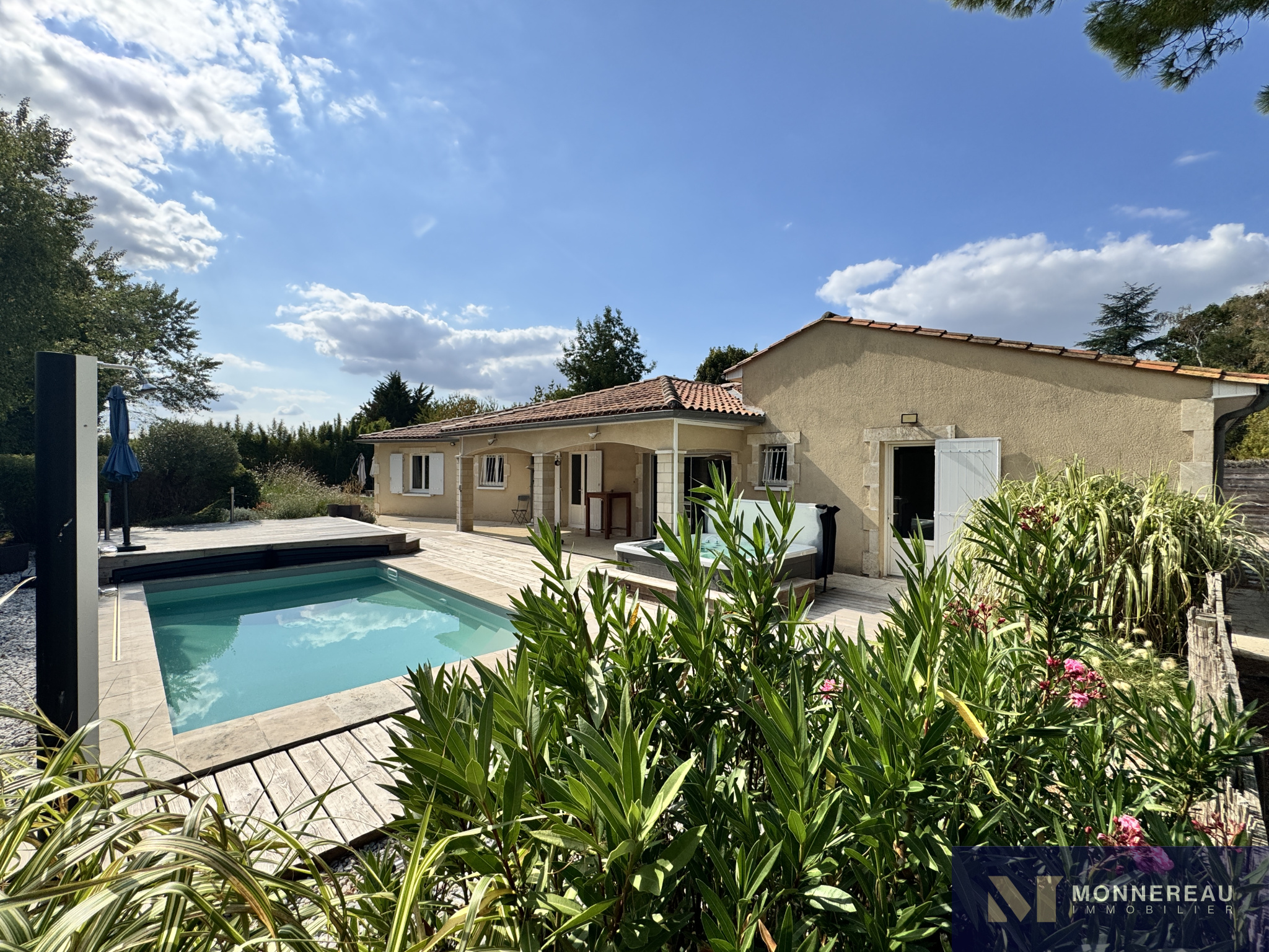 Proche de BARBEZIEUX (16) - A 3 mn de la ville, des écoles et services, maison individuelle de plain-pied d'environ 180 m² habitables édifiée sur un terrain clos de 1589 m². Vous serez séduit par l'espace piscine chauffée avec jaccuzi 6 places créé récemment. Terrasse couverte. Couverture de la piscine chauffée rétractable. Elle se glisse sous la terrasse bois surélevée. On se croirait en vacances. Beau séjour traversant avec cuisine ouverte. Grand salon séparé. Bureau ou quatrième chambre avec point d'eau et accès indépendant. Partie nuit séparée avec trois chambres et salle de bains avec douche à l'italienne. Agréable jardin clos arboré et paysager. Terrain de pétanque. Double garage indépendant avec grenier. Très belles prestations ! Exclusivité !