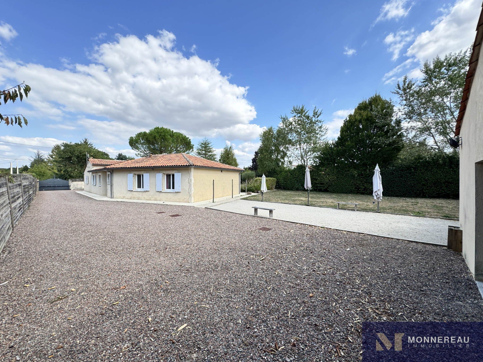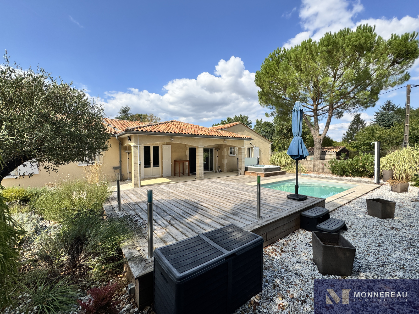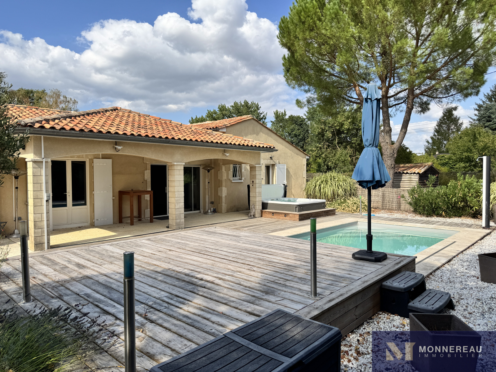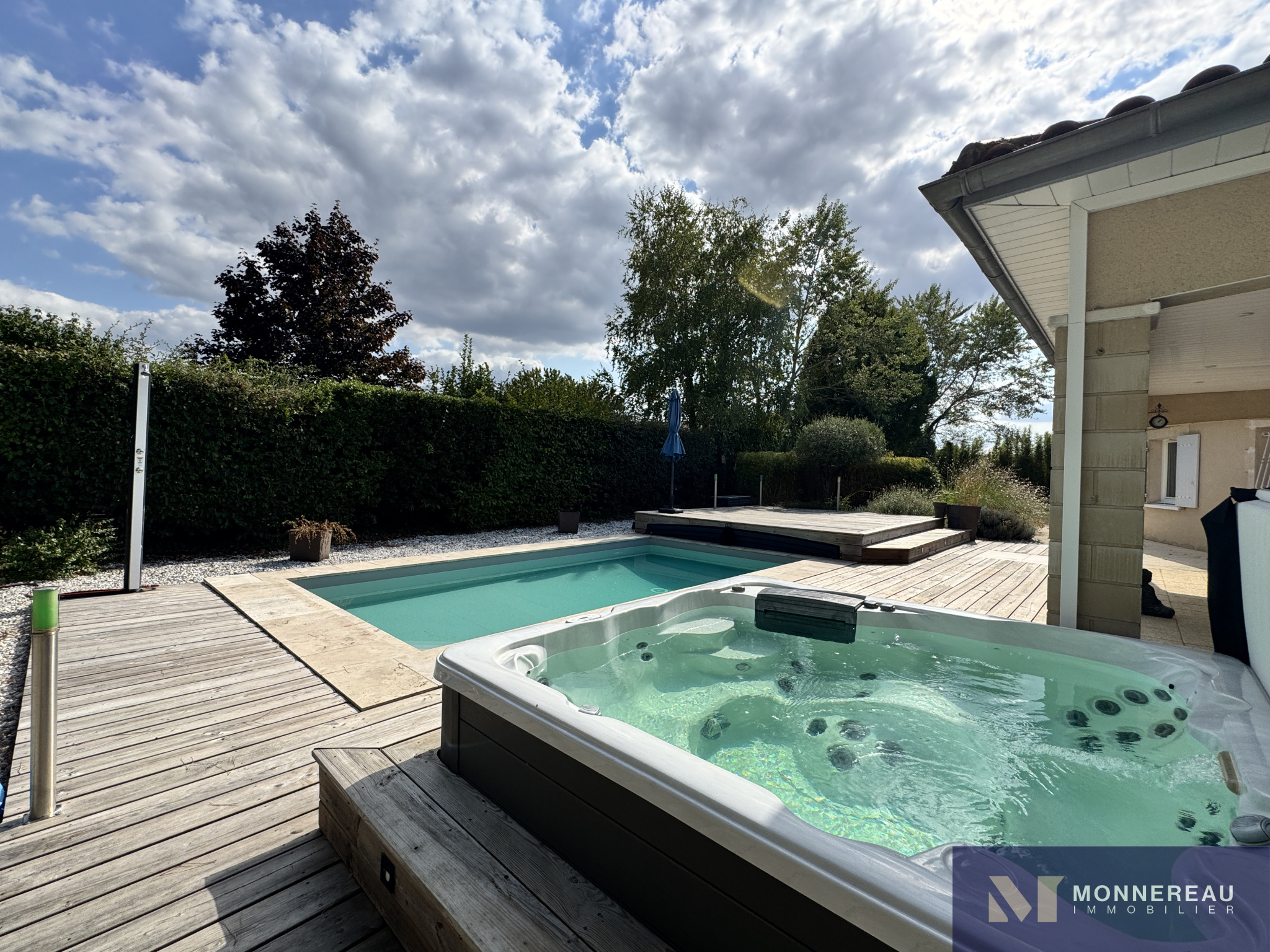 Proche de BARBEZIEUX (16) - A 3 mn de la ville, des écoles et services, maison individuelle de plain-pied d'environ 180 m² habitables édifiée sur un terrain clos de 1589 m². Vous serez séduit par l'espace piscine chauffée avec jaccuzi 6 places créé récemment. Terrasse couverte. Couverture de la piscine chauffée rétractable. Elle se glisse sous la terrasse bois surélevée. On se croirait en vacances. Beau séjour traversant avec cuisine ouverte. Grand salon séparé. Bureau ou quatrième chambre avec point d'eau et accès indépendant. Partie nuit séparée avec trois chambres et salle de bains avec douche à l'italienne. Agréable jardin clos arboré et paysager. Terrain de pétanque. Double garage indépendant avec grenier. Très belles prestations ! Exclusivité !