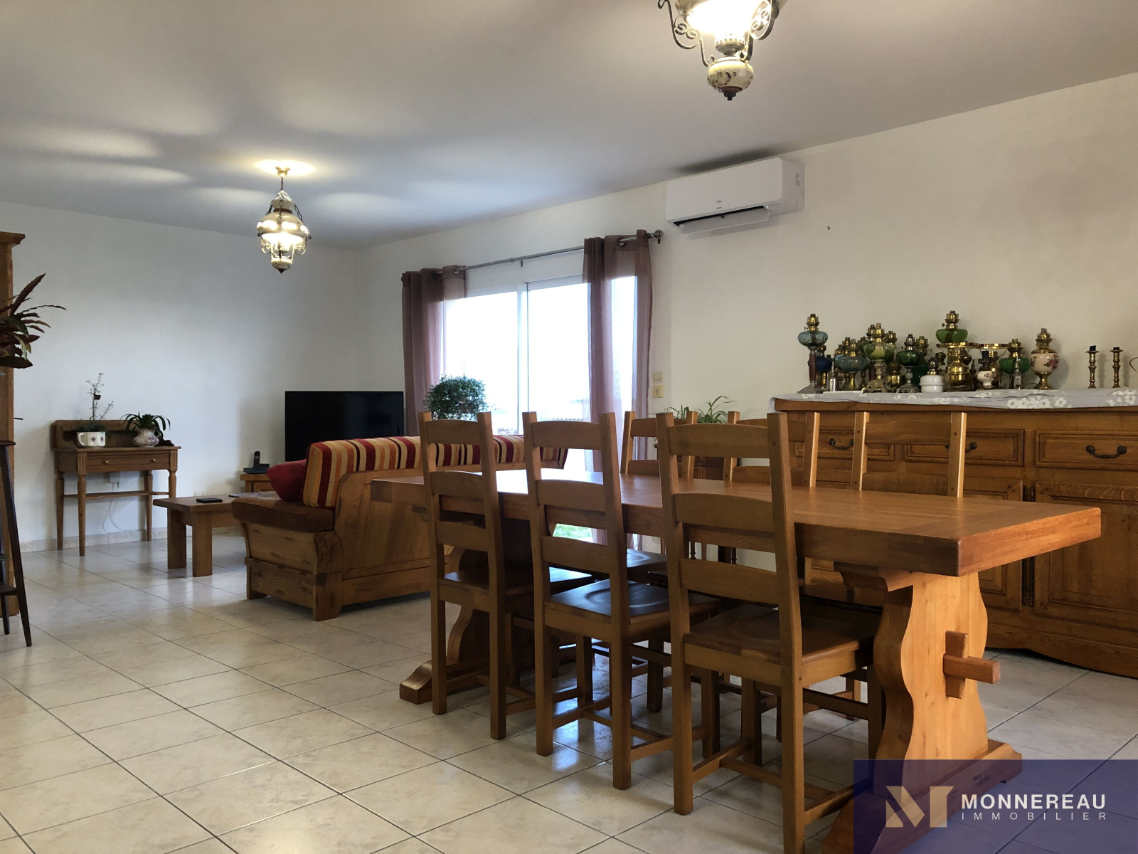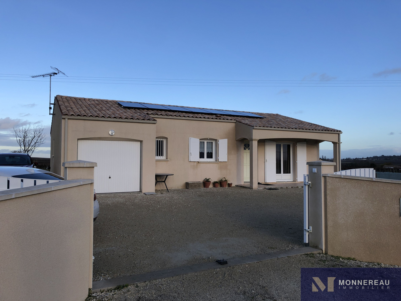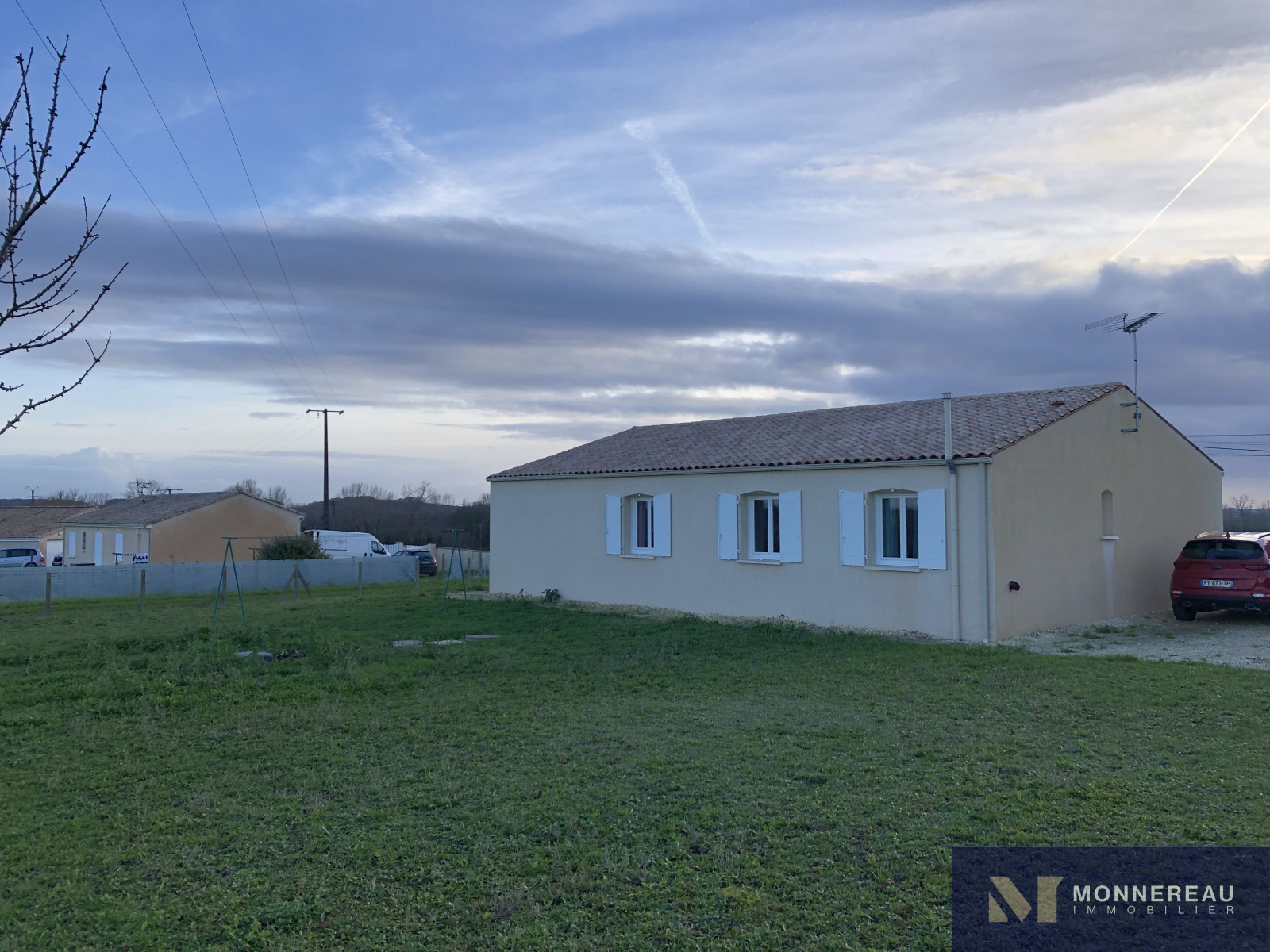 Proche d'ARCHIAC (17) - Maison individuelle d'environ 90 m² habitables de plain-pied. Elle se compose d'une entrée, séjour avec cuisine équipée neuve de 43 m² avec baie vitrée, trois chambres et salle d'eau. Chauffage pompe à chaleur air/air. Garage attenant de 17 m². Jardin clos de 1201 m² avec vue dégagaée sur la campagne saintongeaise.
