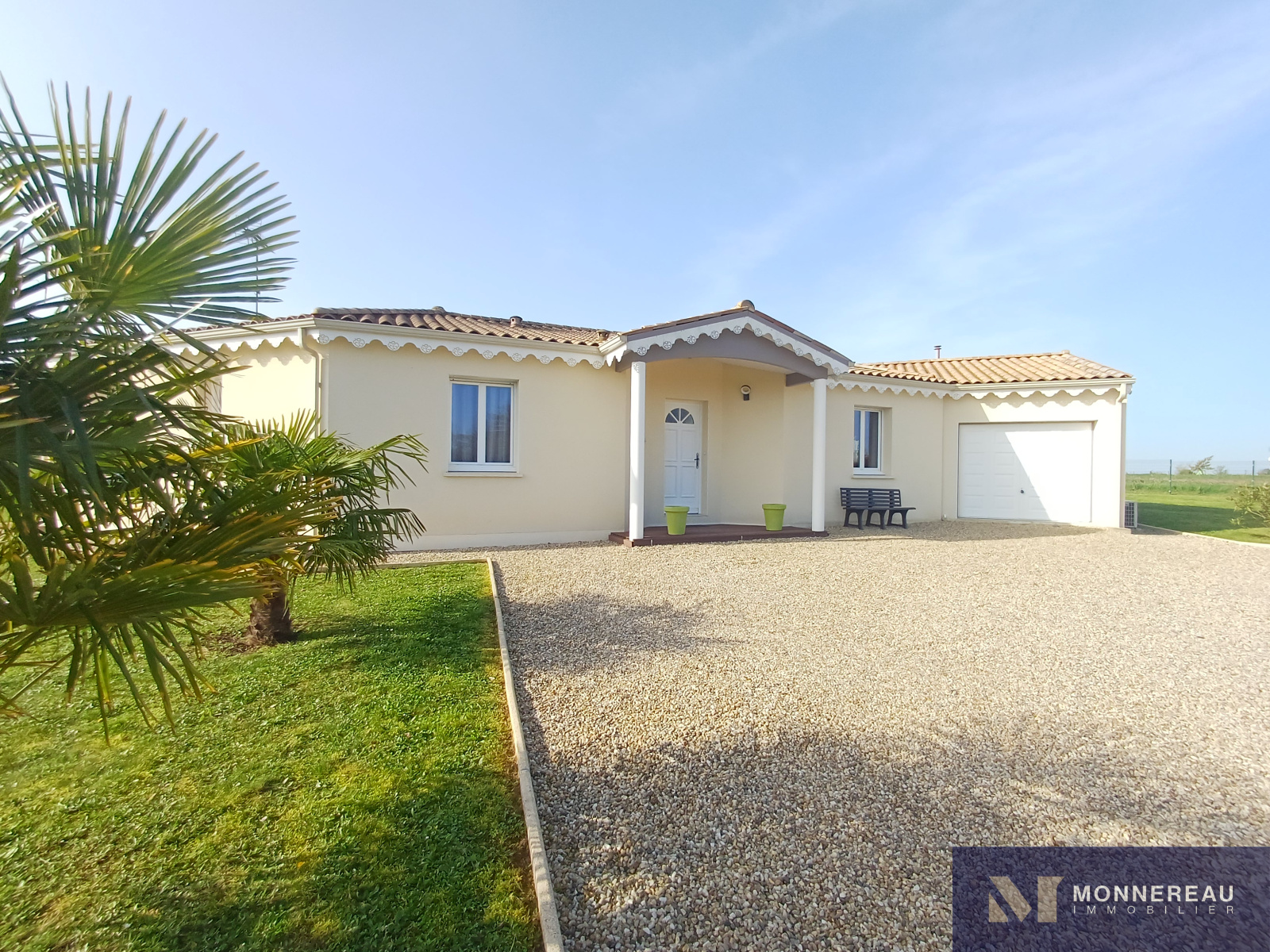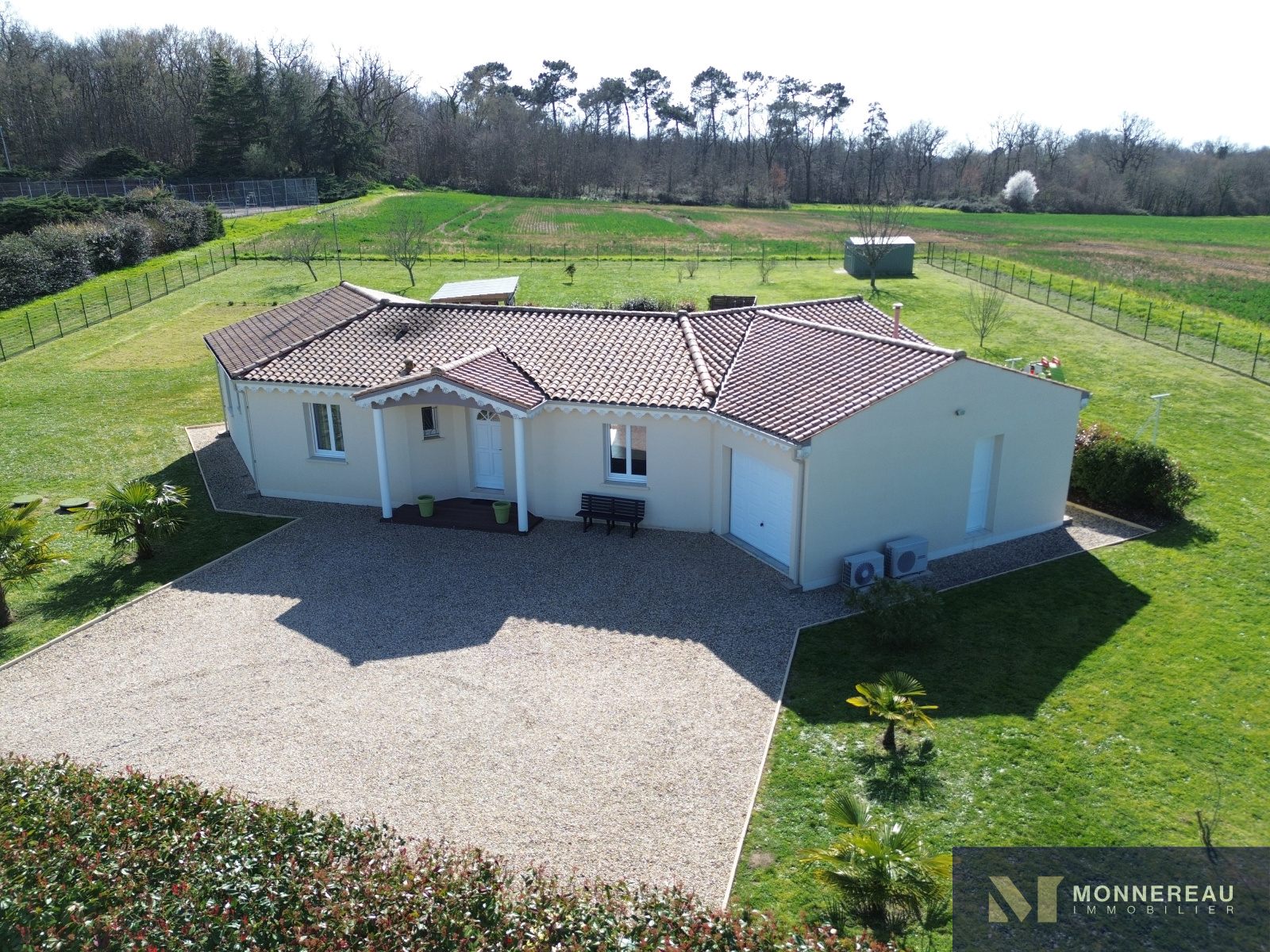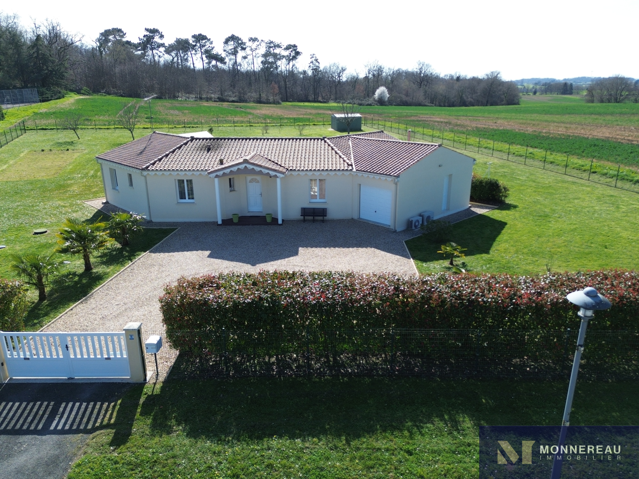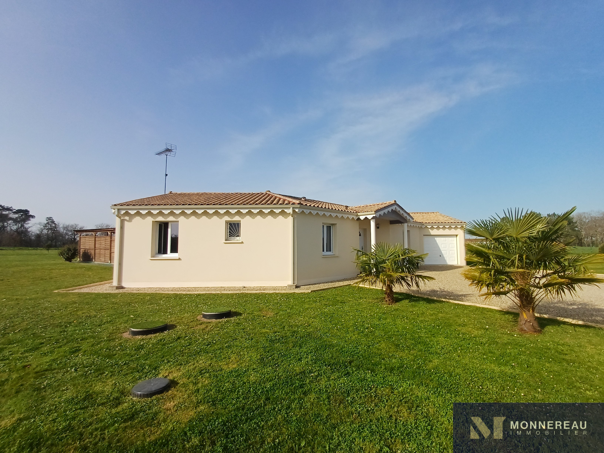 Maison individuelle construite en 2011, développant environ 115 m² habitables de plain-pied, édifiée sur un terrain clos de 2 800 m². Elle en parfait état : entrée, agréable séjour lumineux avec cuisine équipée ouverte, cellier/buanderie, trois chambres dont une suite parentale avec salle d’eau, une seconde salle d’eau et un WC.