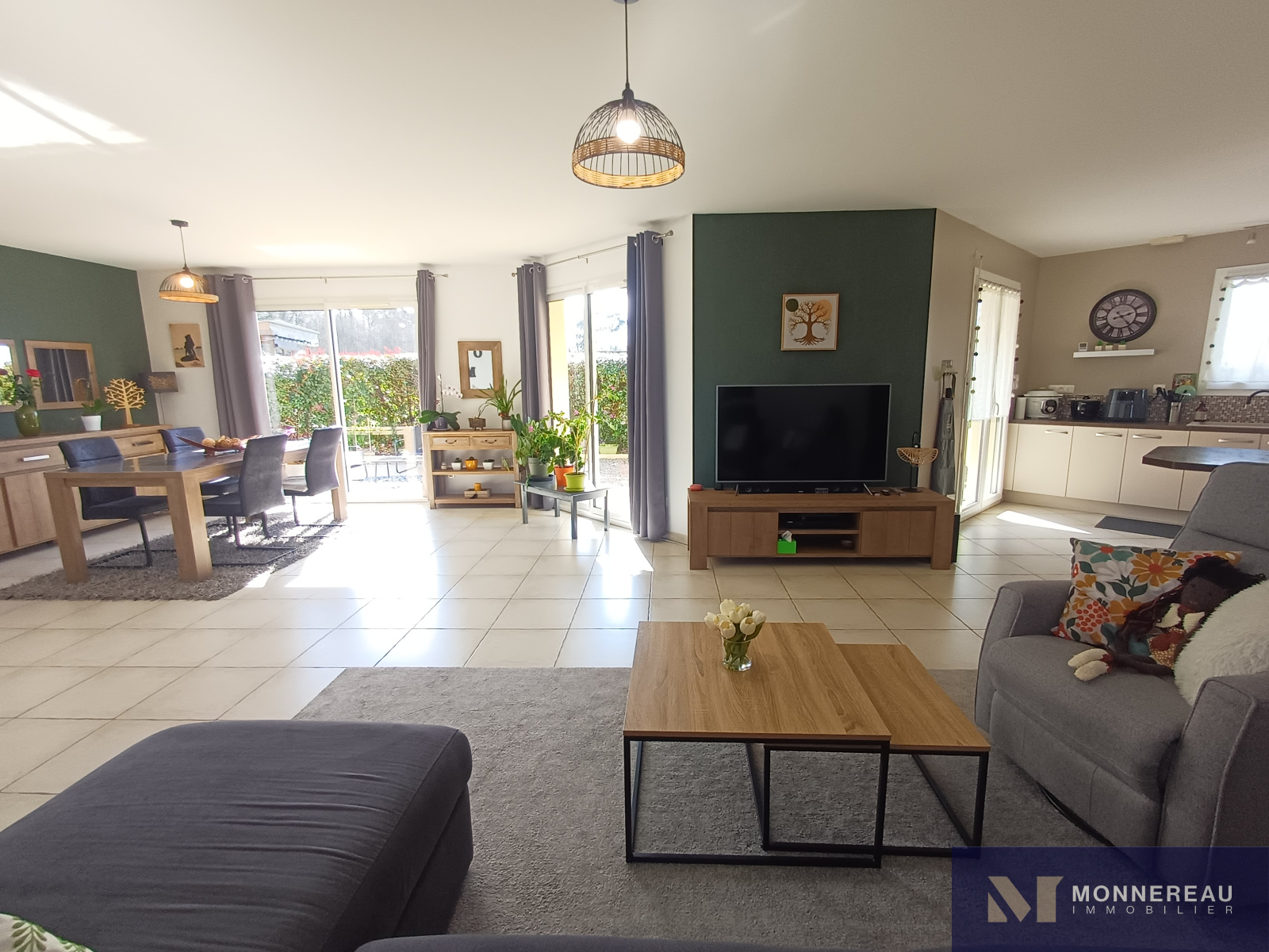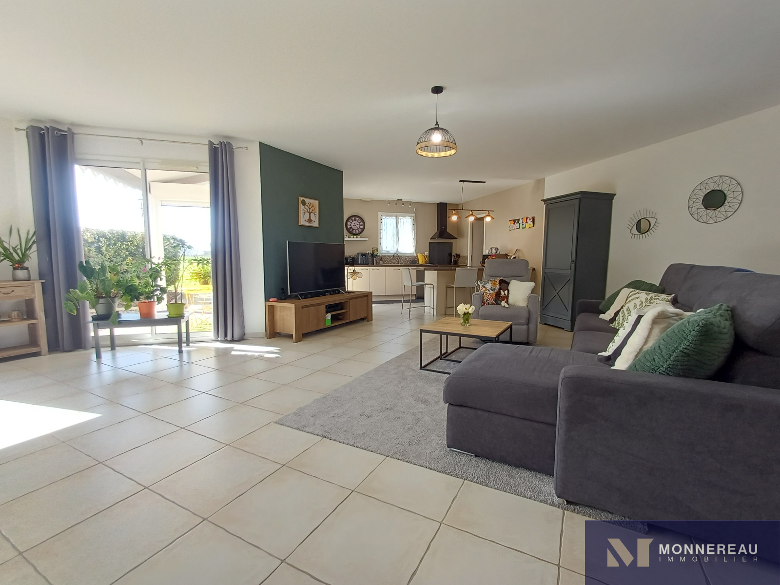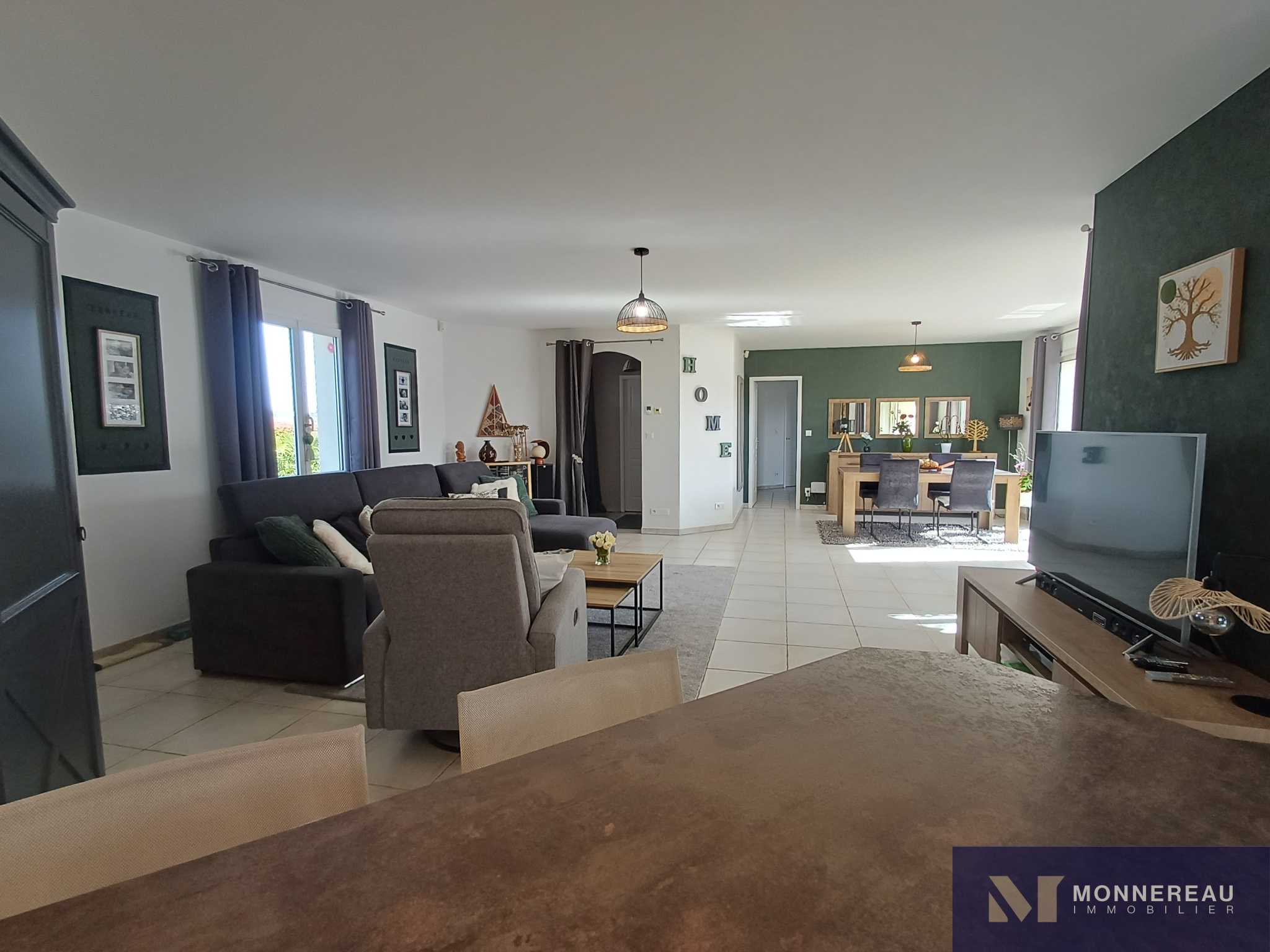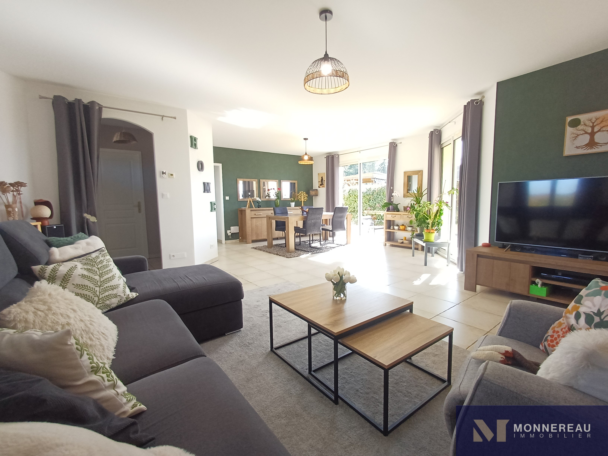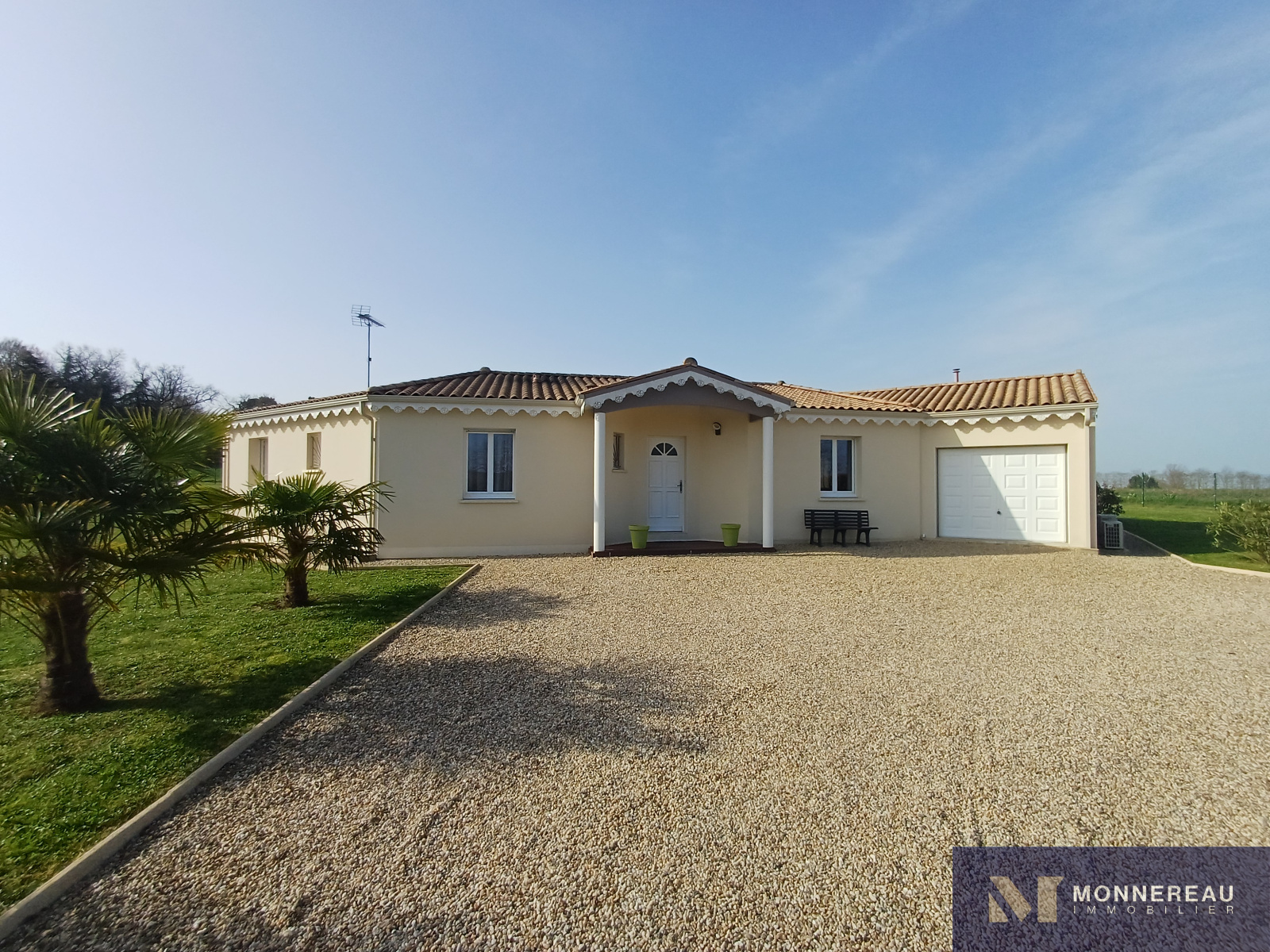 Maison individuelle construite en 2011, développant environ 115 m² habitables de plain-pied, édifiée sur un terrain clos de 2 800 m². Elle en parfait état : entrée, agréable séjour lumineux avec cuisine équipée ouverte, cellier/buanderie, trois chambres dont une suite parentale avec salle d’eau, une seconde salle d’eau et un WC.