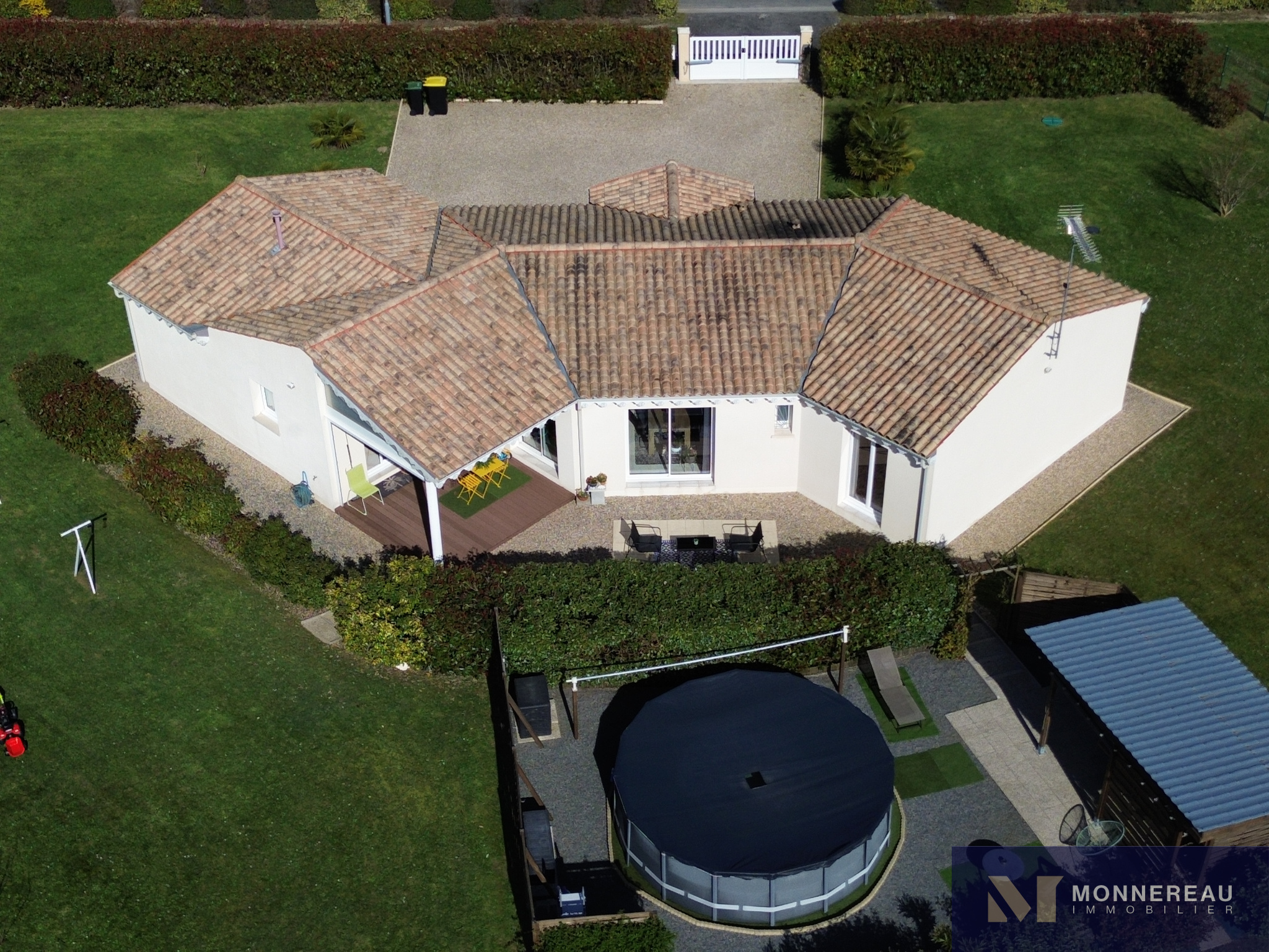 À l’extérieur, vous profiterez d’une terrasse couverte intimiste, d’une piscine hors sol et d’un abri de jardin. Un garage attenant carrelé et isolé complète l’ensemble.
