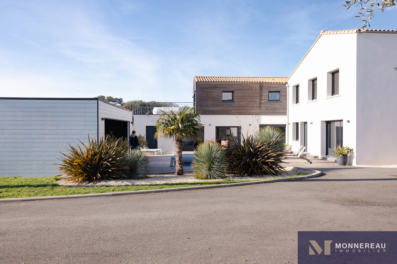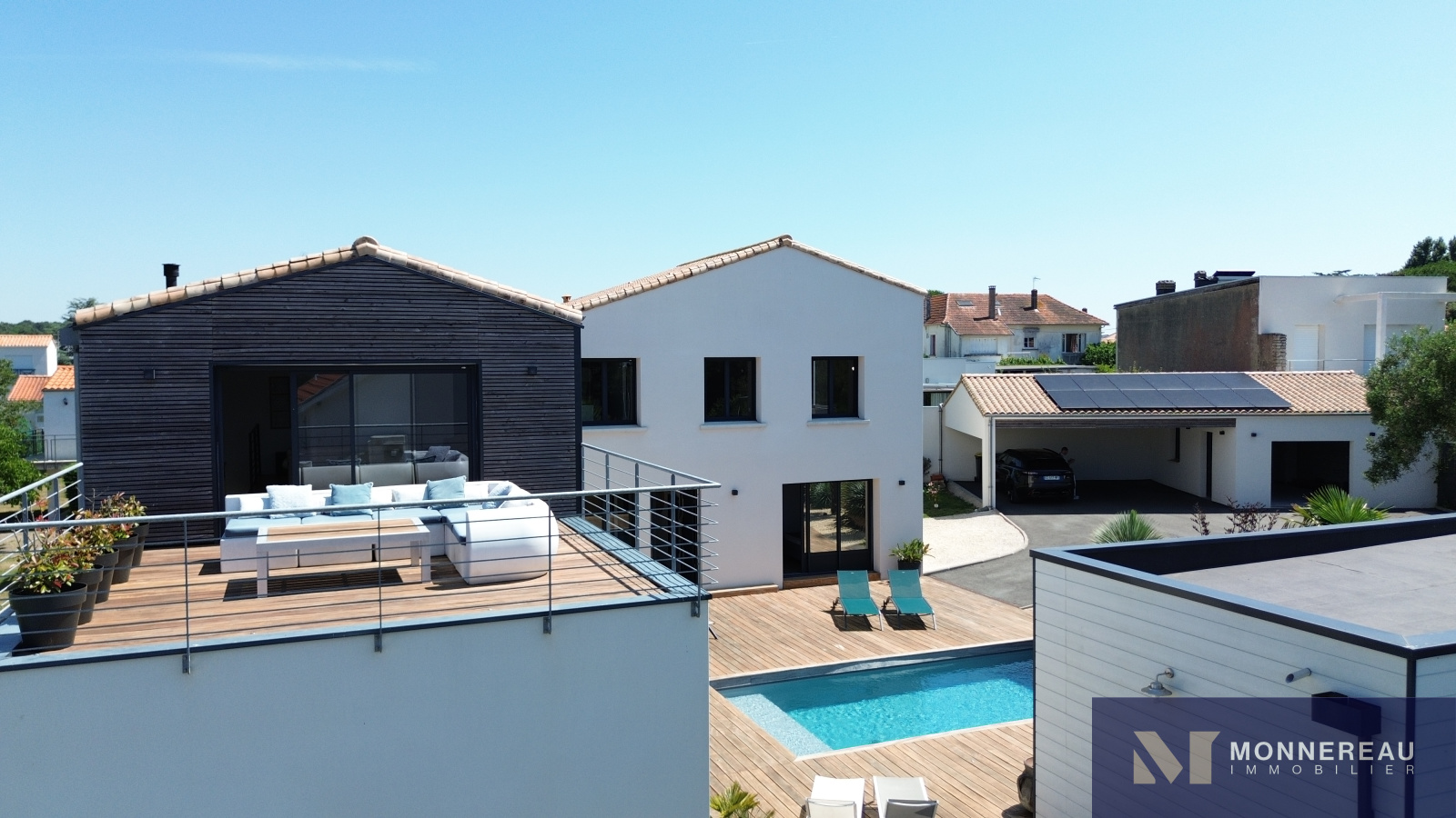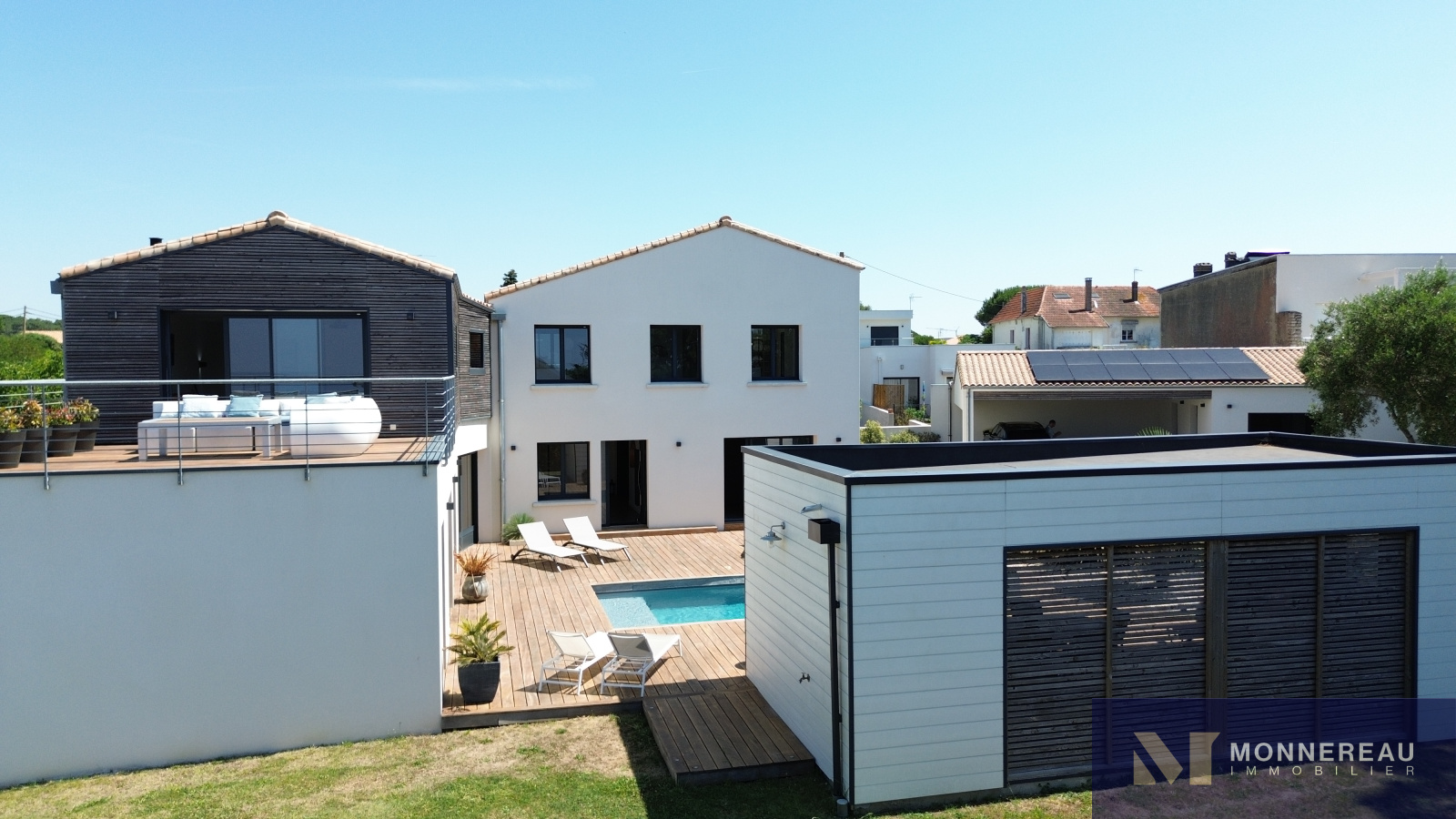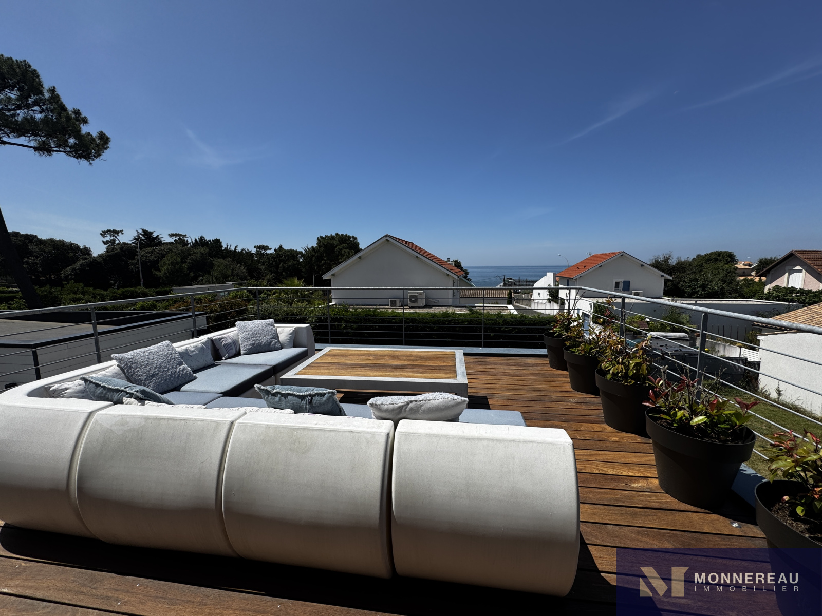 SAINT-PALAIS-SUR-MER (17) - Cette villa édifiée sur un terrain clos de 1589 m² avec dépendances profite d'une situation exceptionnelle. Elle a fait l'objet d'un grand soin. C'est une maison ancienne, en pierre, qui a été transformée et agrandie très récemment. De franche inspiration Californienne, la bâtisse et le pool-house entoure la piscine et la terrasse en cumaru. Il y régne une atmosphère reposante dès plus agréable. Un toit terrasse prolonge le salon de l'étage. En position dominante, le panorama avec vue sur l'océan y est vraiment remarquable. Ce cadre est priviligié ! Vaste séjour avec cuisine ouverte et cave climatisée derrière une verrière en métal du plus bel effet. Quatre chambres dont deux suites très agréables et intimes. Garage et carport au bout de l'allée goudronnée. Meublée et entièrement équipée ! Elle est belle et en parfait état !