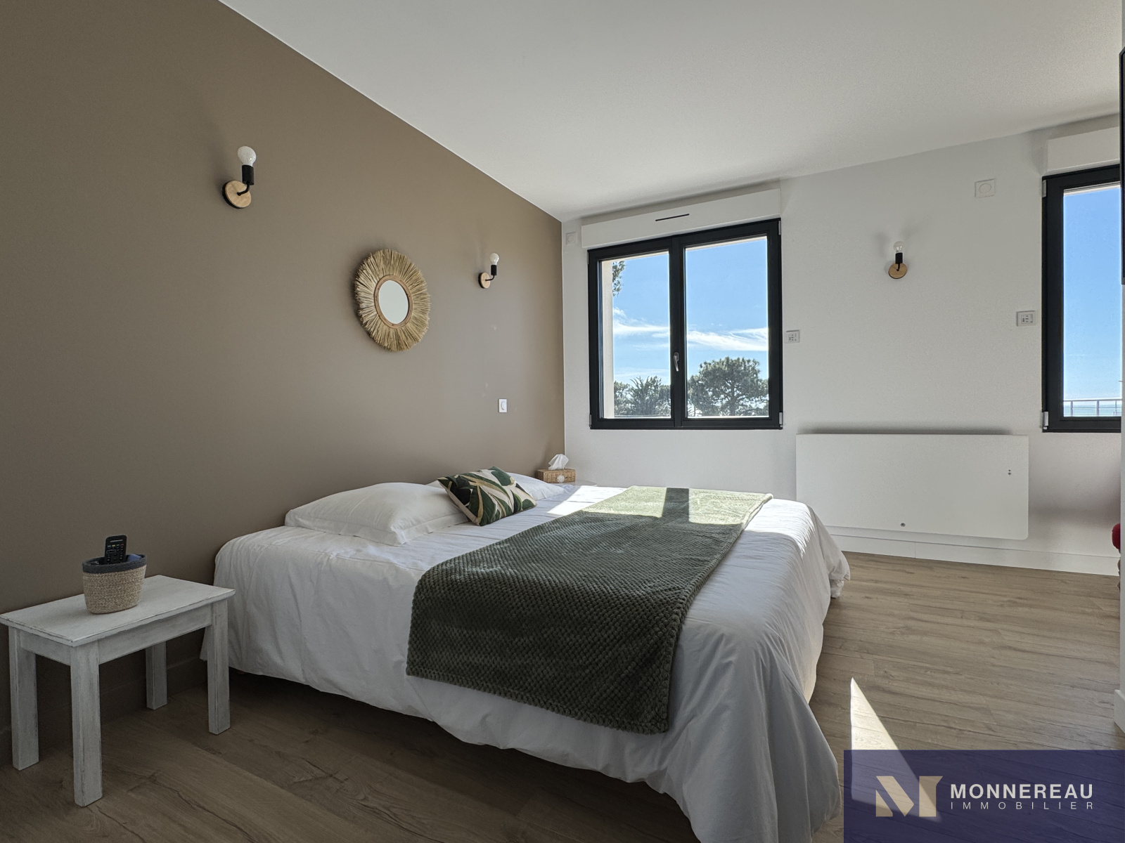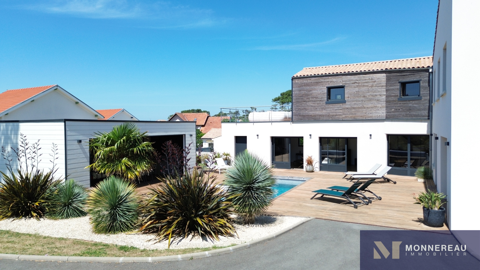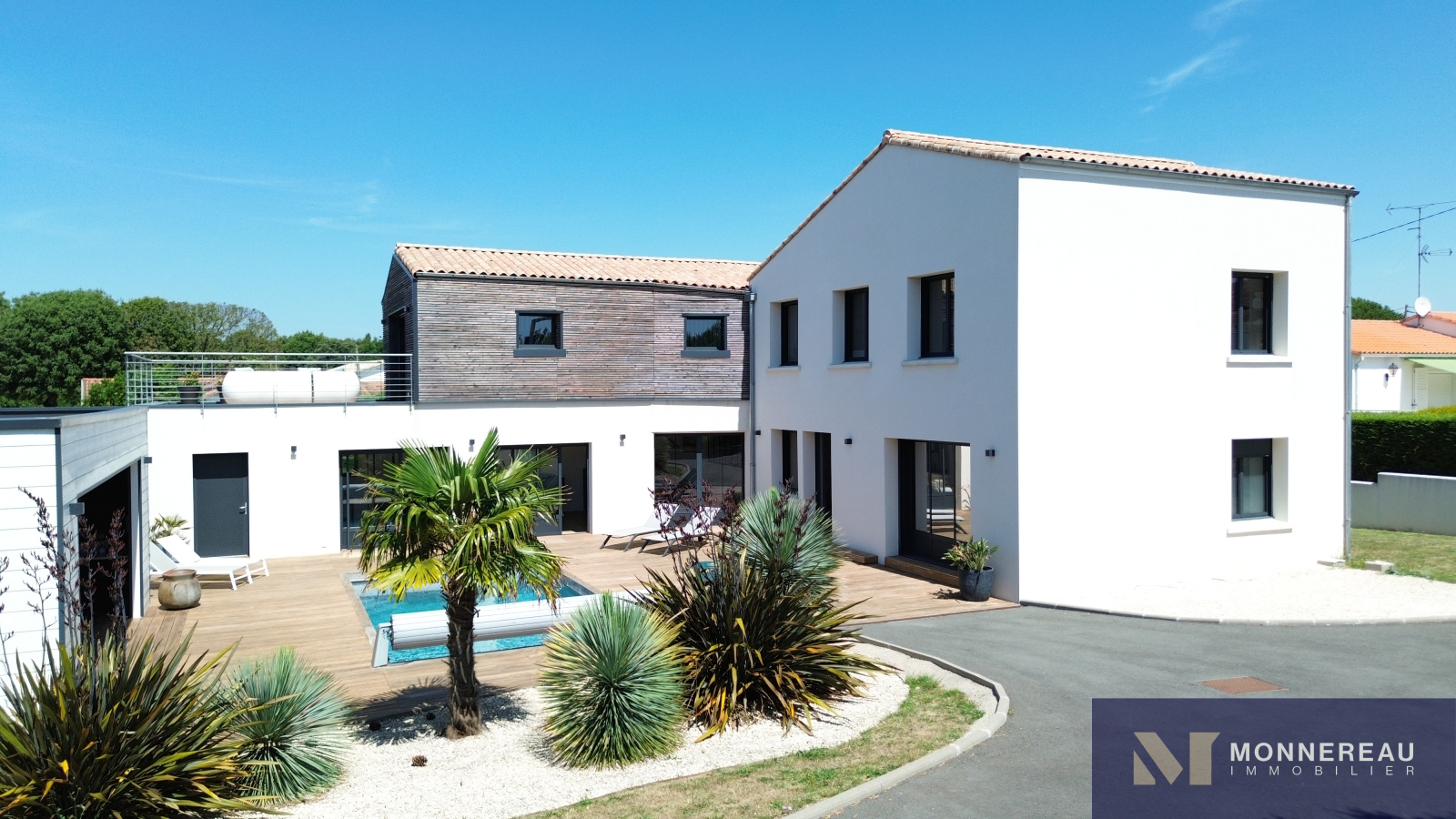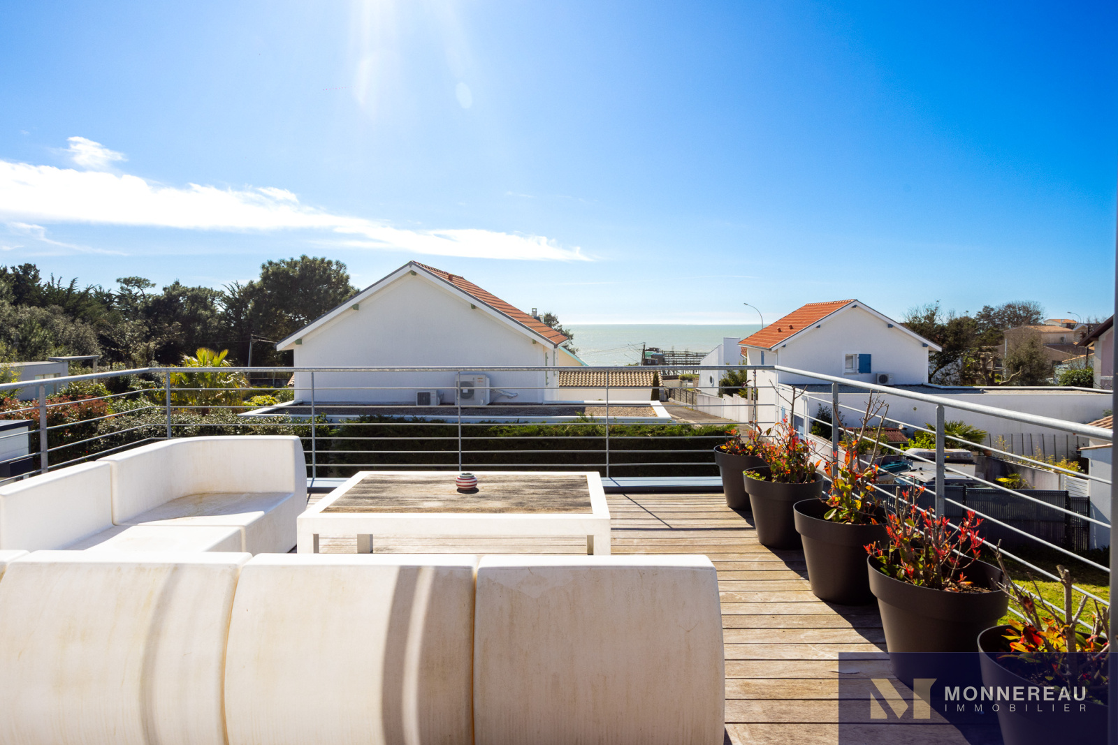 SAINT-PALAIS-SUR-MER (17) - Cette villa édifiée sur un terrain clos de 1589 m² avec dépendances profite d'une situation exceptionnelle. Elle a fait l'objet d'un grand soin. C'est une maison ancienne, en pierre, qui a été transformée et agrandie très récemment. De franche inspiration Californienne, la bâtisse et le pool-house entoure la piscine et la terrasse en cumaru. Il y régne une atmosphère reposante dès plus agréable. Un toit terrasse prolonge le salon de l'étage. En position dominante, le panorama avec vue sur l'océan y est vraiment remarquable. Ce cadre est priviligié ! Vaste séjour avec cuisine ouverte et cave climatisée derrière une verrière en métal du plus bel effet. Quatre chambres dont deux suites très agréables et intimes. Garage et carport au bout de l'allée goudronnée. Meublée et entièrement équipée ! Elle est belle et en parfait état !
