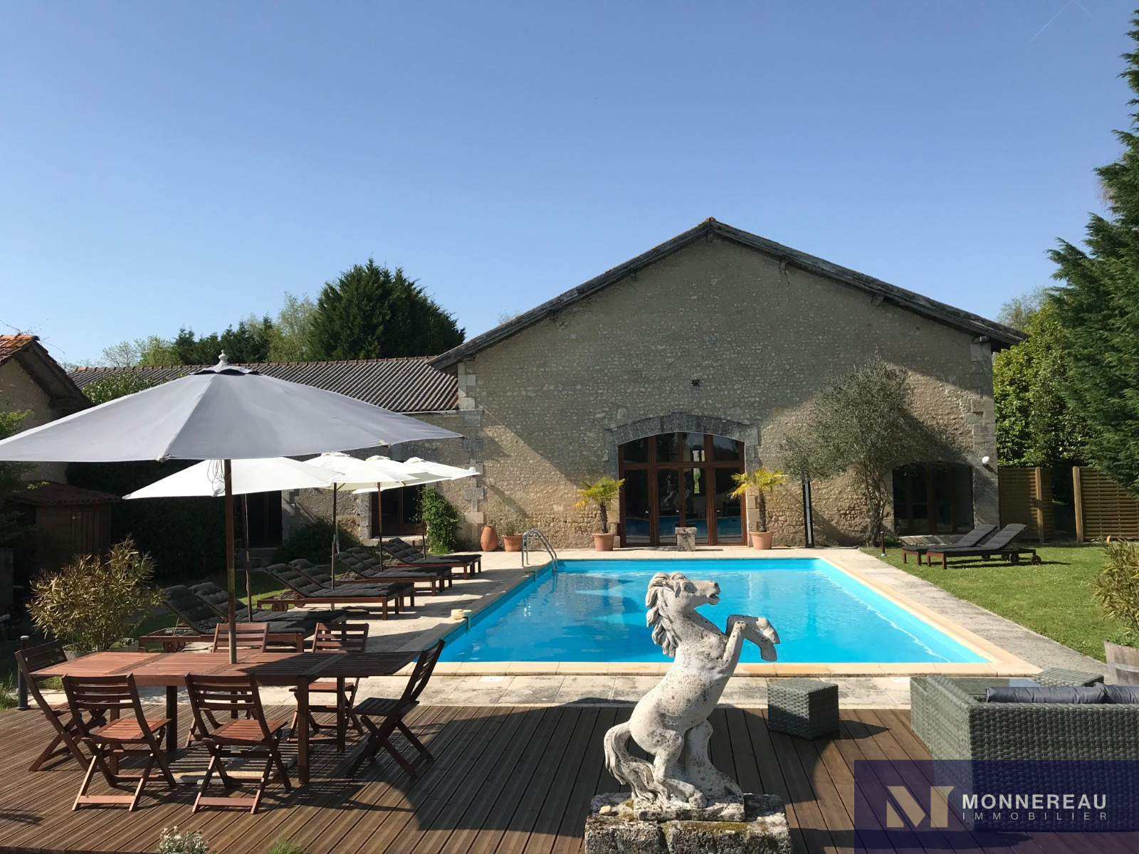 BARBEZIEUX (16) 15 min Sud, entre BORDEAUX et ANGOULEME. Dans un cadre verdoyant et intime avec une vue imprenable sur la vallée. Cette authentique propriété charentaise du XVIème est le parfait écrin pour une maison de famille ou pour une activité liée au bien être et à la réception. Elle se compose de 3 espaces distincts développant 695m² habitables, sur un terrain de 1.6 hectares. La maison de maître, très élégante, a conservé tout son caractère : salle à manger, 3 salons, cuisine, 3 chambres en suite, 2 autres chambres. Une grange attenante de 220m² est utilisée en pièce de réception. La grange est comme à son origine, rustique, idéal pour les festivités. Un premier gîte d'environ 180m² hab est très confortable : cuisine / salle à manger, salon et deux grandes chambres. Le second gîte d'environ 175m² offre une partie studio indépendante (36m²) : salon, salle à manger et 3 chambres dont deux doubles. La capacité totale d'accueil est de 30 couchages. Enfin, s'ajoute un espace détente / sport / réception abrité par deux belles granges jumelées de 195 m² et 90 m². Elles sont aménagées, fonctionnelles avec sanitaires et sauna face à la piscine. Un ensemble harmonieux qui invite au repos au coeur de la Charente. Quel charme ...