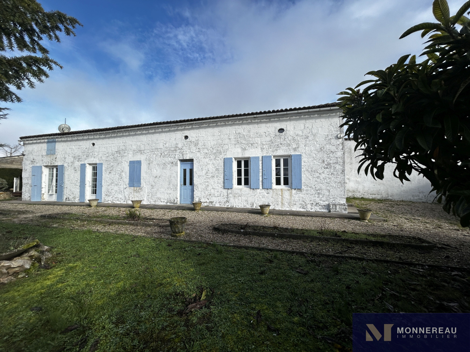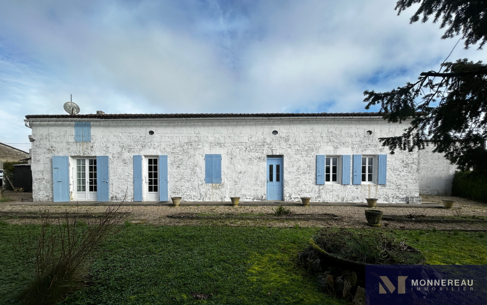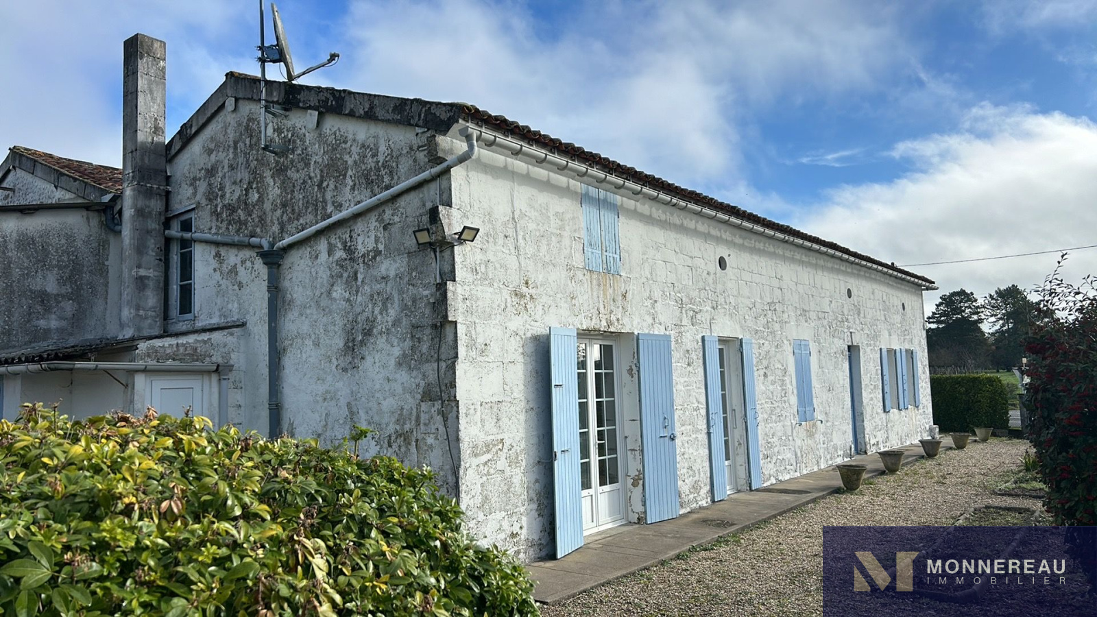ARTHENAC (17) - Entre ARCHIAC et JONZAC - Longère saintongeaise de 128 m² habitables de plain-pied édifiée sur un terrain clos et arboré d'environ 1700 m². Il y a des travaux à prévoir, il faut également repenser la distribution pour exploiter tout son potentiel. Cuisine, salon, salle à manger avec cheminée, trois chambres, salle d'eau et arrière cuisine. Chauffage central au fuel. Assainissement à créer. Menuiserie PVC. Puits. Barbecue couvert. Sur l'arrière, ancien atelier de menuiserie de 150 m² au sol ainsi qu'un garage idéal pour camping car. Charme indéniable de la pierre. Gros-oeuvre sain. Nuisance de bordure de route. Exclusivité !